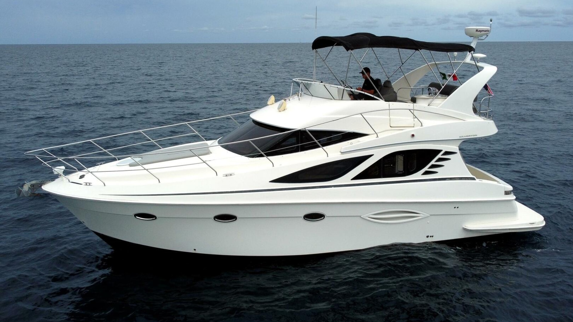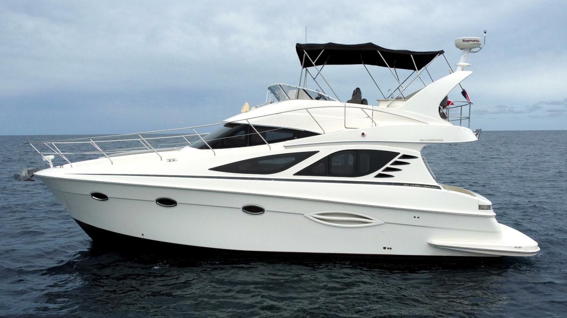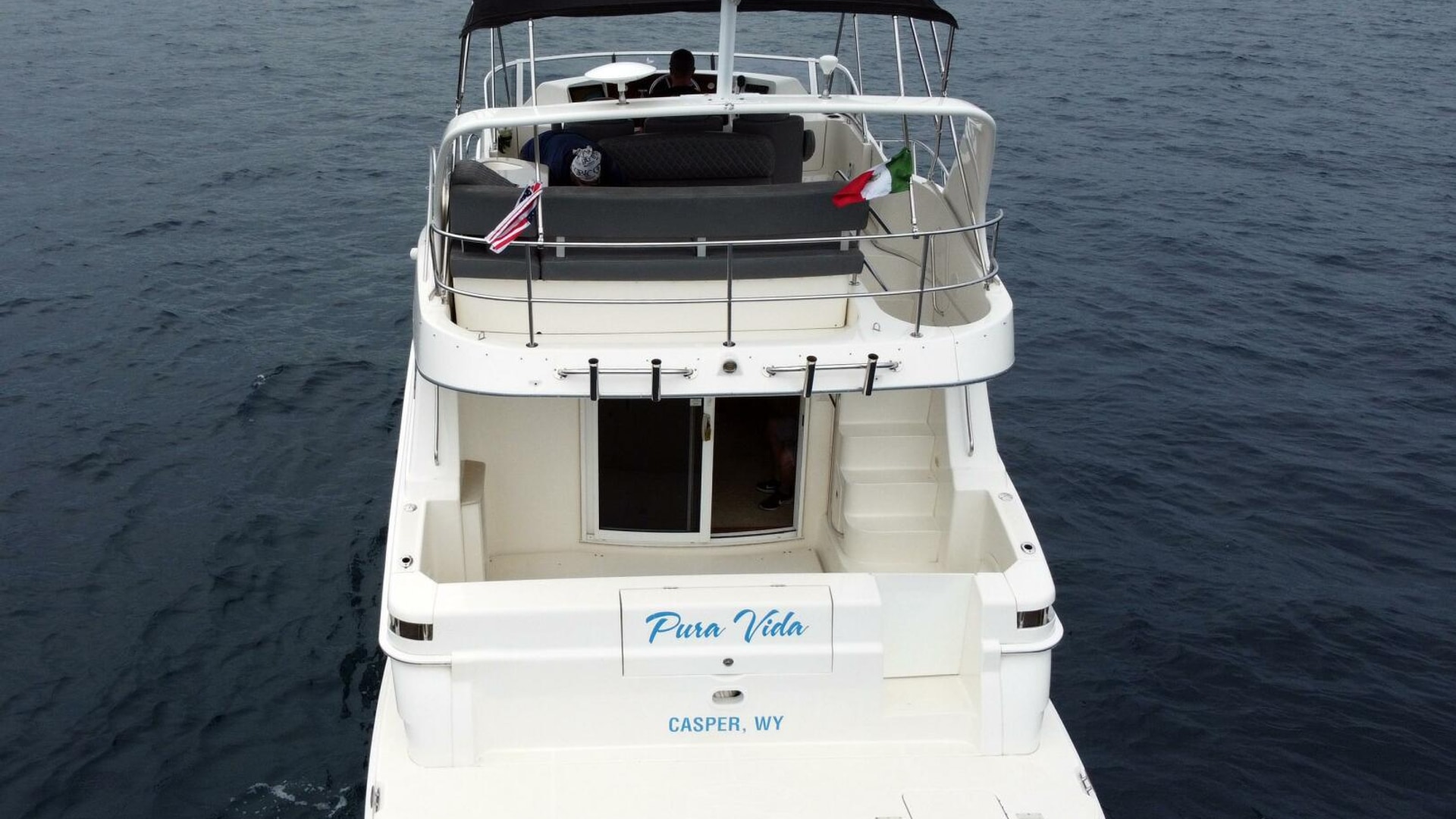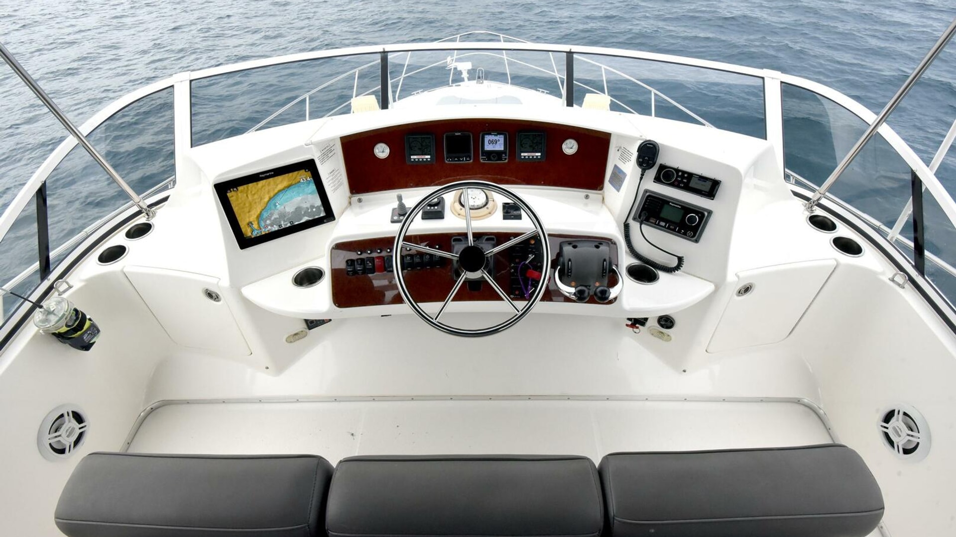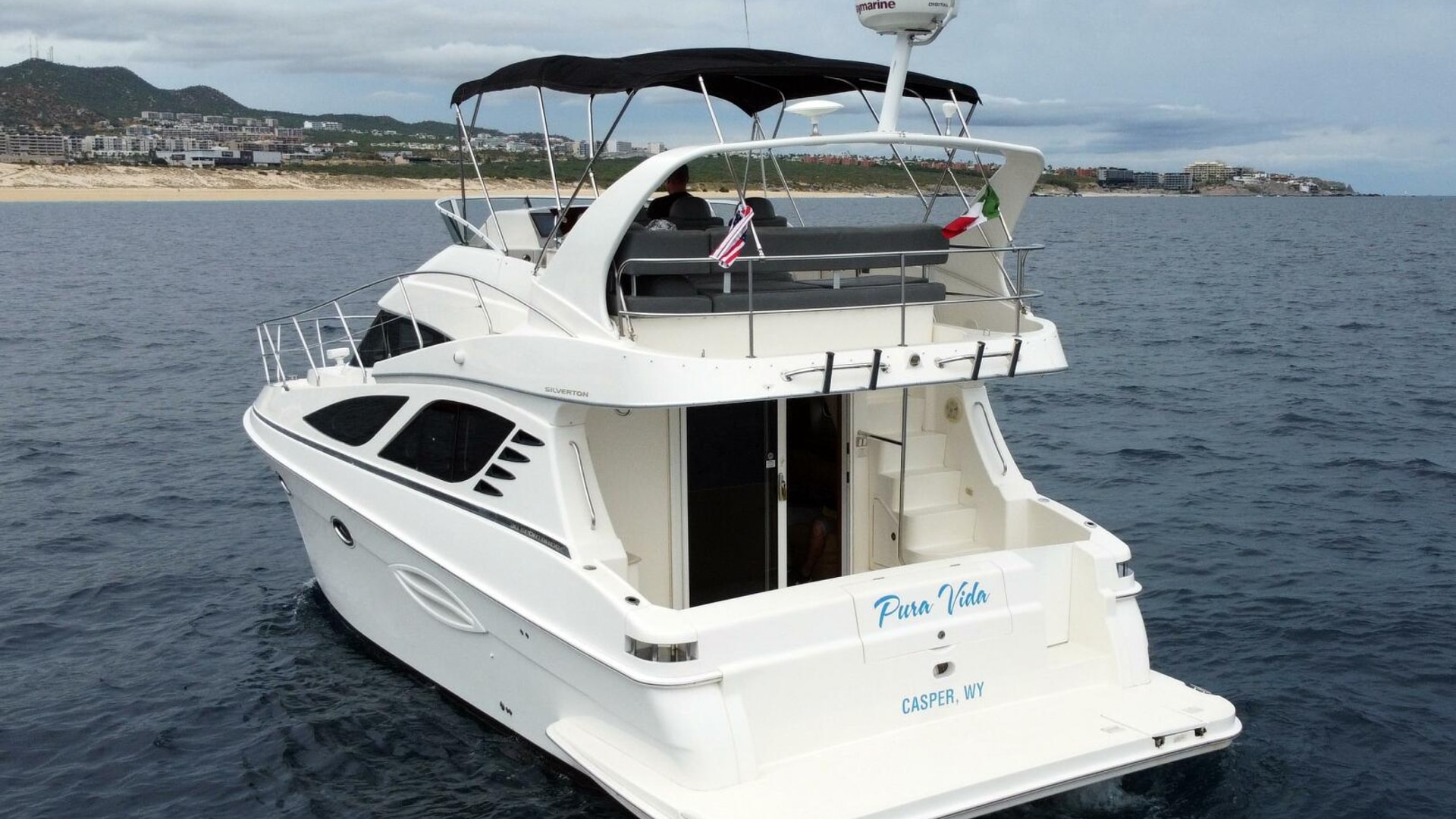 Powered for reliable cruising and equipped with a bow thruster, PURA VIDA makes docking and close-quarters maneuvering simple and stress-free. Her handling is smooth and responsive, providing a confident and comfortable ride. From the elevated bridge, you’ll enjoy excellent visibility and an open-air helm that enhances the overall cruising experience. Once up on plane, she runs quietly and efficiently, reflecting Silverton’s attention to hull design and engineering.