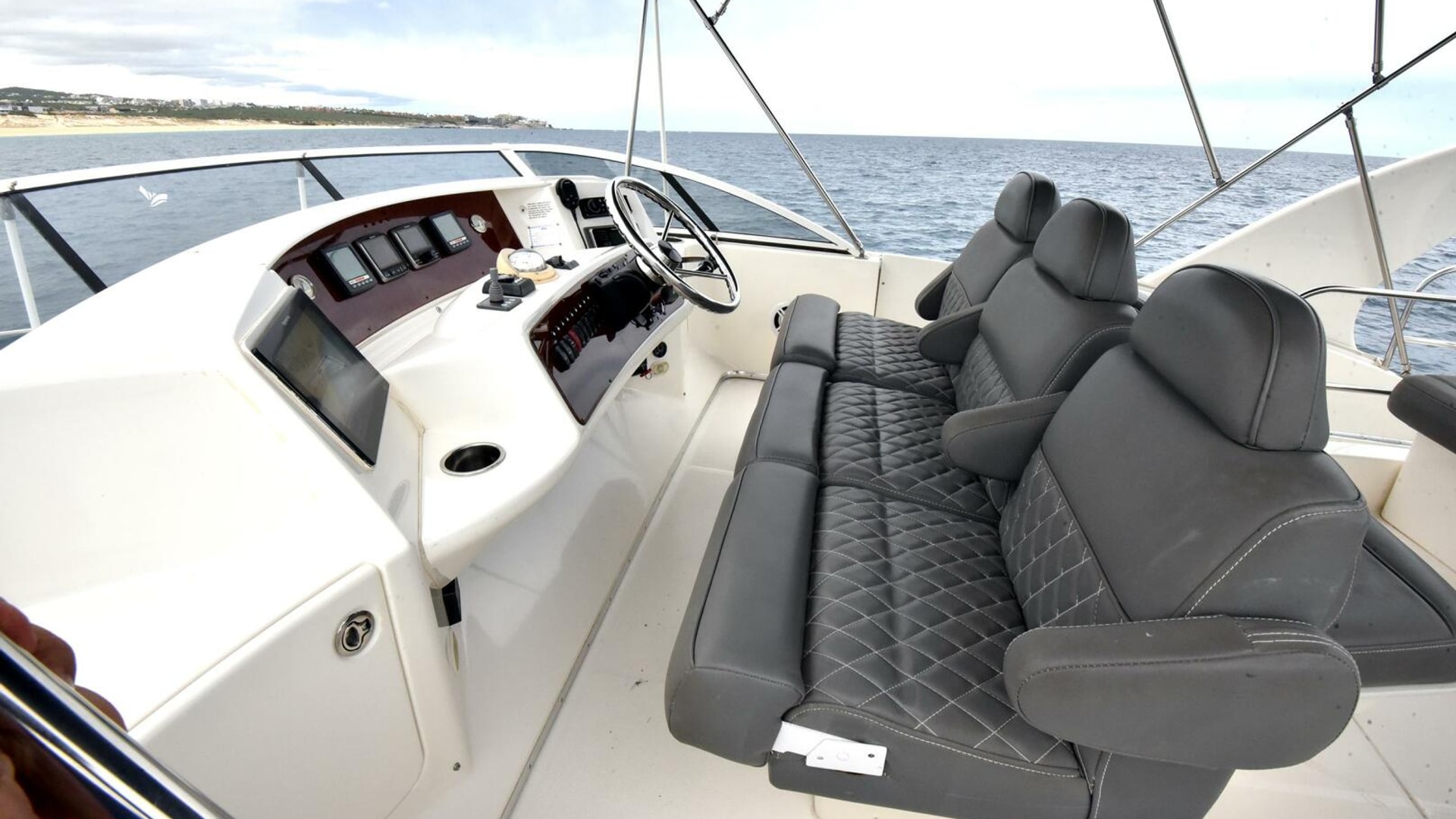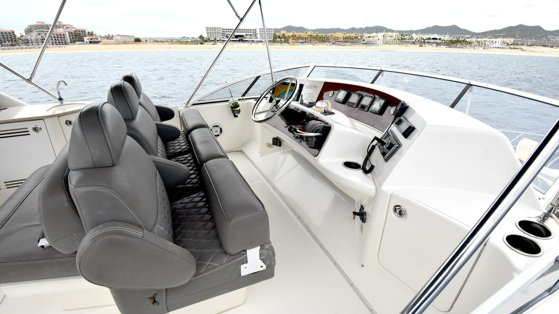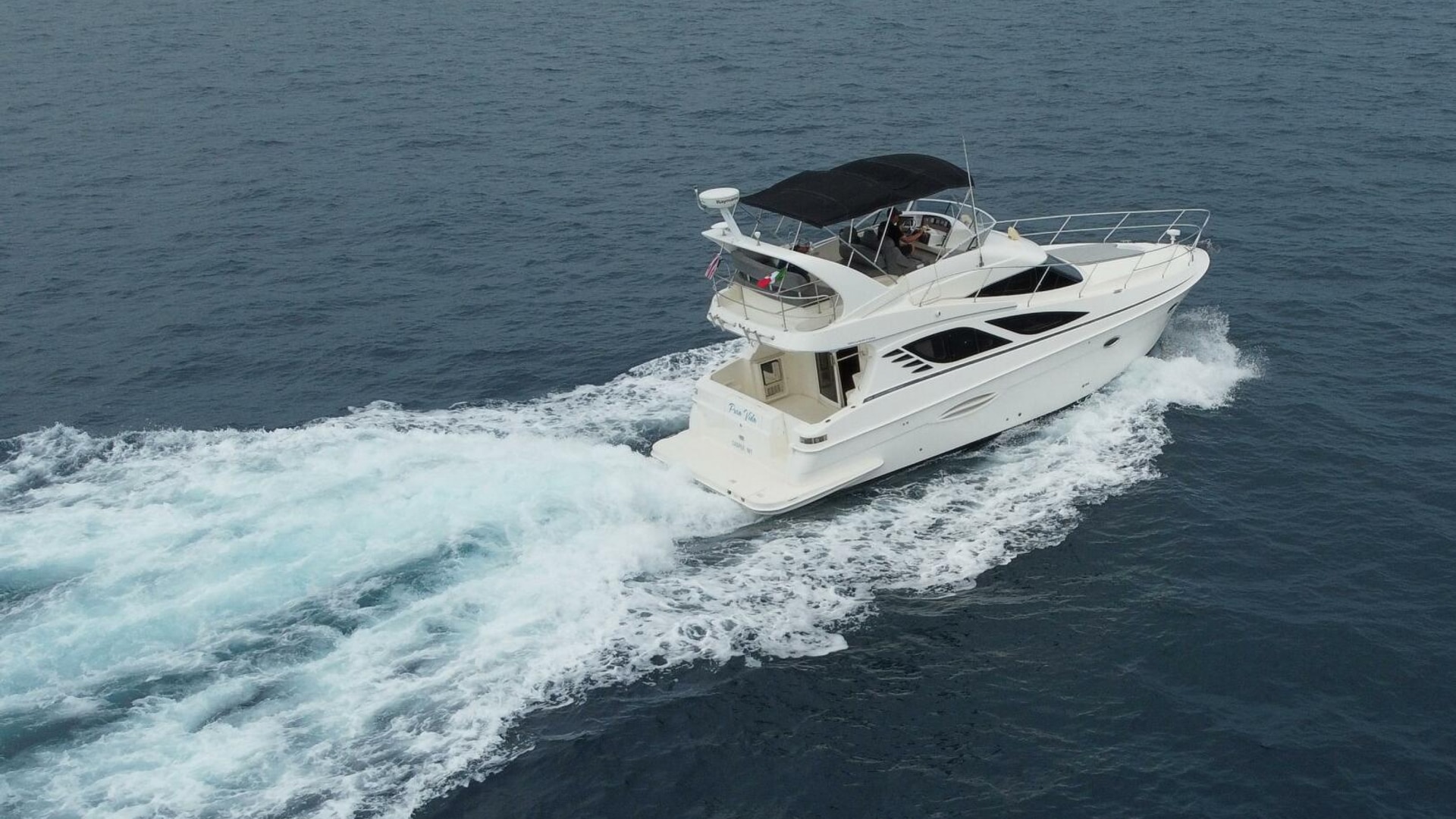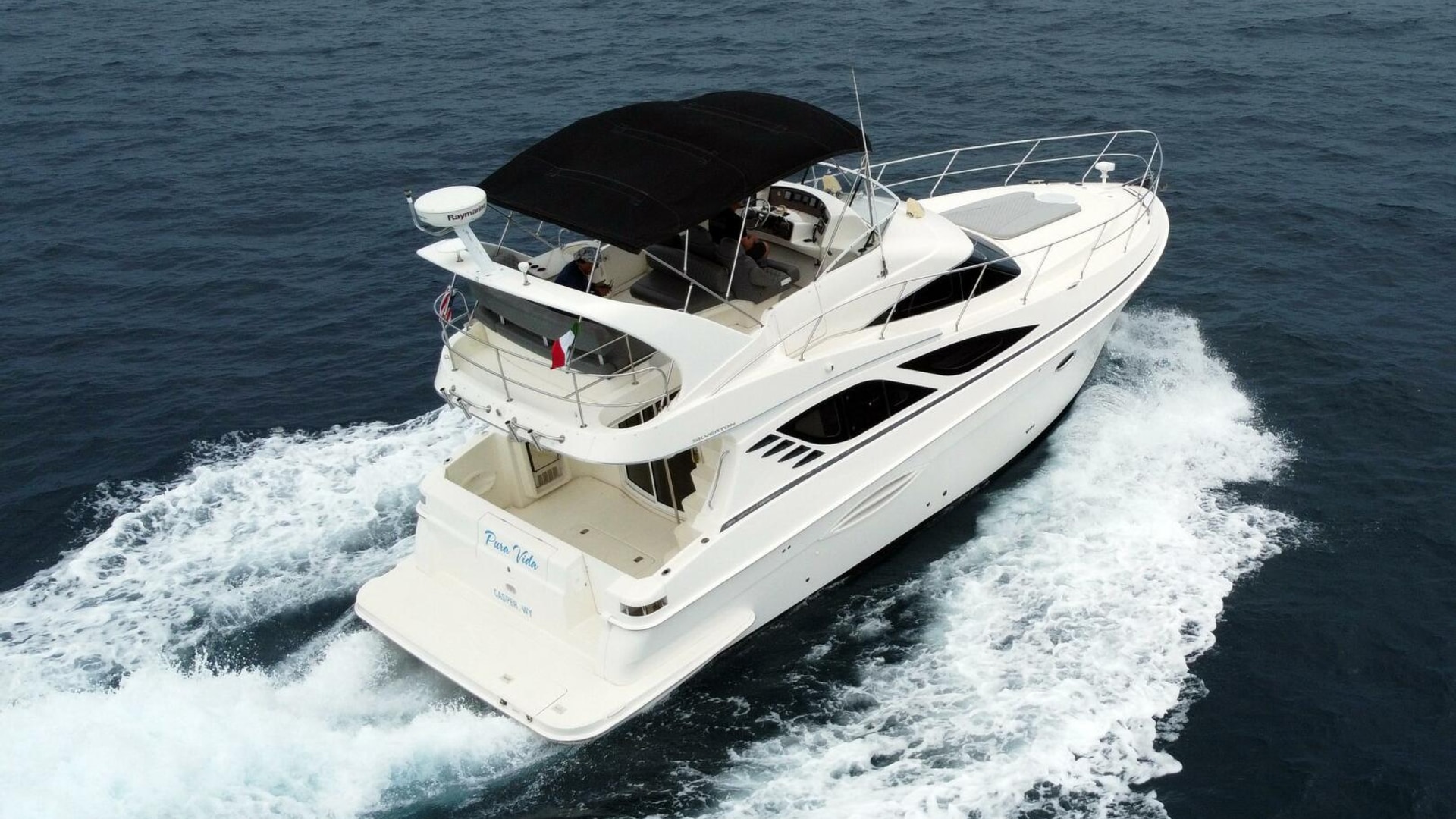 Powered for reliable cruising and equipped with a bow thruster, PURA VIDA makes docking and close-quarters maneuvering simple and stress-free. Her handling is smooth and responsive, providing a confident and comfortable ride. From the elevated bridge, you’ll enjoy excellent visibility and an open-air helm that enhances the overall cruising experience. Once up on plane, she runs quietly and efficiently, reflecting Silverton’s attention to hull design and engineering.