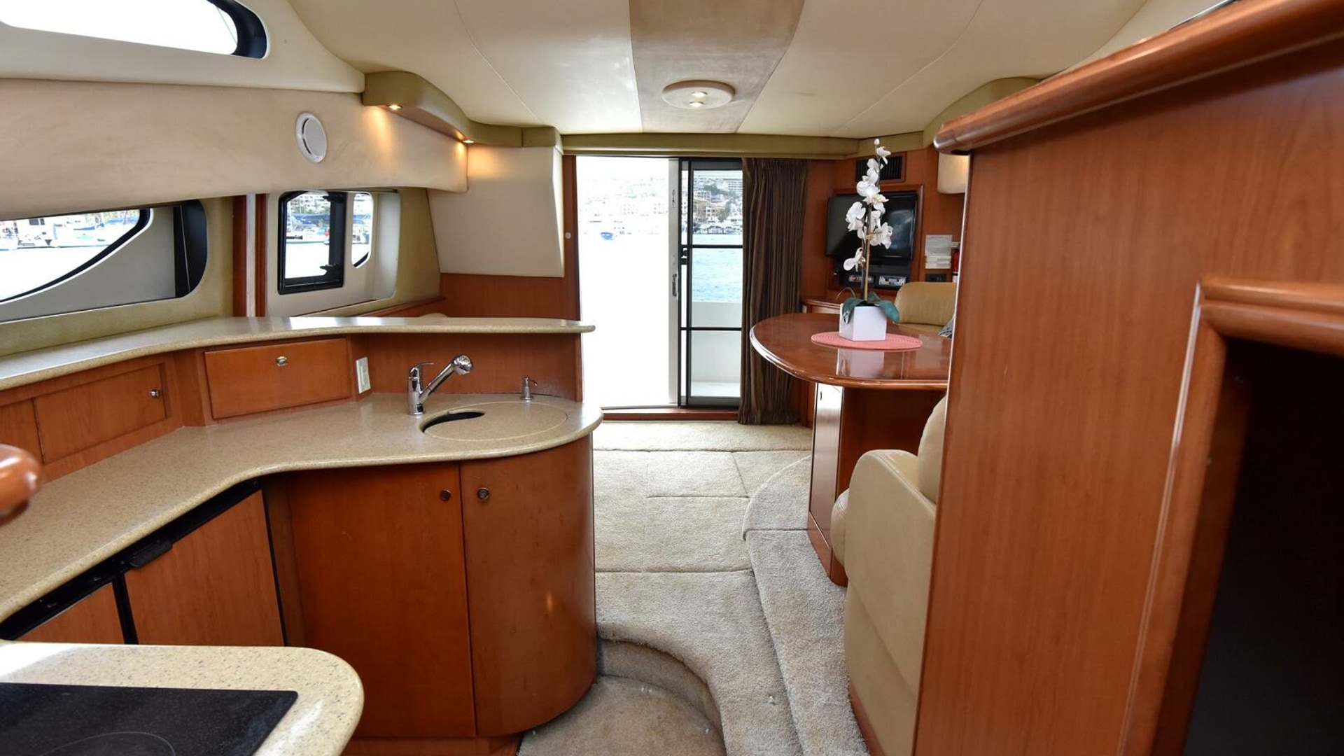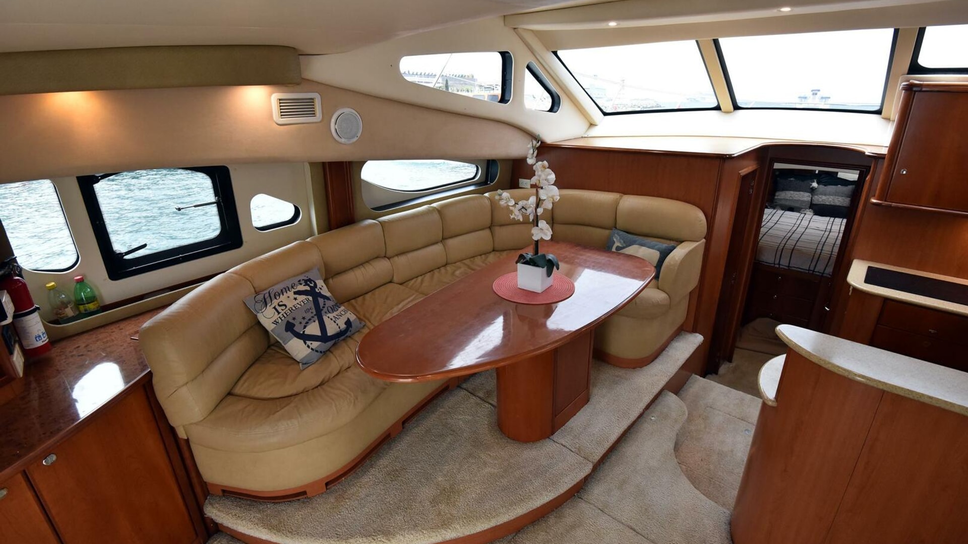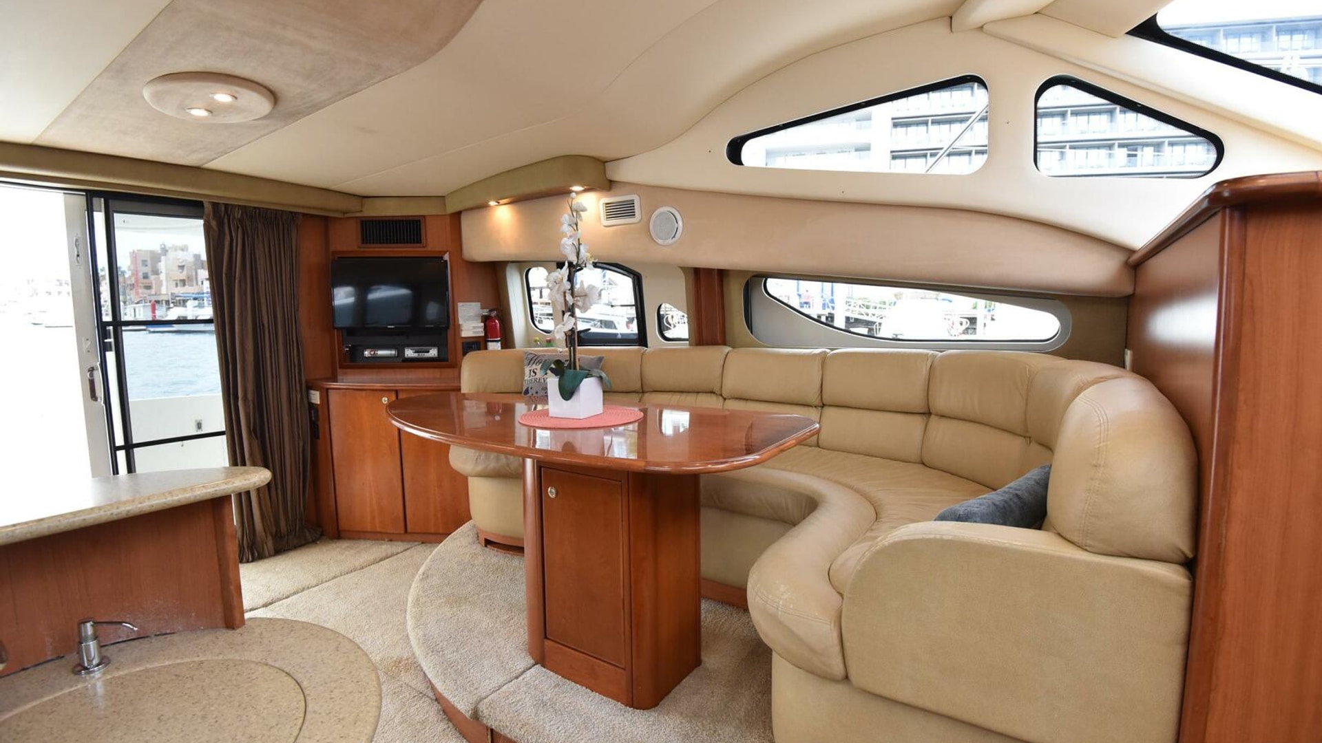 The interior layout is bright, open, and inviting—ideal for extended stays or weekend getaways. The salon features generous seating and large windows that flood the space with natural light. A fully equipped galley provides all the amenities of home, while the private staterooms offer comfort and relaxation after a day on the water.