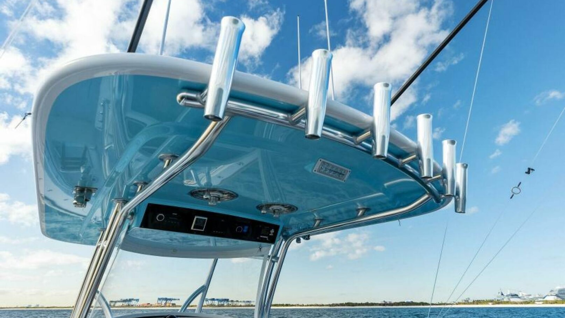 - Fiberglass Hardtop with polished aluminum supports, aft/fwd facing molded in Lumitec mirage spreader lights, (6) rod holders