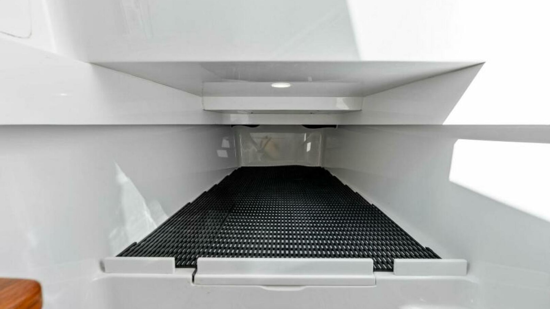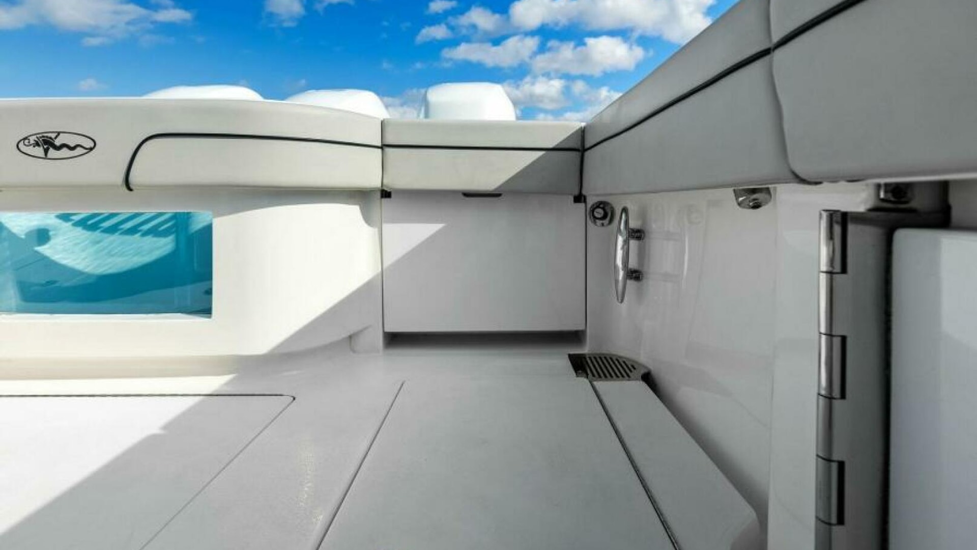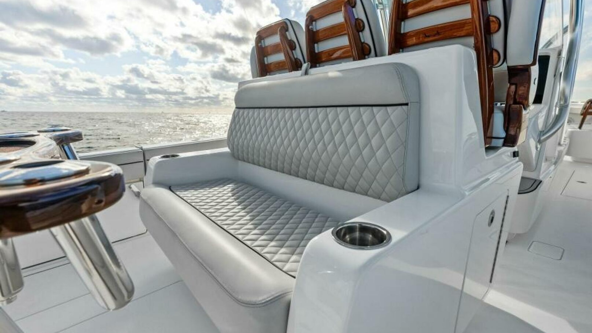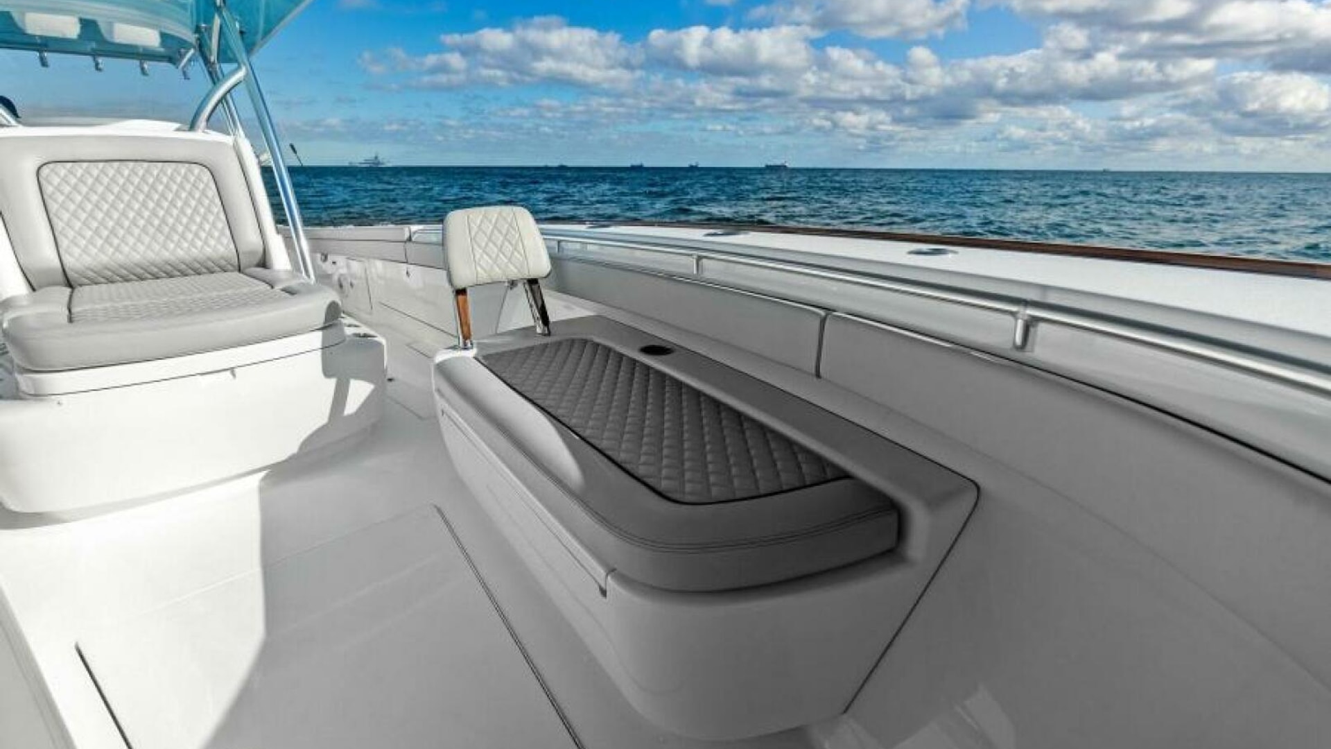 - Helm seating module with aft facing mezz seating, molded in armrests, tackle storage and insulated cooler under seat