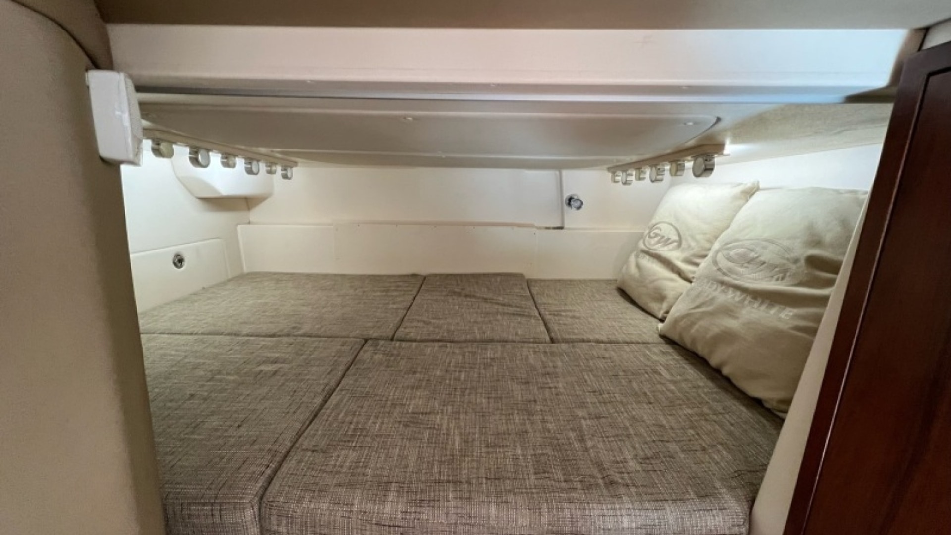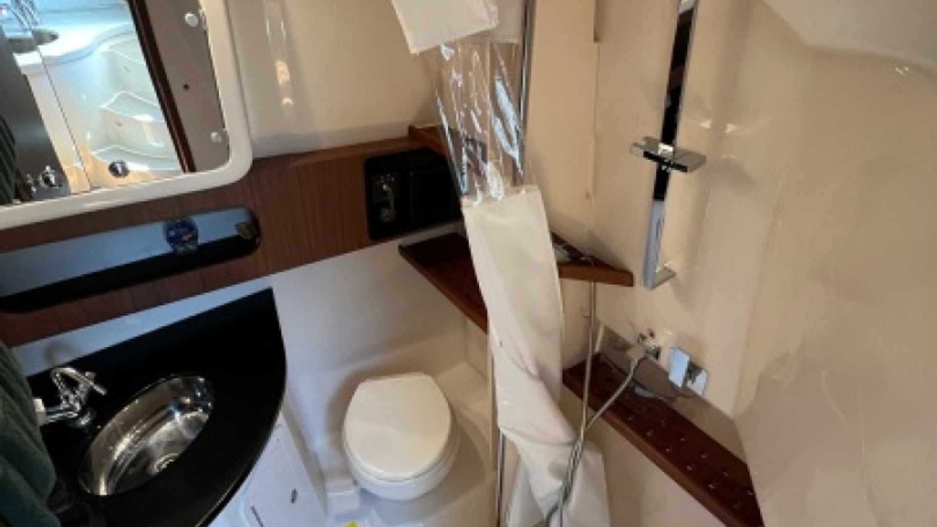 - Head - enclosed ventilated head area w/lighting, sink, Corian® countertop, shower w/teak shelf & grate, mirror, storage cabinet, cherry shelves (2) & VacuFlush® marine head w/freshwater supply, 18-gallon (68 l) holding tank, overboard discharge & deck pump-out
