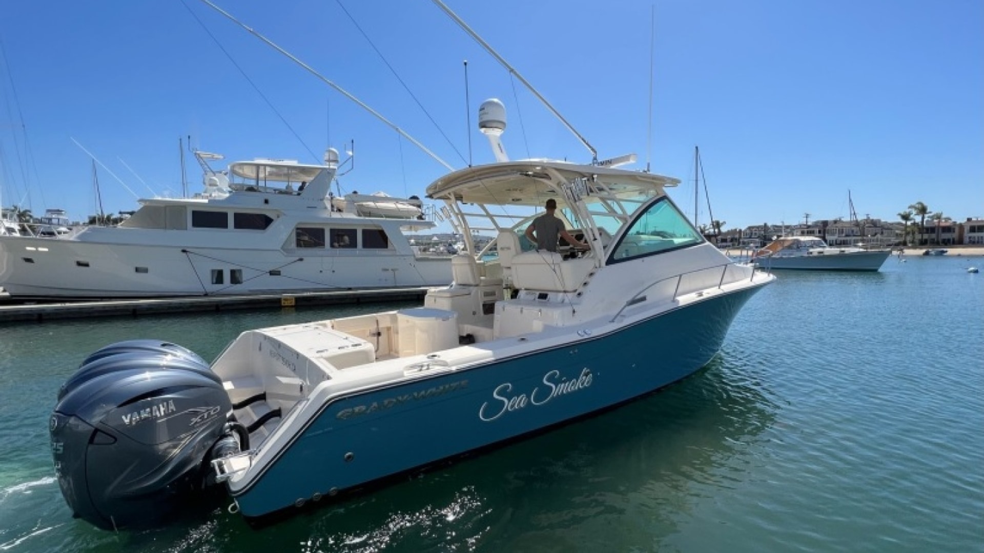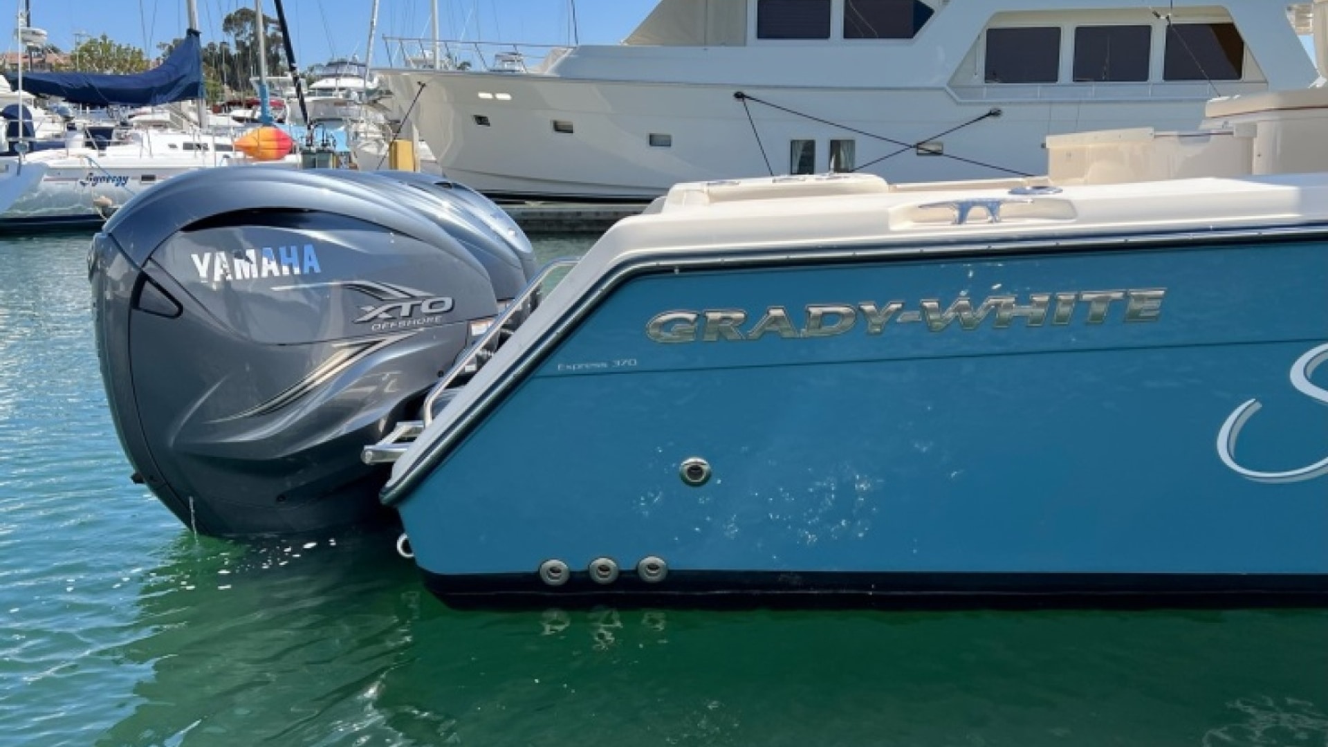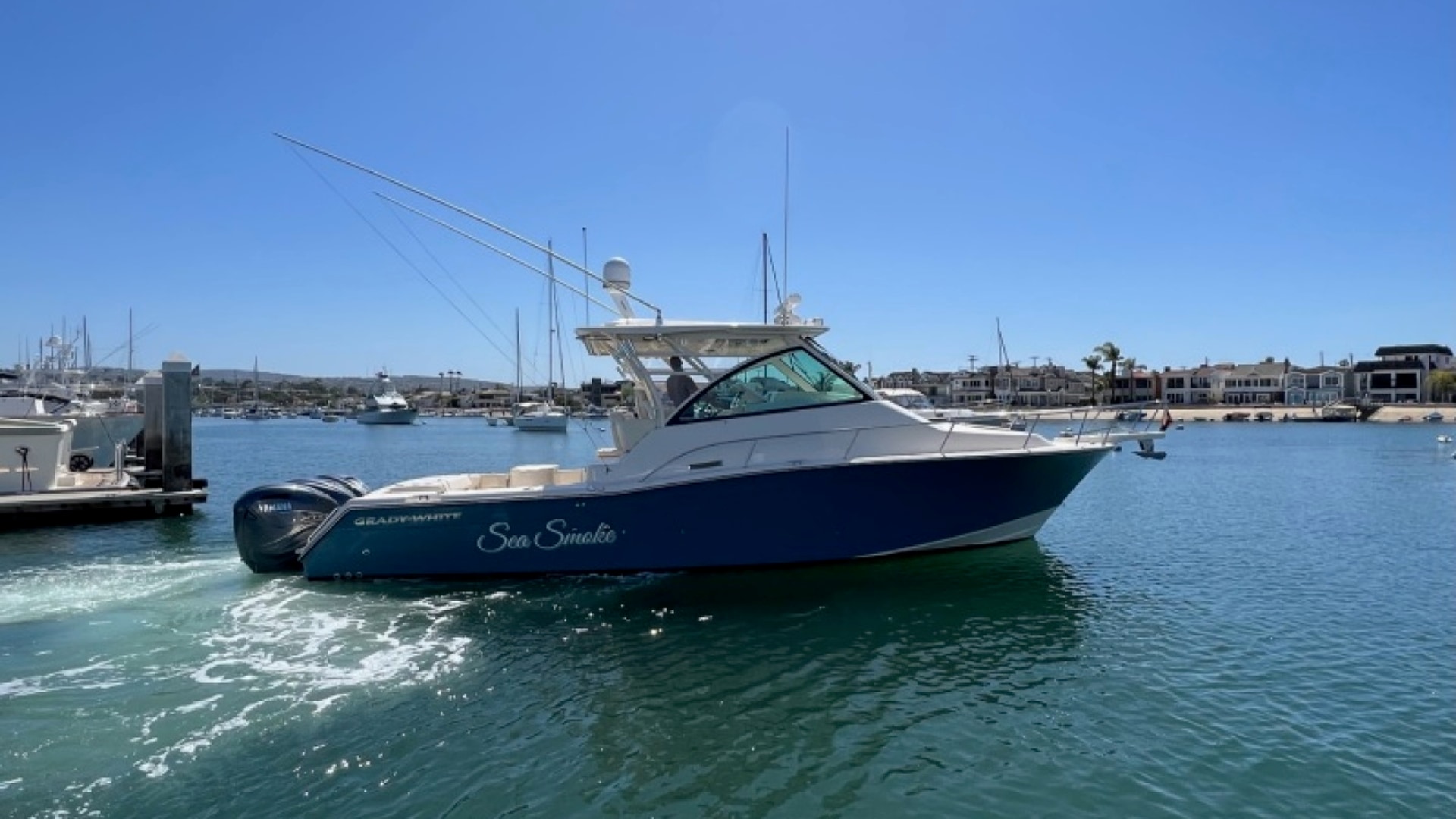 This LLC Owned 2019 Grady-White 370 Express, SEA SMOKE, was delivered as a new boat in 2020. SEA SMOKE was built as one of the most customized Grady Whites ever built. Quite stunning with her custom Blue Hull. This boat was built for the ultimate in cruising comfort as well as being a thoroughly equipped fishing machine complete with a full Garmin electronics package and a Bluewater 75-gallon bait tank. Sea Smoke boasts (3) 425 HP Yamaha Four Stroke motors that currently have only 300 hours. Her Long-Range capabilities were enhanced by adding a custom 70-gallon fuel tank, for a total of 414 gallons. Some of SEA SMOKE's other features include an oversized Seakeeper 6 for the ultimate in stabilization and comfort, a watermaker, and a modified aft berth for sleeping in comfort on those weekend family getaways. SEA SMOKE also has 100' of chain and 200' of line for peace of mind while on the anchor. The Helm Master joystick and bow thruster combination make docking effortless. This boat has been under full cockpit and motor covers since new. It truly is a must-see vessel and due to the owner's change of plans, is available for viewing in Newport Beach, CA.