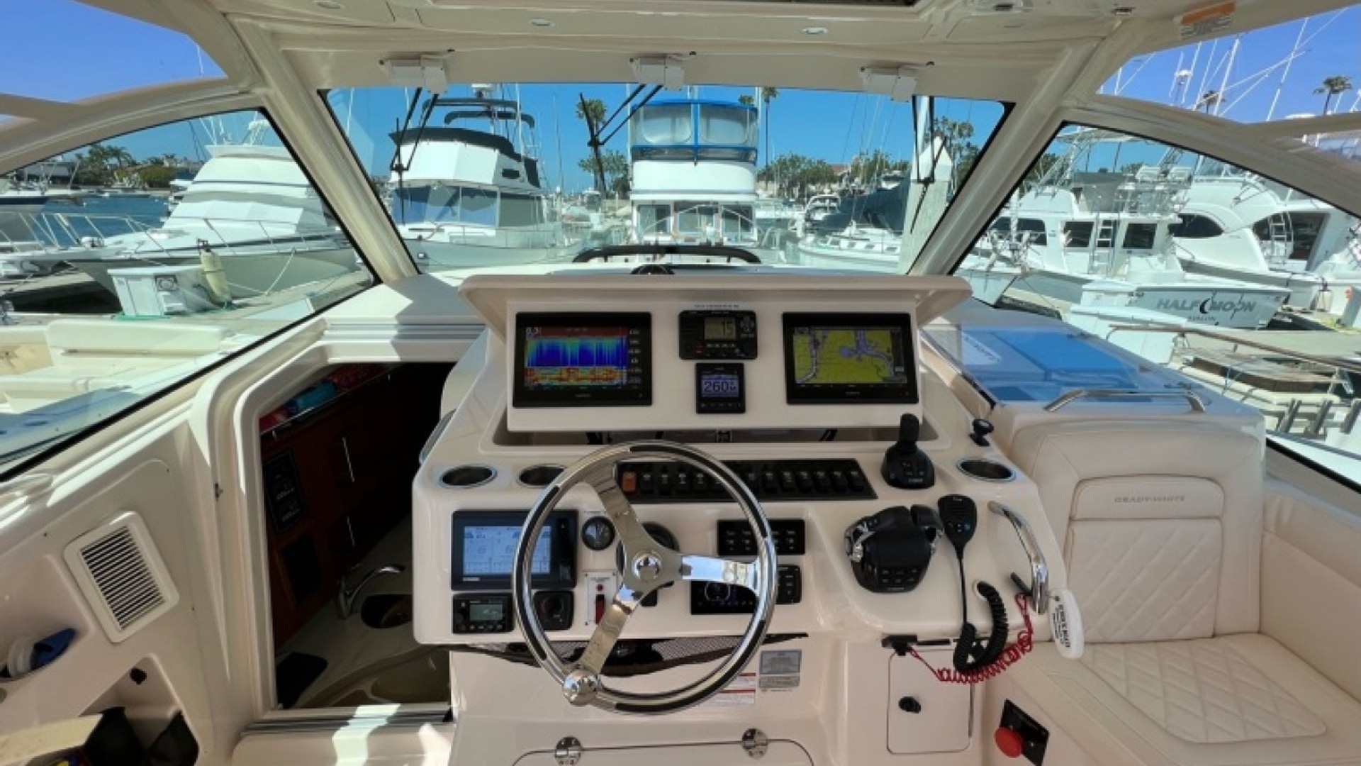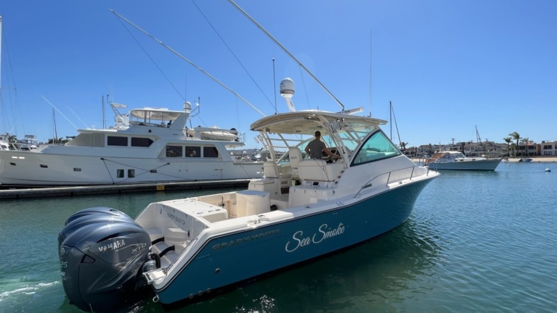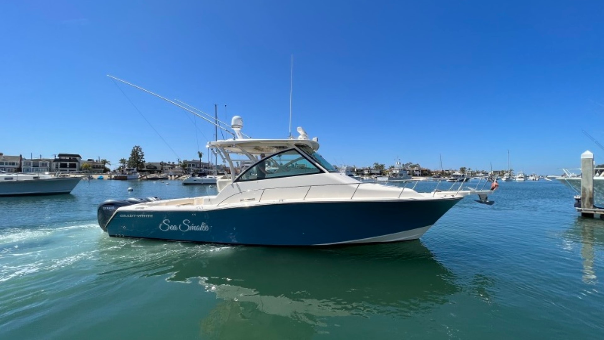 This LLC Owned 2019 Grady-White 370 Express, SEA SMOKE, was delivered as a new boat in 2020. SEA SMOKE was built as one of the most customized Grady Whites ever built. Quite stunning with her custom Blue Hull. This boat was built for the ultimate in cruising comfort as well as being a thoroughly equipped fishing machine complete with a full Garmin electronics package and a Bluewater 75-gallon bait tank. Sea Smoke boasts (3) 425 HP Yamaha Four Stroke motors that currently have only 300 hours. Her Long-Range capabilities were enhanced by adding a custom 70-gallon fuel tank, for a total of 414 gallons. Some of SEA SMOKE's other features include an oversized Seakeeper 6 for the ultimate in stabilization and comfort, a watermaker, and a modified aft berth for sleeping in comfort on those weekend family getaways. SEA SMOKE also has 100' of chain and 200' of line for peace of mind while on the anchor. The Helm Master joystick and bow thruster combination make docking effortless. This boat has been under full cockpit and motor covers since new. It truly is a must-see vessel and due to the owner's change of plans, is available for viewing in Newport Beach, CA.