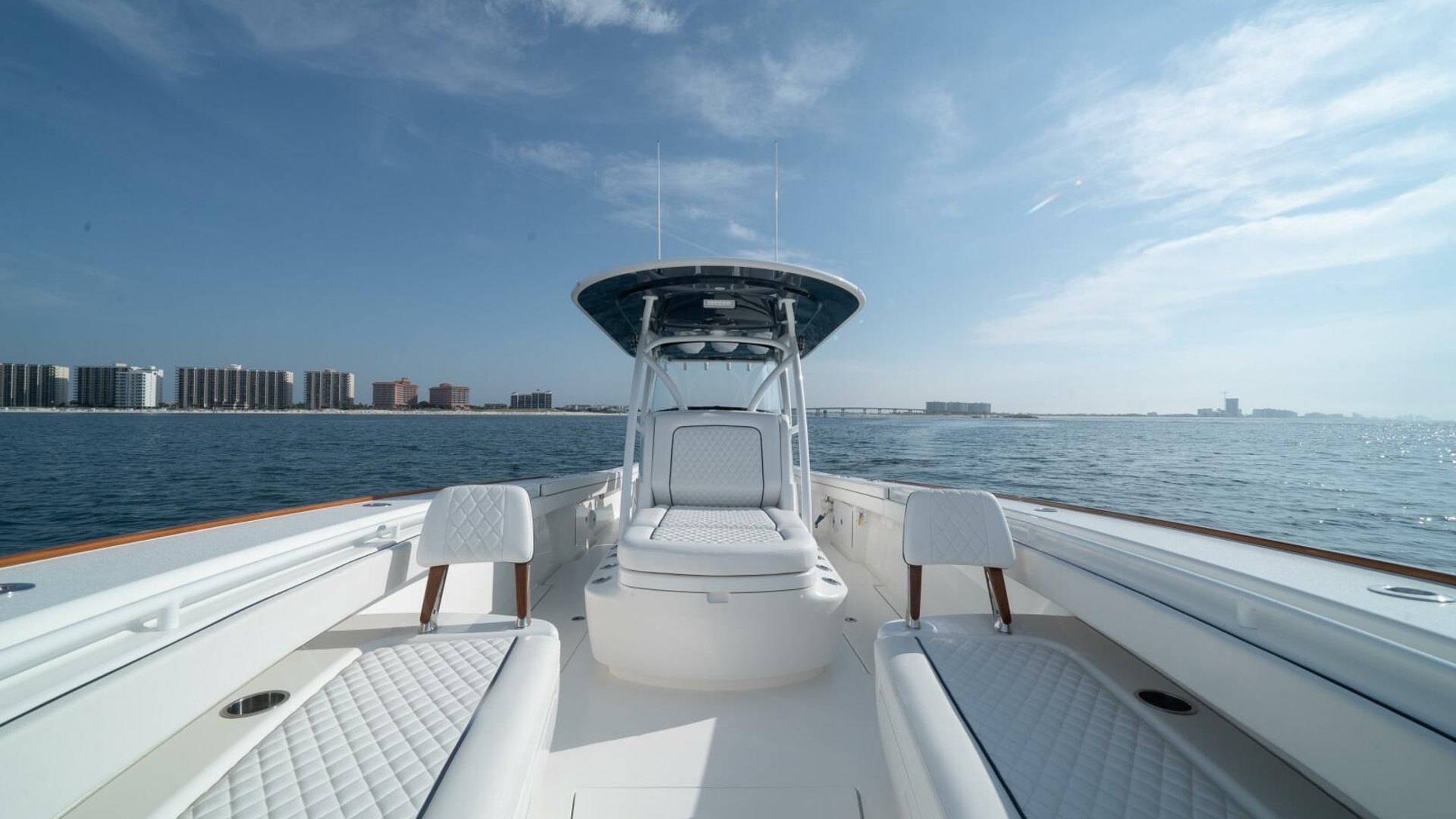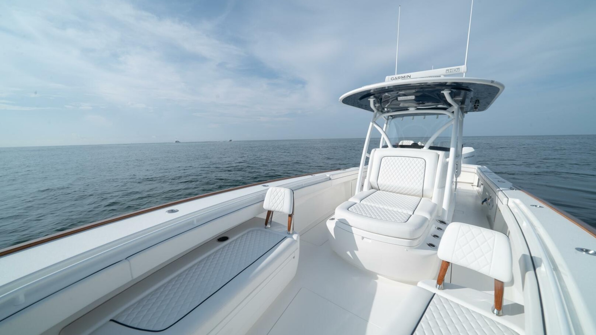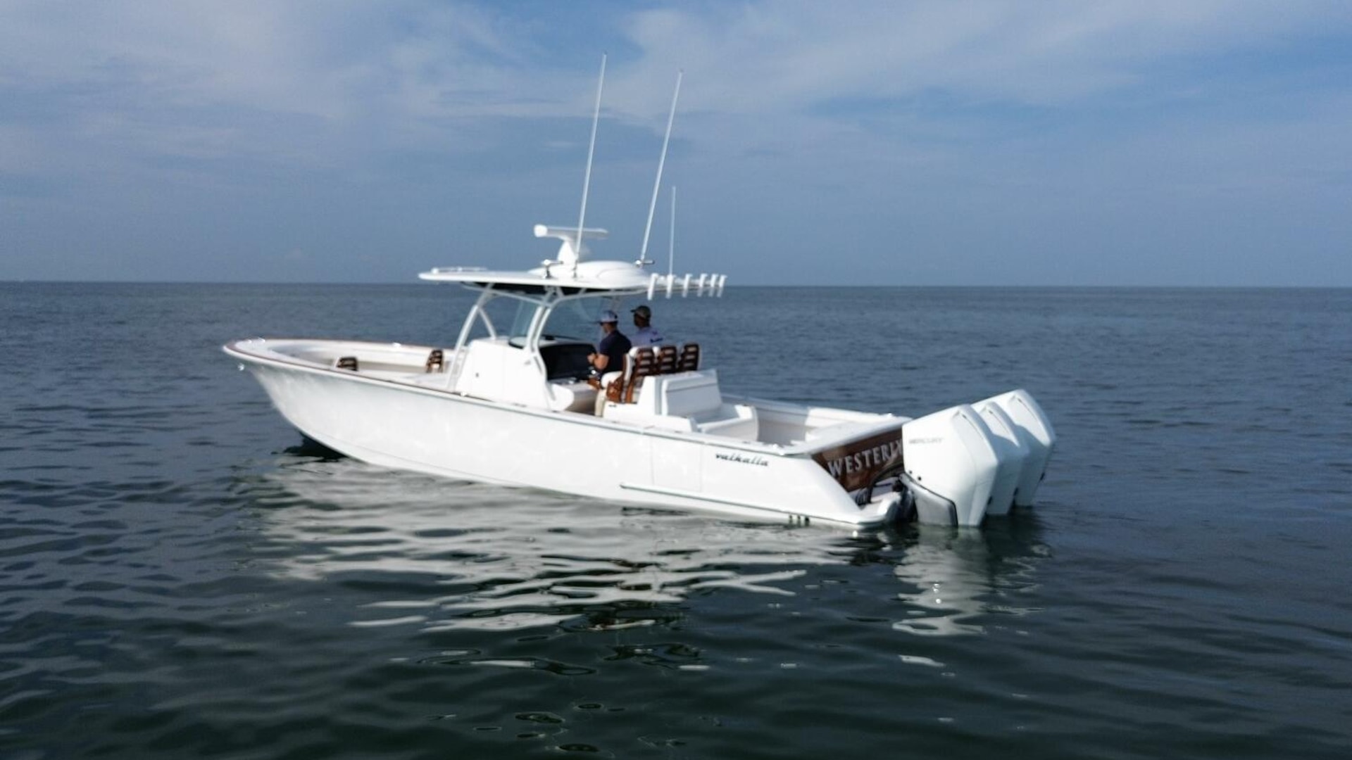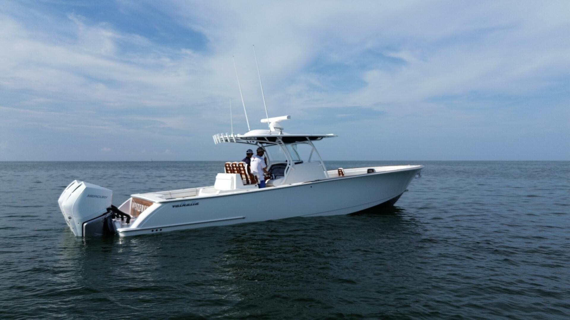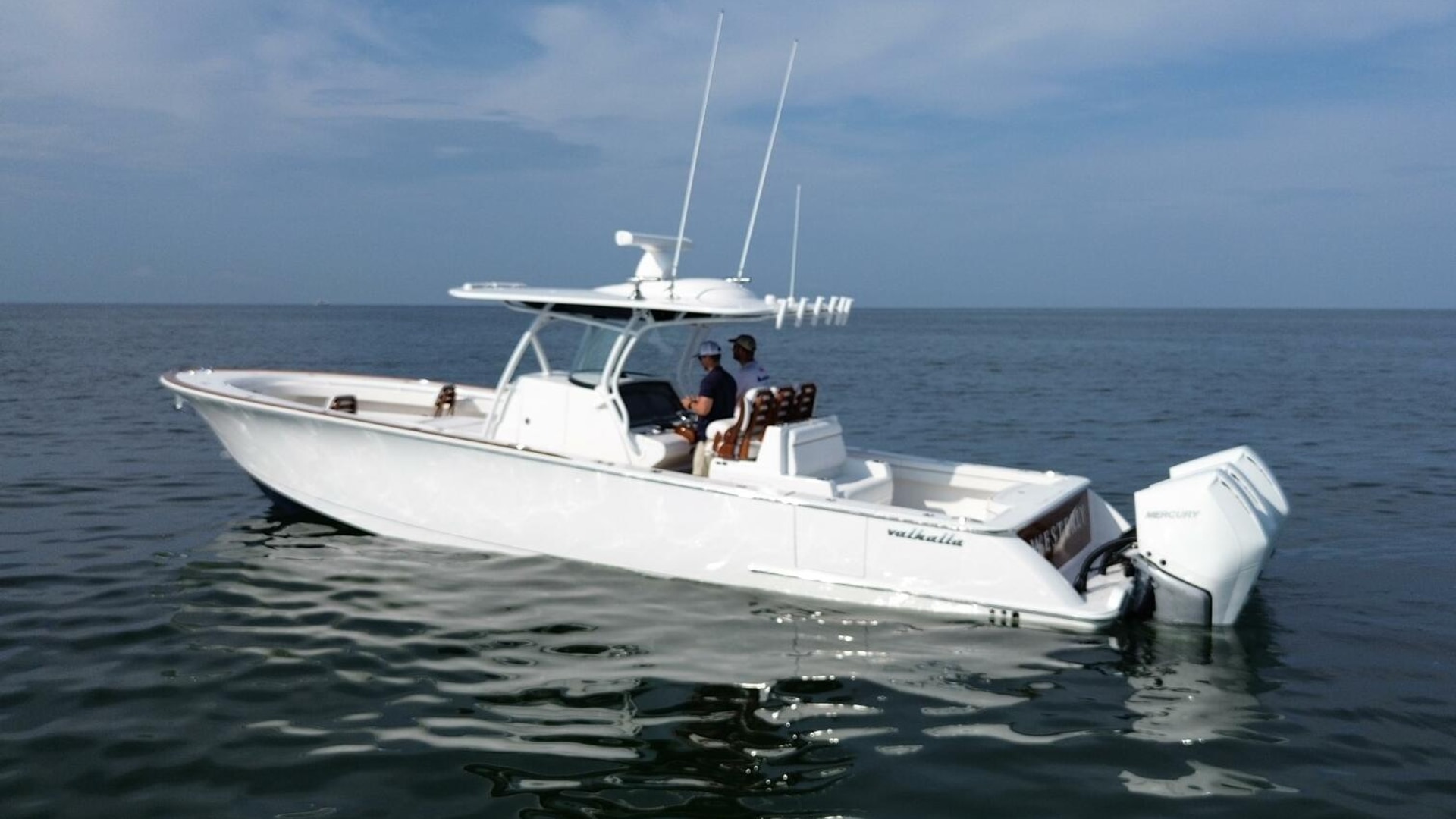 The Valhalla V37 is a high-performance center console built by Viking Yachts, designed for serious offshore fishing and luxury cruising. It features a stepped-hull design for enhanced speed, efficiency, and handling in rough seas. The V37 offers a spacious deck layout with premium Release Marine seating, integrated storage, and advanced Garmin electronics. Anglers will appreciate the large livewell, multiple rod holders, and fully rigged tackle station behind the mezzanine. With triple 300 Hp outboard power options, the V37 delivers impressive speed, reliability, and range.