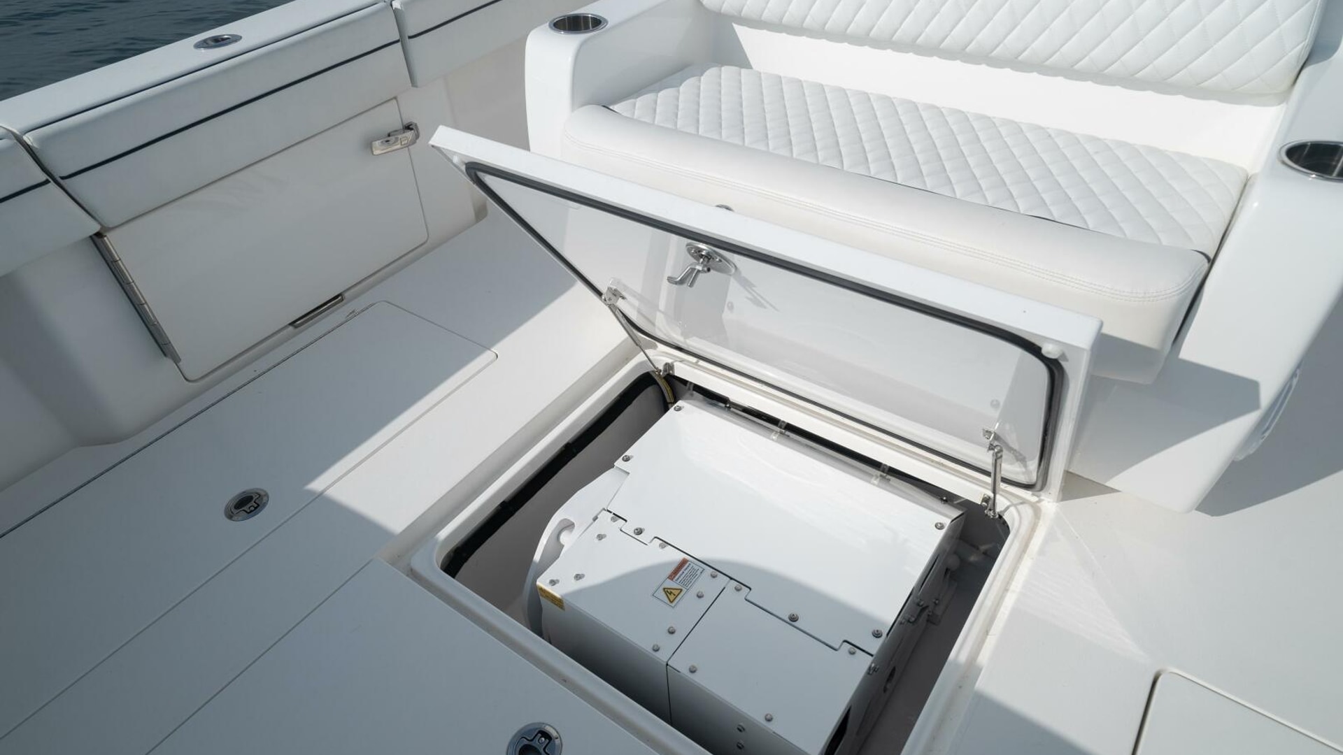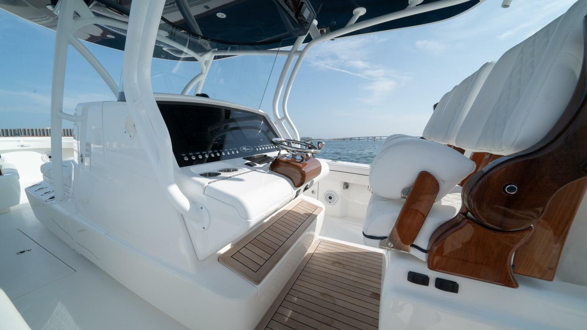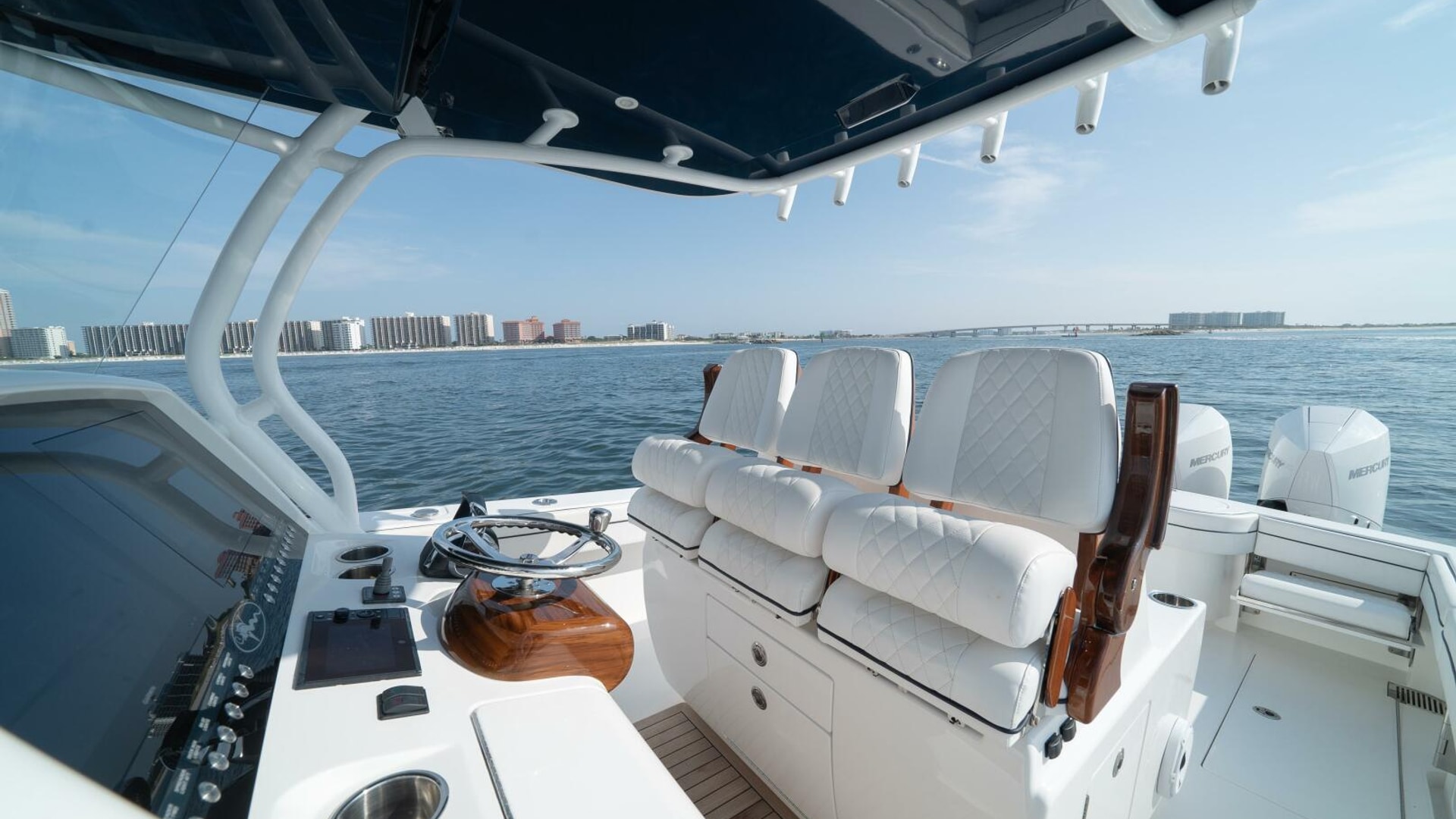 • Helm seating, mezzanine bench with armrests/tackle storage/cooler