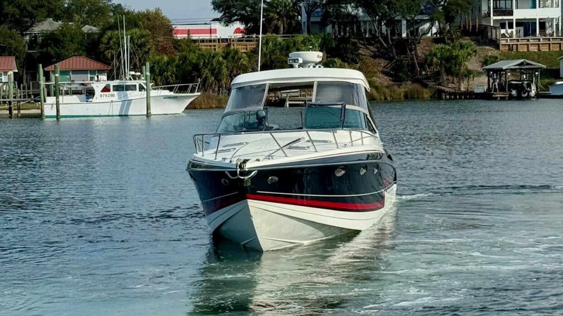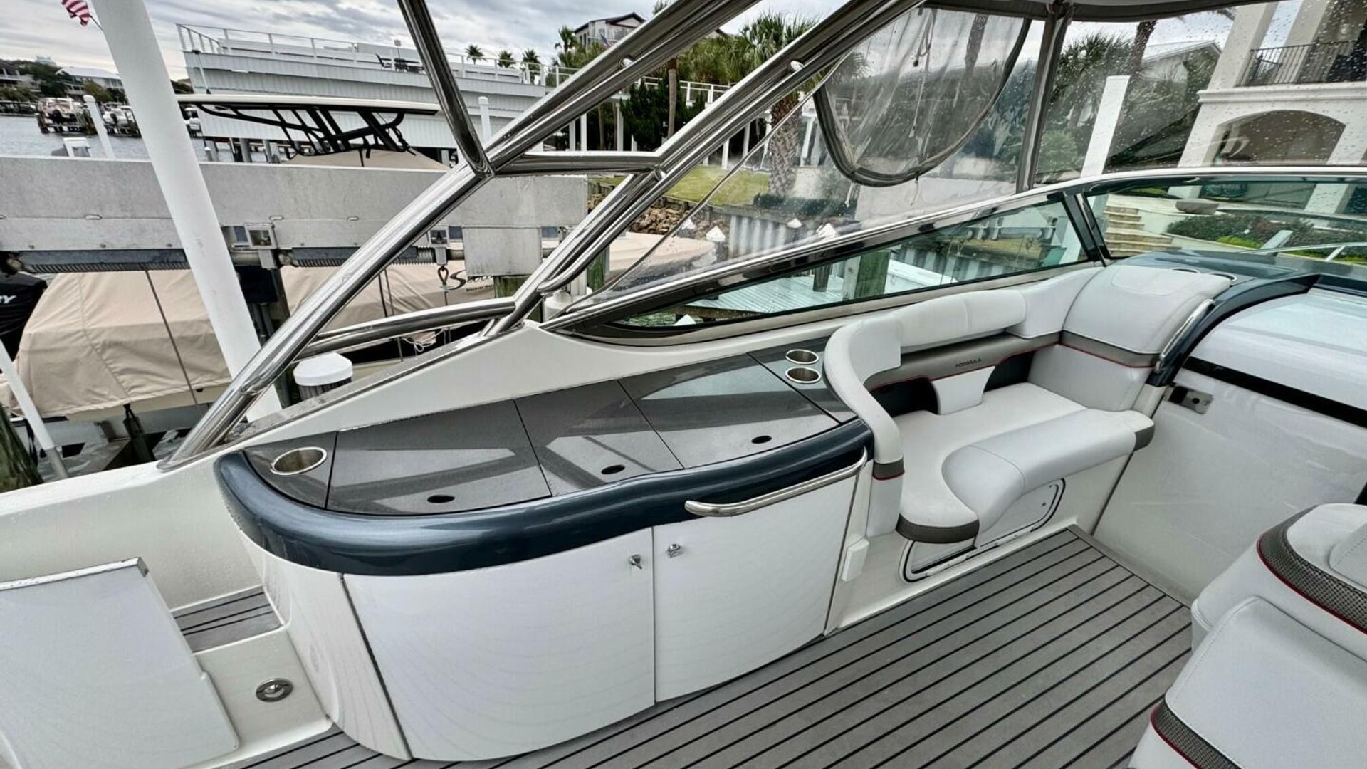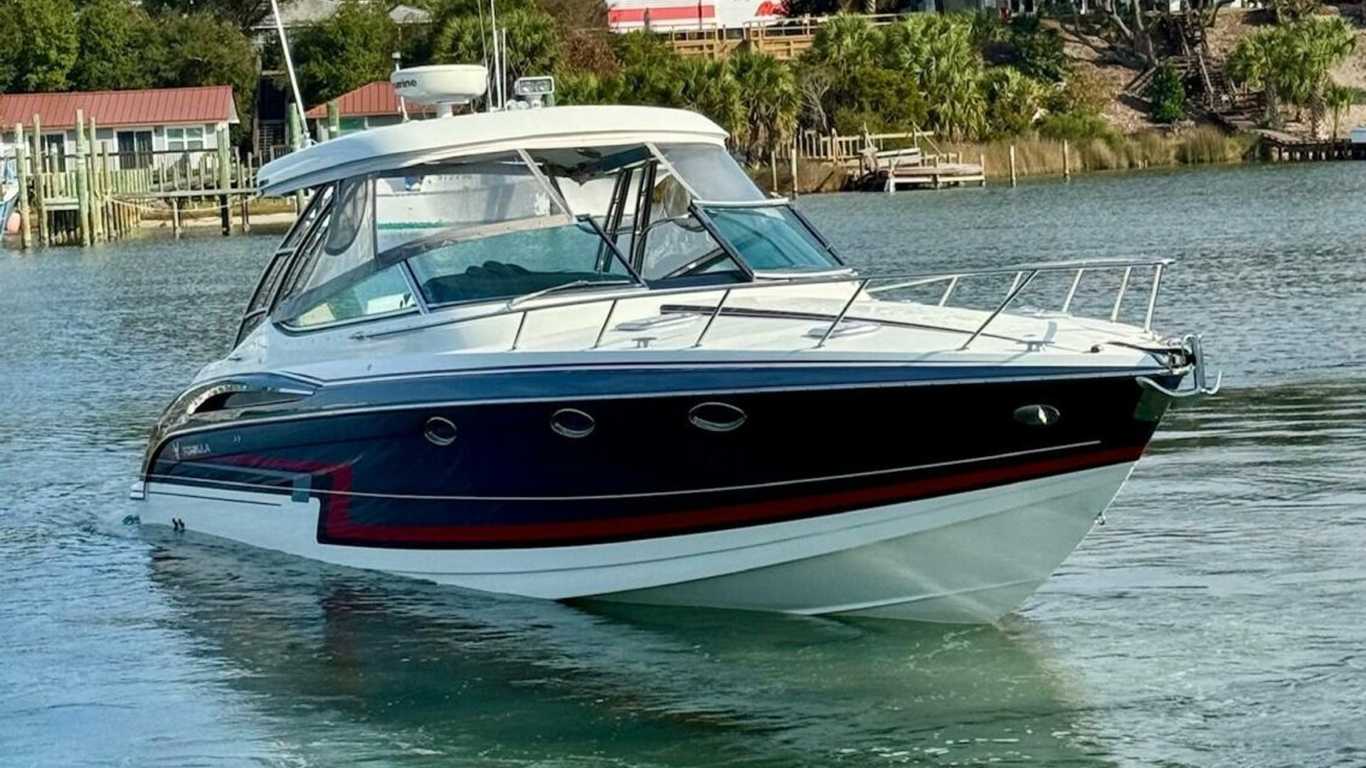 2016 37' Formula 370 Super Sport "Hoody" for sale- This Formula 370 Super Sport sits high and dry on a lift and is maintained by a yacht management company. She’s super sleek with a low profile that cuts through wind and waves with ease. She also has a complete cabin to take you to those overnight spots or long afternoon naps. The 370 SS cockpit adds more versatility than ever with a doublewide captain’s helm, wet bar, and sun lounger. Drive in style with easy joystick controls, with a fully equipped radar and chart plotter. The aft-facing lounge is electrically activated to create a generous sun pad. There's also a hard top with Sure Shade. Her expertly presented textures and colors, recessed alcoves with stainless railing, integrated, blue LED lighting, and cupholders set in eye-catching Corian® position the 370 SS at the forefront of marine design. Contact us today for an immediate showing.