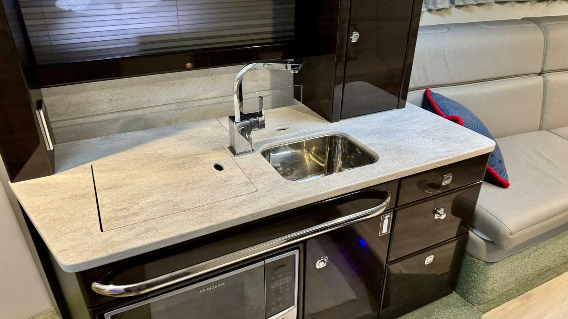 - Complete galley in high-gloss Deep Cherry finish w/storage & hardwood dovetailed drawers, full Corian countertop, 120V/12V polished stainless steel refrigerator, polished stainless steel sink, concealed electric stove w/safety shut-off switch, microwave oven, Krups® 5-speed blender & concealed trash container