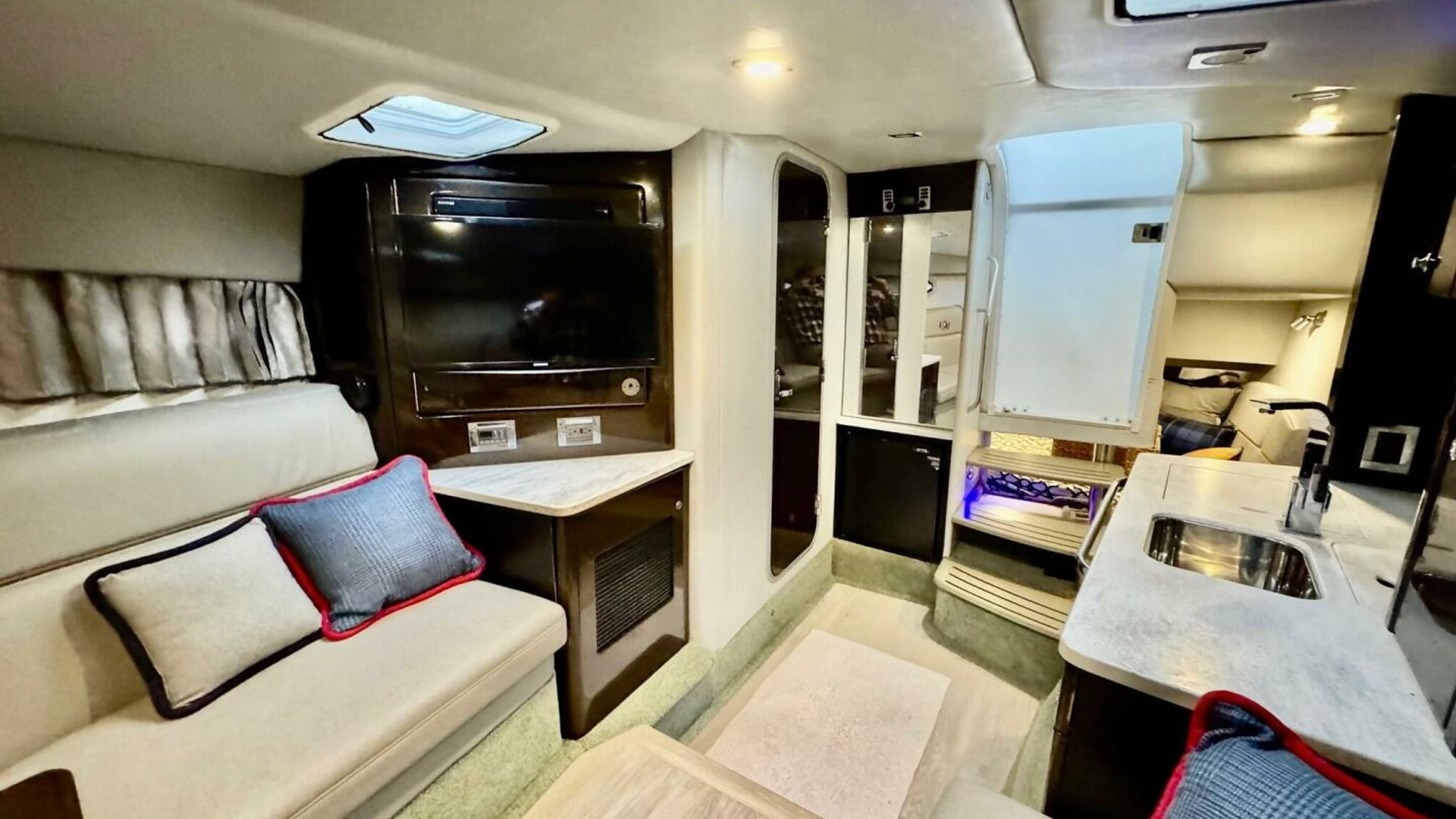 - Aft cabin stateroom/queen-size berth w/Sensus® memory foam mattress, full-width storage, cable TV receptacle, phone jack & 120V outlets