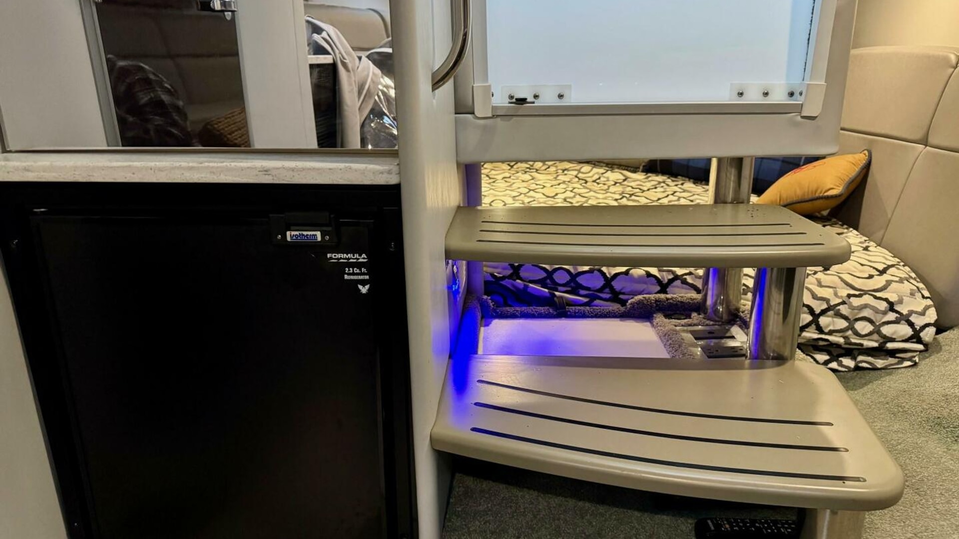 - Molded wetbar w/integrated sink, Corian® countertop, 120V/12V pullout refrigerator w/stainless steel front and beverage racks, 171/2-quart Igloo® cooler, in-counter trash container & 120V GFCI outlet