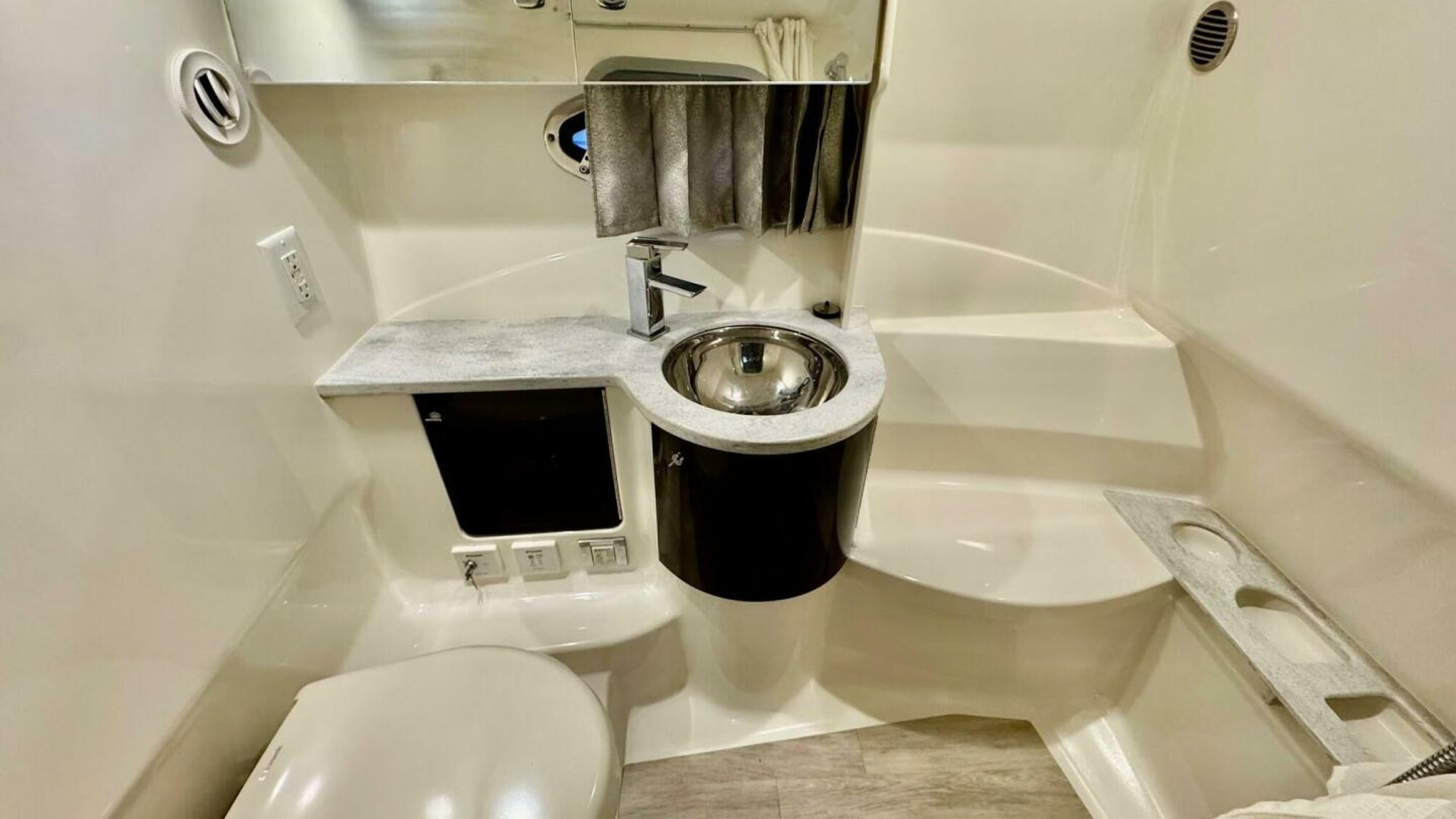 - Molded private head compartment w/vanity, high-gloss Deep Cherry-finish lower doors, Corian countertop, polished stainless steel sink w/swivel faucet, porcelain Flush and Forget® VacuFlush® head unit, 50-gallon holding tank & dockside pumpout, separate shower area w/molded-in seat & exhaust fan