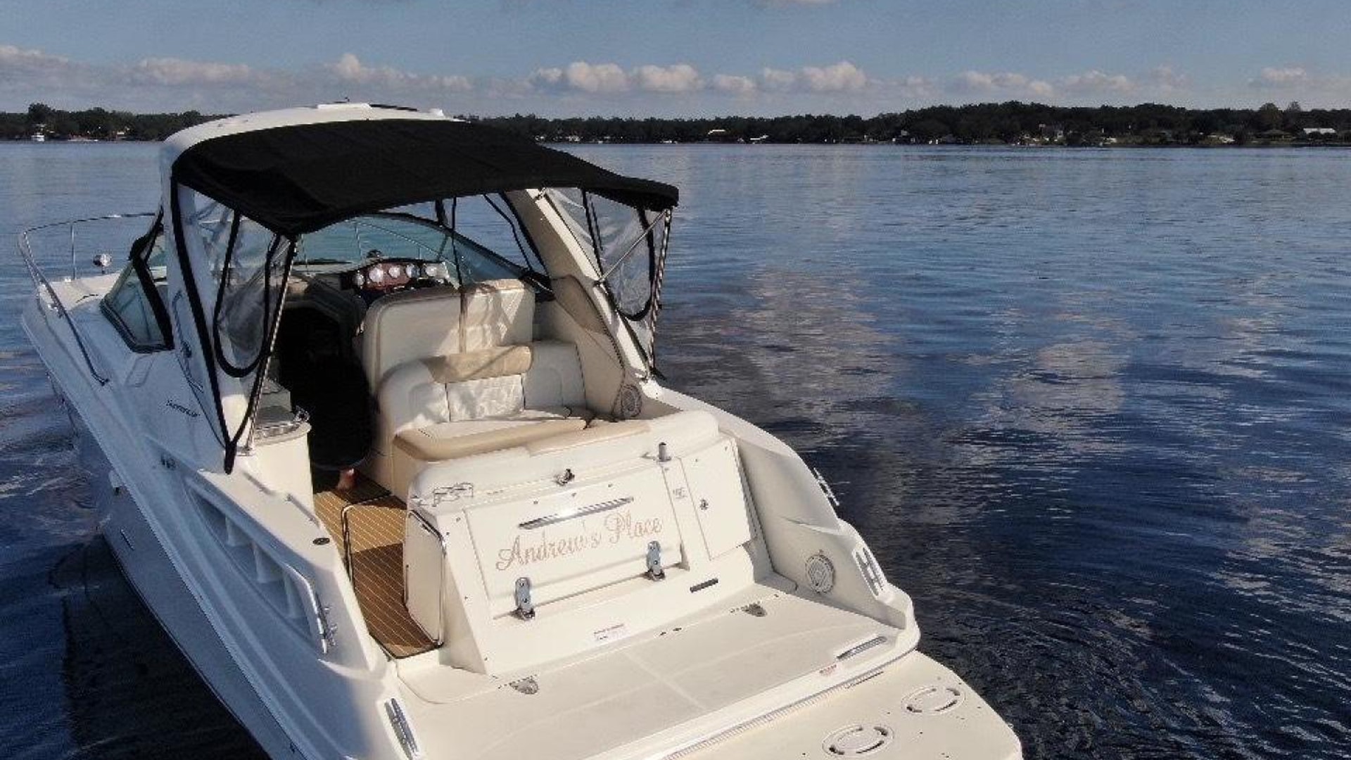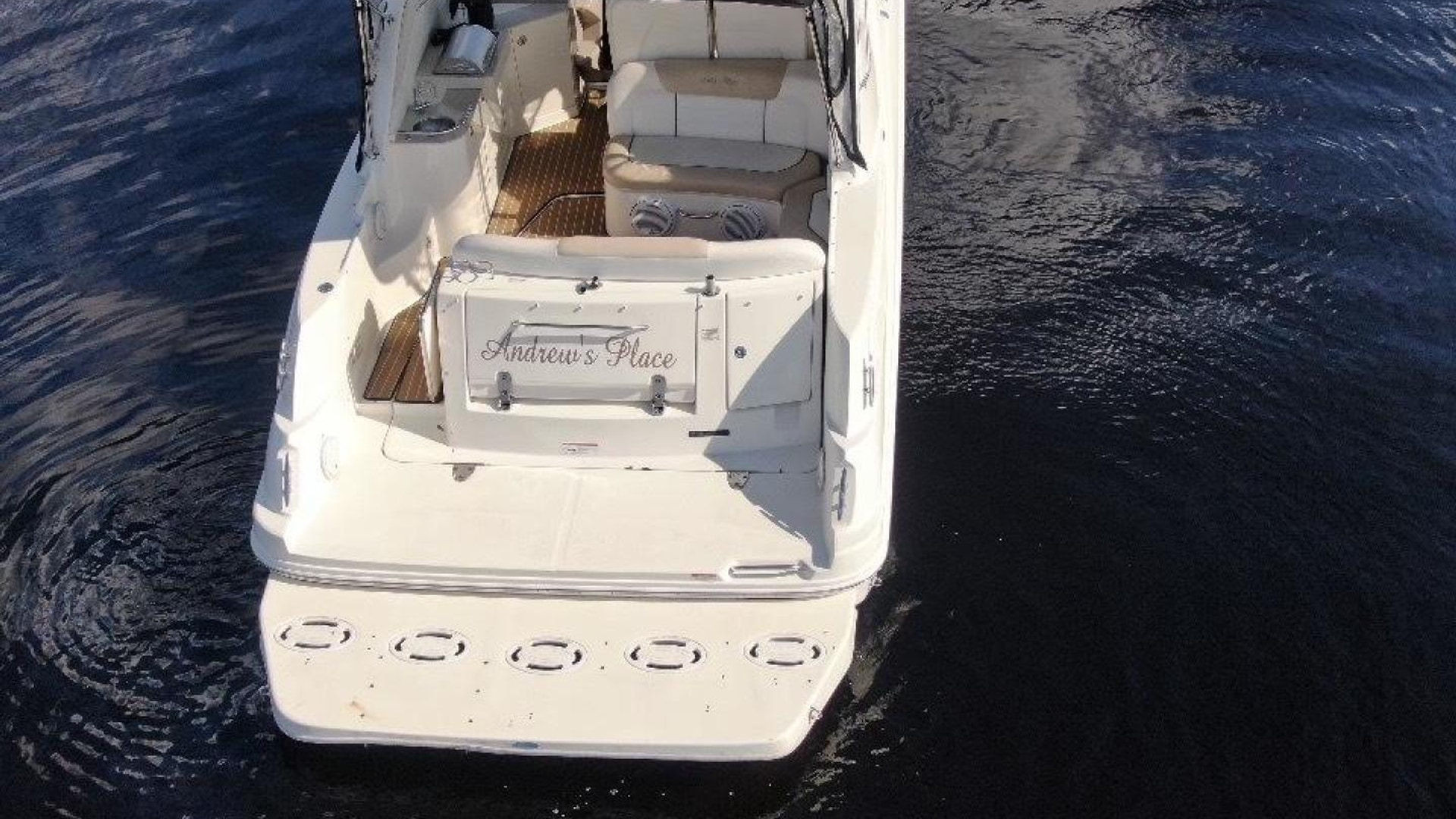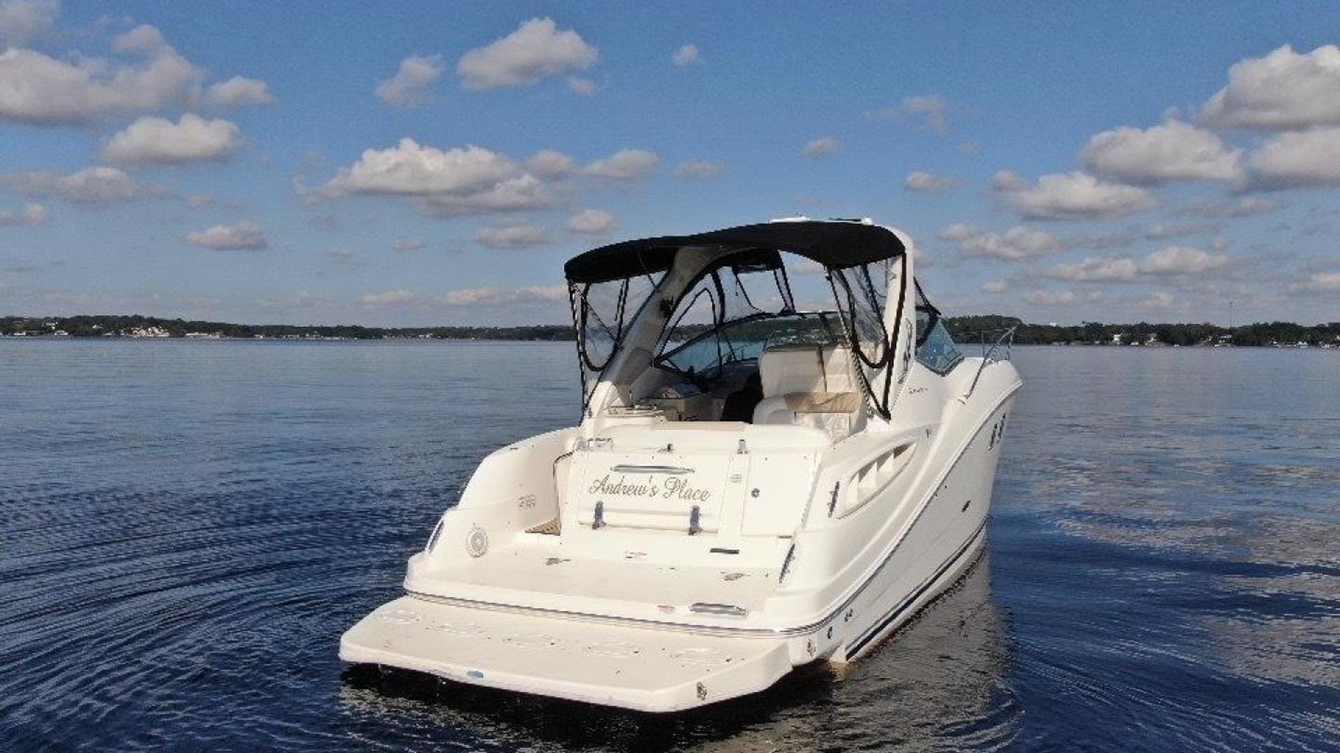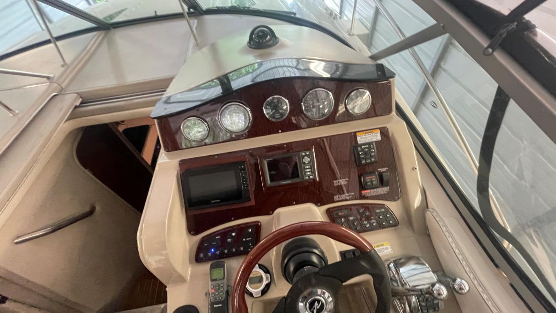 2009 33 ft Sea Ray 310 Sundancer "Andrews Place". She is powered by Twin 300HP Mercruiser 350 Mag Engines with the Axius Joystick and Skyhook system. At the helm, Garmin 840SX display for the radar, Garmin GPS, Raymarine VHF and Smart Craft display. The cockpit has a wet bar with electric grill, refrigerator and sink, fwd. and aft facing seats with a teak folding table. Below deck, cherry wood interior, ultra-leather seating, full galley to port, two staterooms and a head compartment. There is a center-line queen berth forward with hanging locker to starboard and a storage locker to port, A/C controls and a privacy curtain. The galley is to port and the Ultra-leather settee with folding wood table to starboard. The enclosed head compartment is aft of the galley. The Mid-cabin is aft under the helm area with double berth, TV, storage and privacy curtain. There is a 32" TV mounted above the Mid-cabin, and Maple flooring. The boat has been trailer stored under cover.