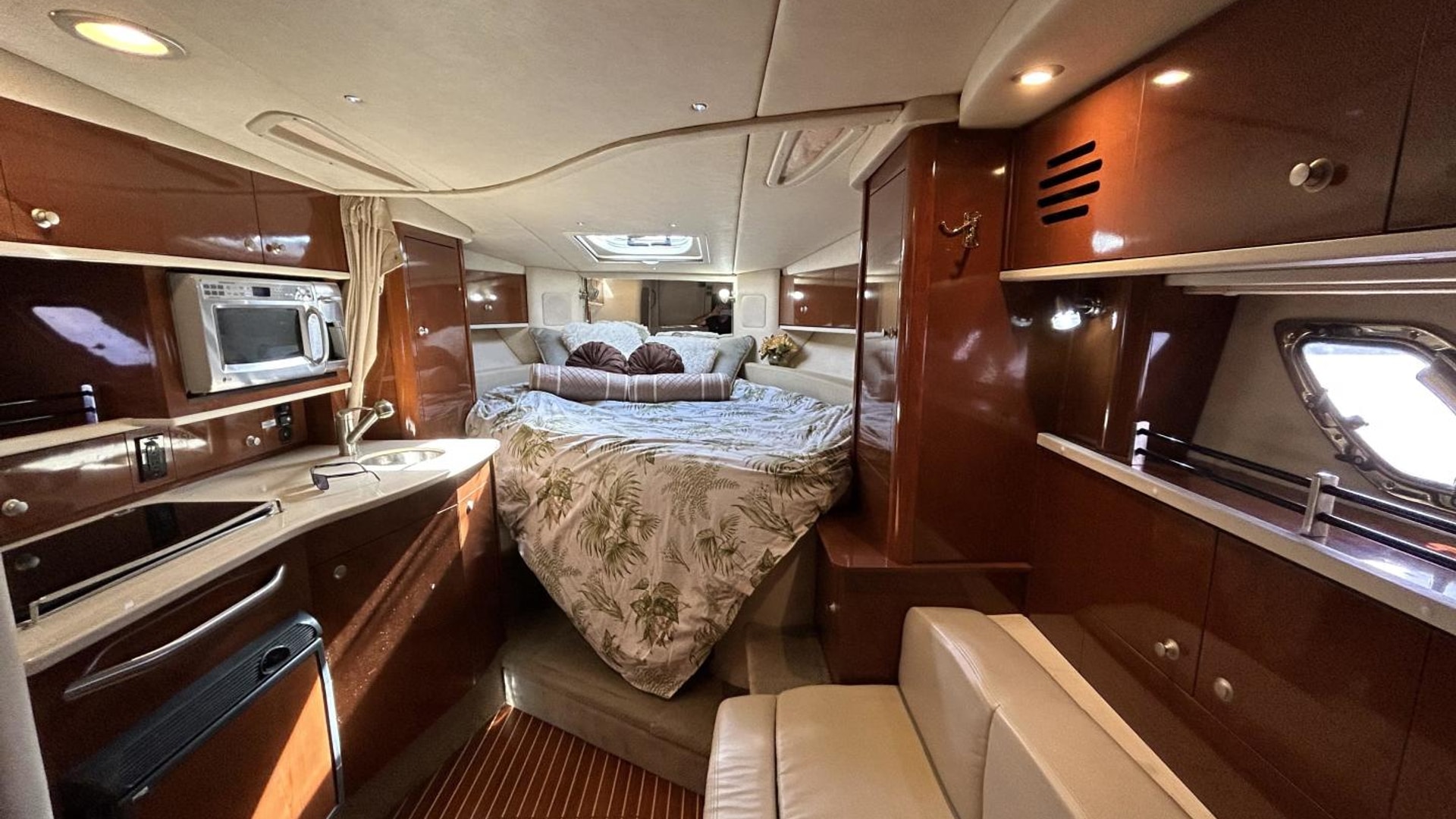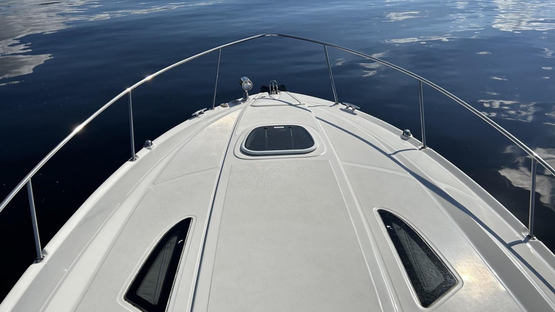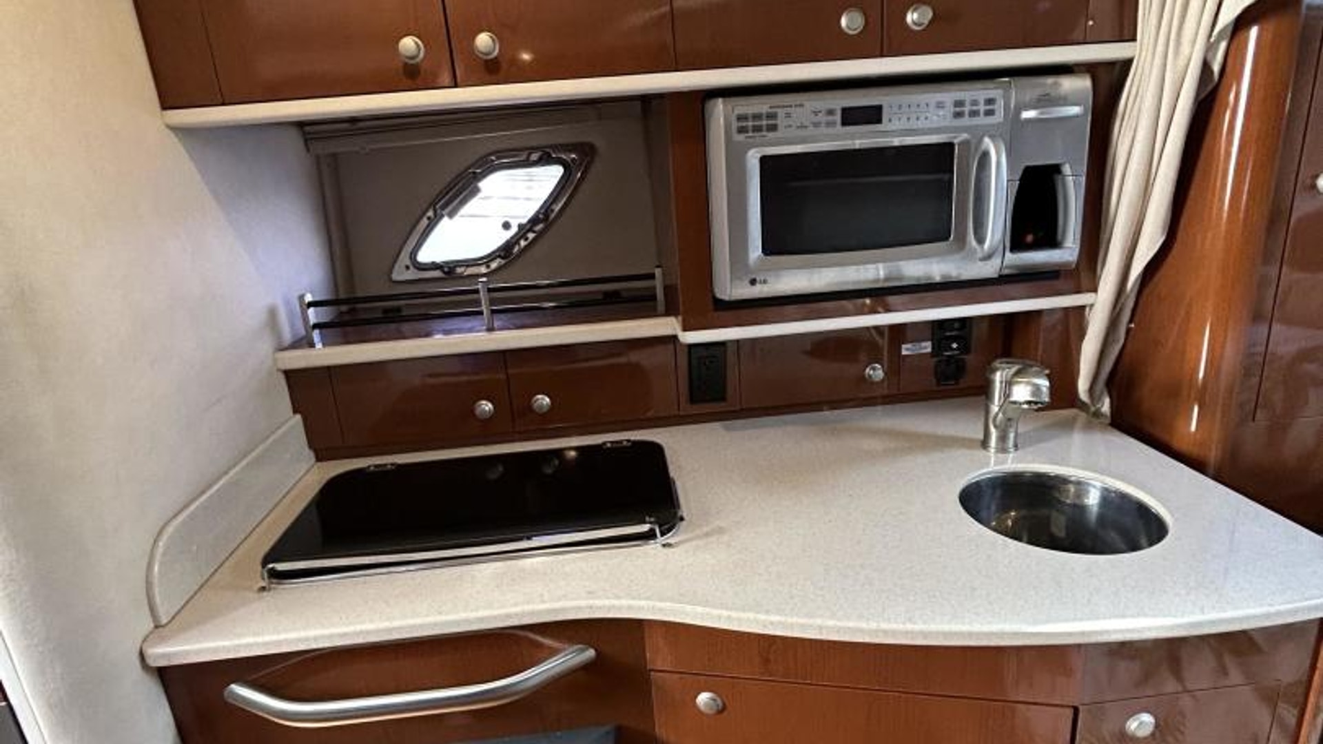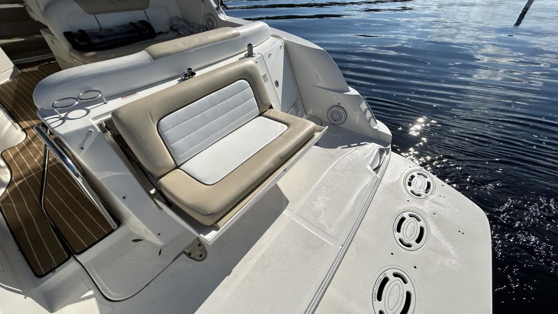 2009 33 ft Sea Ray 310 Sundancer "Andrews Place". She is powered by Twin 300HP Mercruiser 350 Mag Engines with the Axius Joystick and Skyhook system. At the helm, Garmin 840SX display for the radar, Garmin GPS, Raymarine VHF and Smart Craft display. The cockpit has a wet bar with electric grill, refrigerator and sink, fwd. and aft facing seats with a teak folding table. Below deck, cherry wood interior, ultra-leather seating, full galley to port, two staterooms and a head compartment. There is a center-line queen berth forward with hanging locker to starboard and a storage locker to port, A/C controls and a privacy curtain. The galley is to port and the Ultra-leather settee with folding wood table to starboard. The enclosed head compartment is aft of the galley. The Mid-cabin is aft under the helm area with double berth, TV, storage and privacy curtain. There is a 32" TV mounted above the Mid-cabin, and Maple flooring. The boat has been trailer stored under cover.