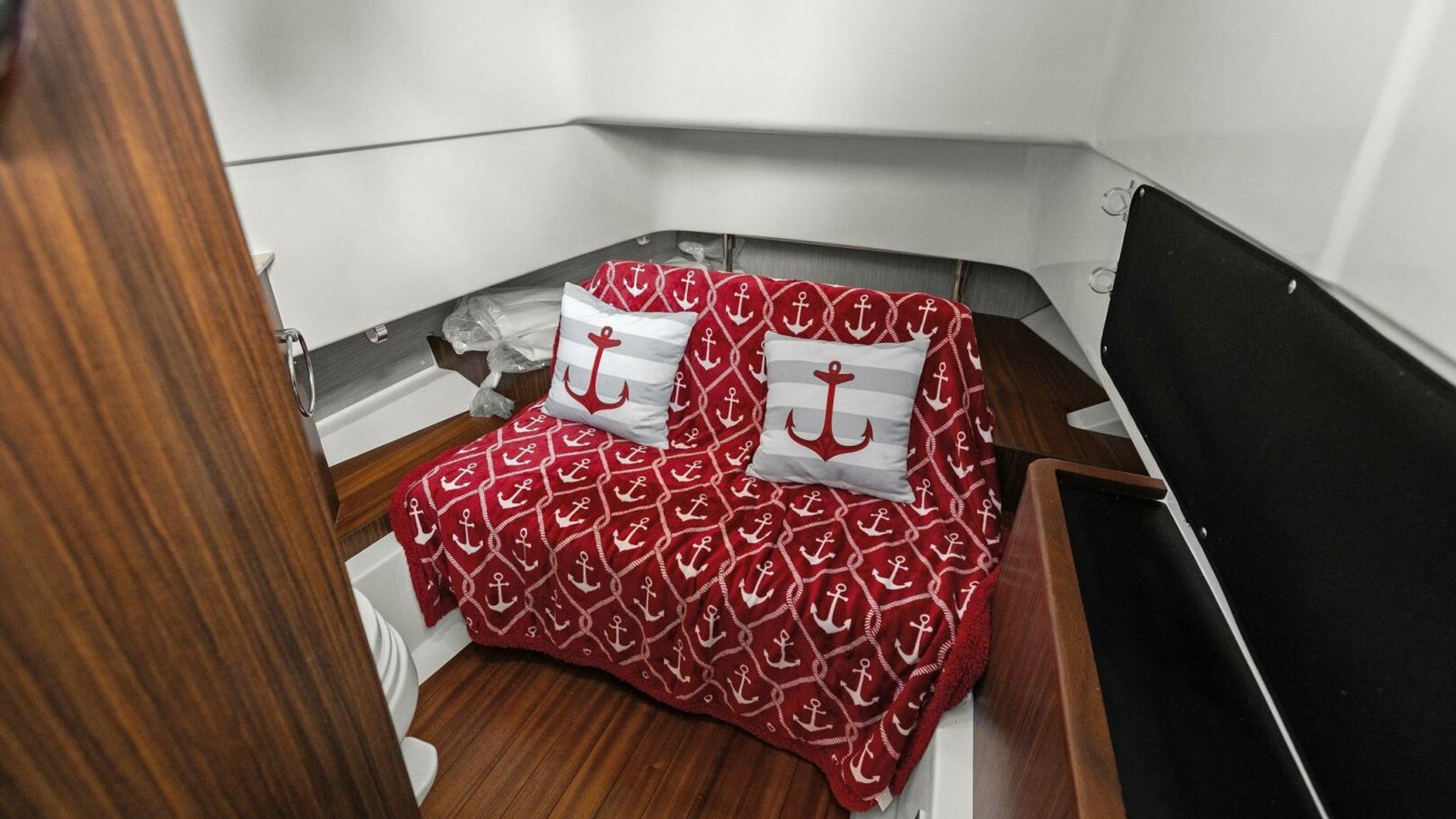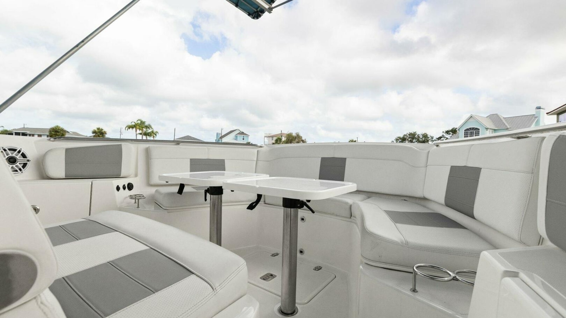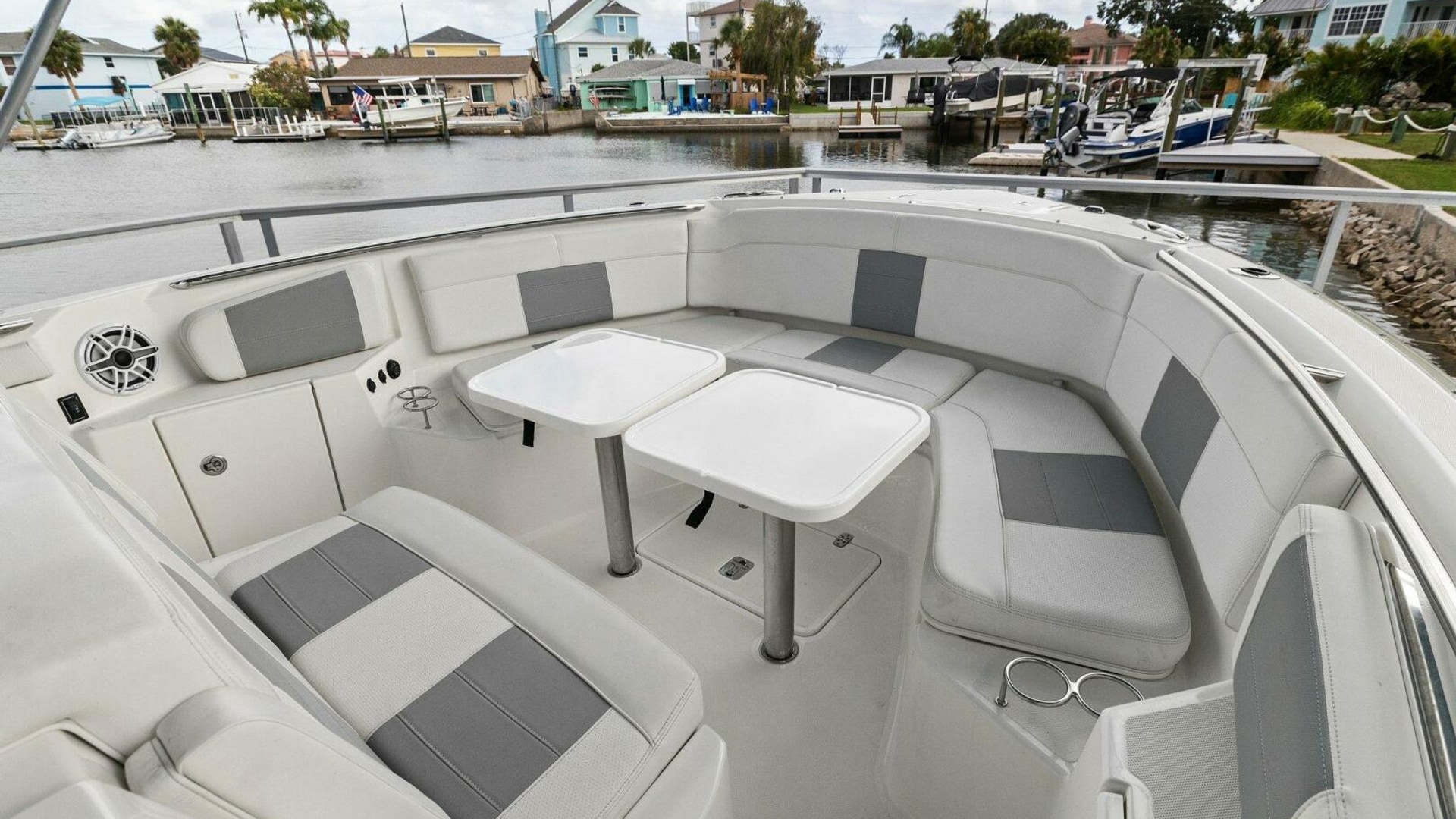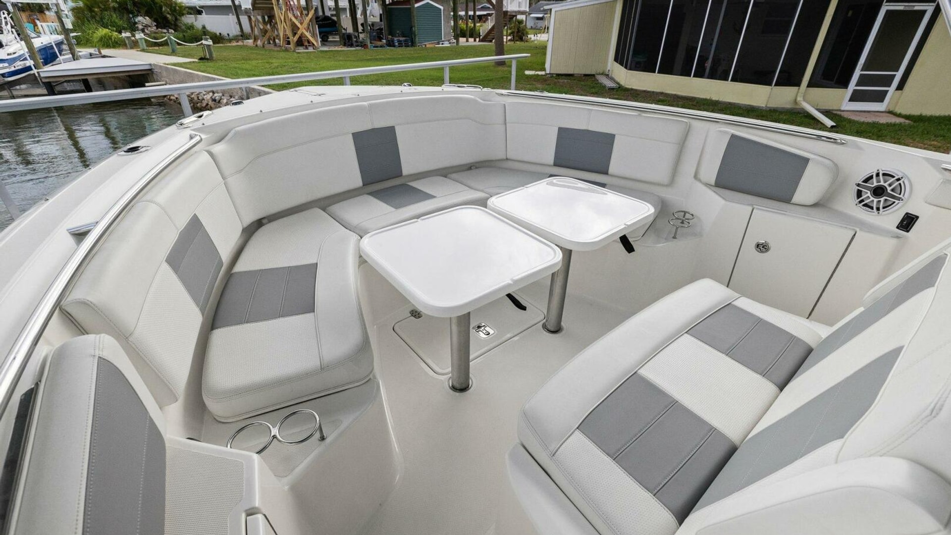 - Port and Starboard Forward End Tables with Two (2) Drink Holders, 12V and USB Outlet, Forward Stereo Remote, and Storage Below