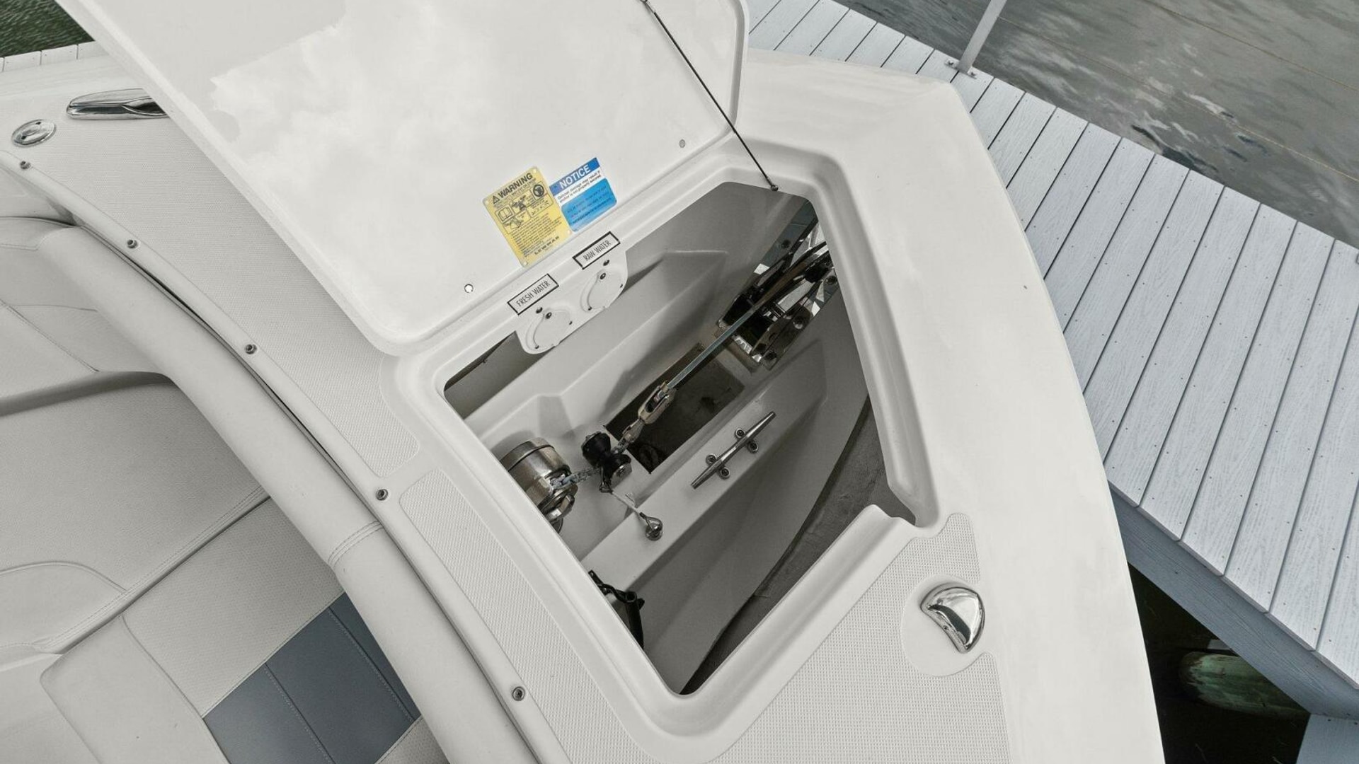 - Flush Mounted Integral Anchor Locker with Fiberglass Lid including Horizontal Anchor Windlass with Switch at Helm and Remote at Anchor Locker 316L Stainless Steel through Stem Anchor Roller with 8" Mooring Cleat, Chain Binder, 22lb Stainless Steel Plow Style Anchor, Self-Righting Shackle and 200' Rode (1/2" 8 Plait including 20' of ¼" G4 Chain)