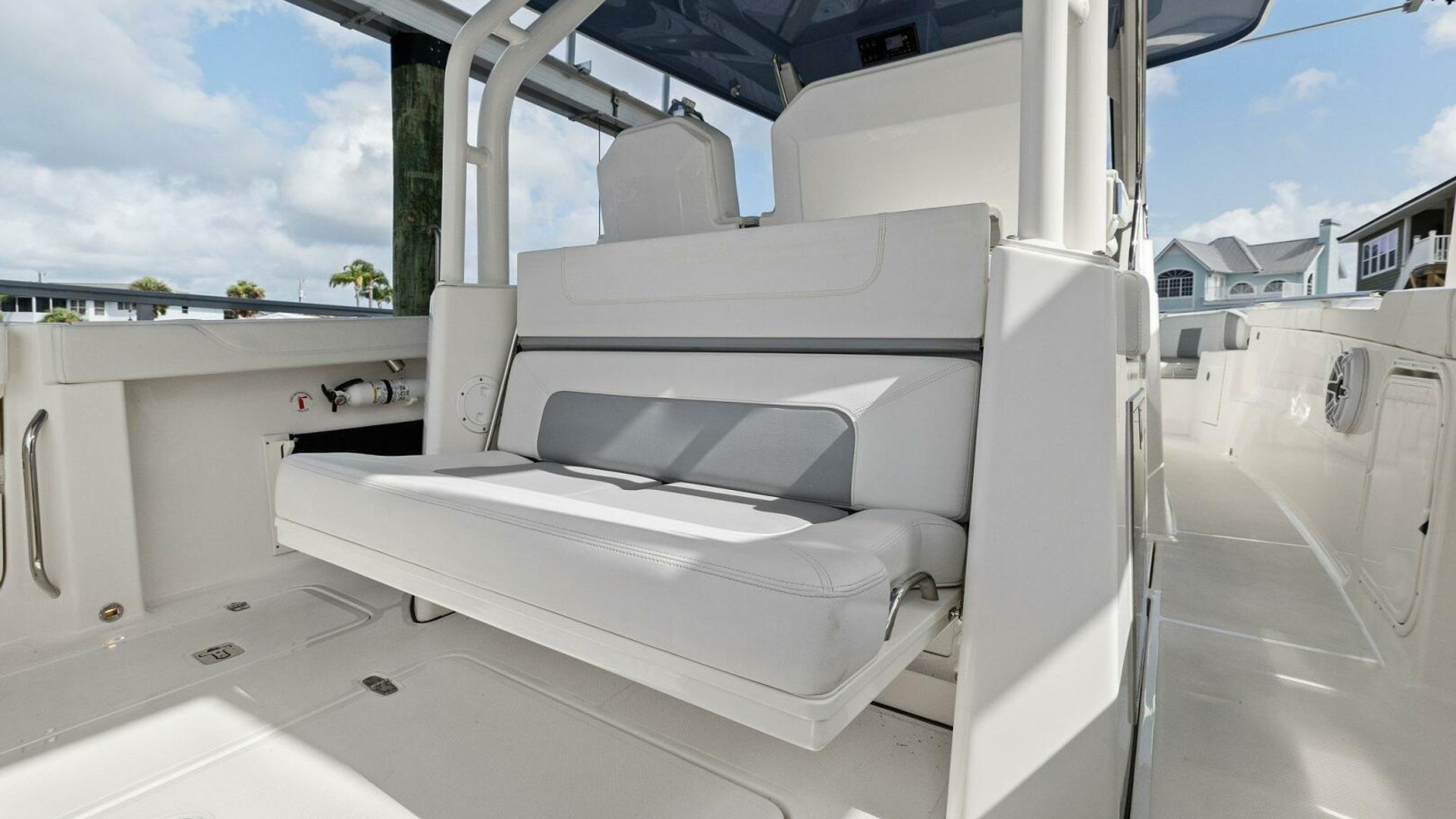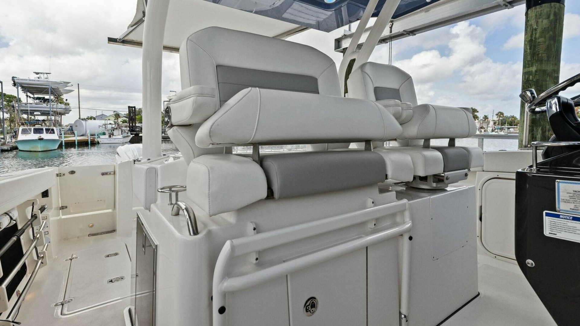 - 60/40 Helm Seating Configuration with Foldable Armrests, Fore, Aft, and Vertical Adjustment on Captain’s Chair and Fold Out Footrests