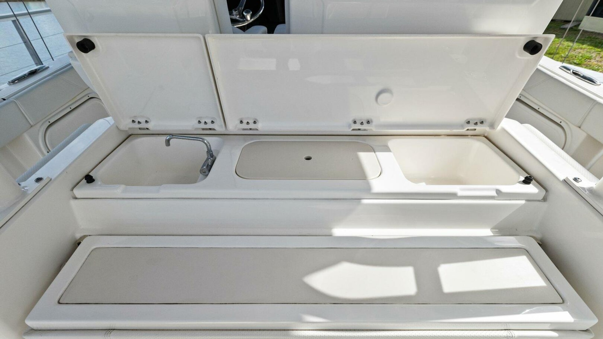 - Molded Entertainment Center with Sink, Fresh Water Faucet, Insulated FRP Cooler with Corian®Lid, Drink Holders(2), Cutting Board, 110V GFI Protected Outlet, Hinged Fiberglass Lids and Dedicated Storage Below
