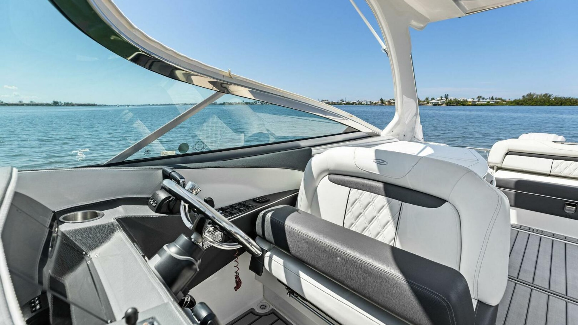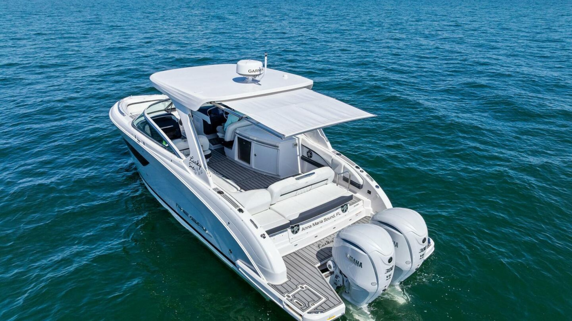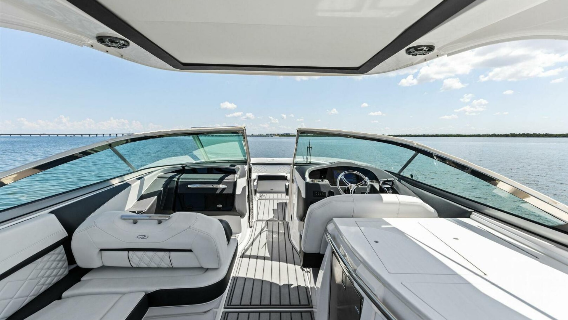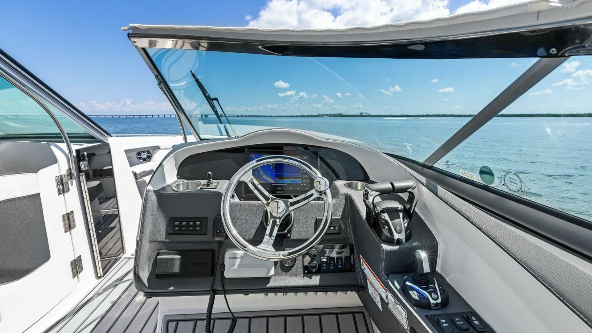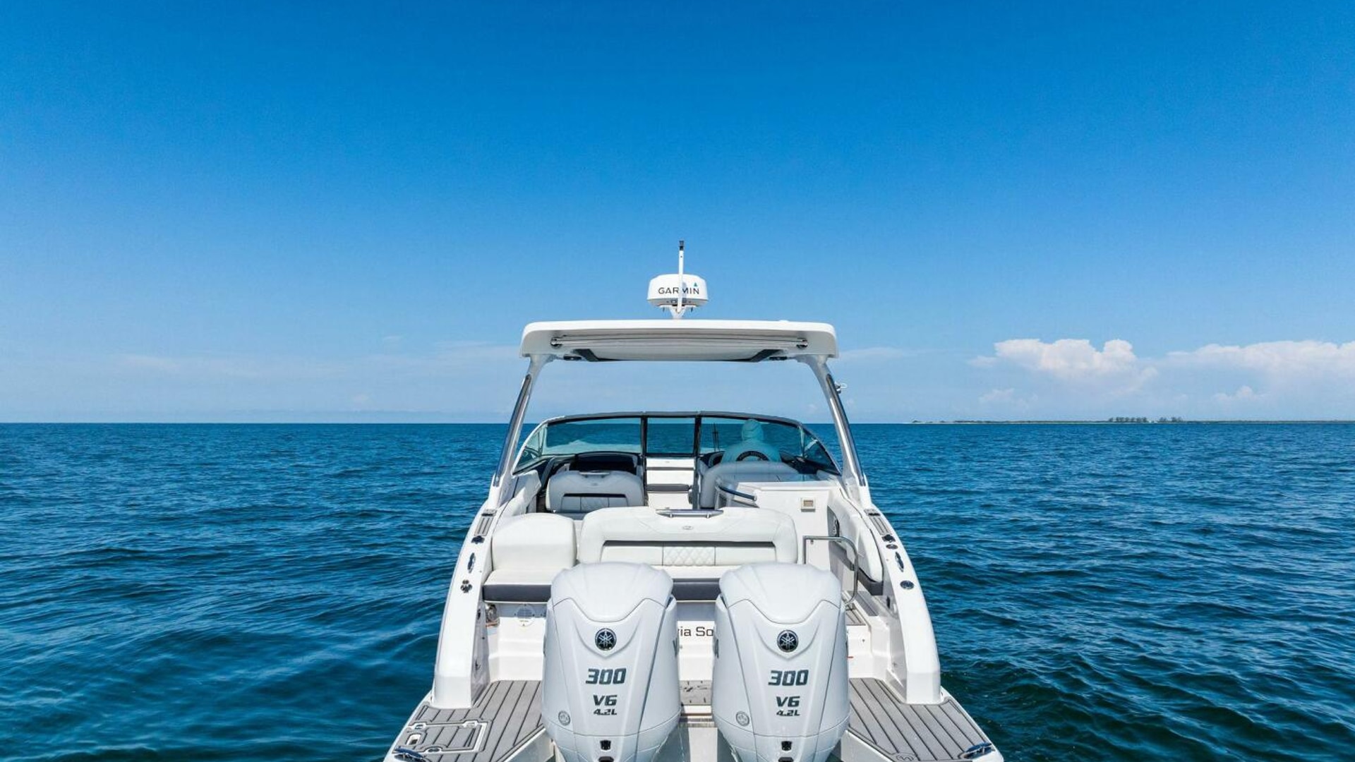Loaded with premium features including an Isinglass wraparound, Garmin electronics package, retractable cockpit sunshade, bow thruster, and joystick controls for effortless docking, she’s equally ready for long cruising days or entertaining at anchor. Powered by twin Yamaha F300s with a recent 100-hour service completed, you’ll enjoy confident, efficient performance with total peace of mind.