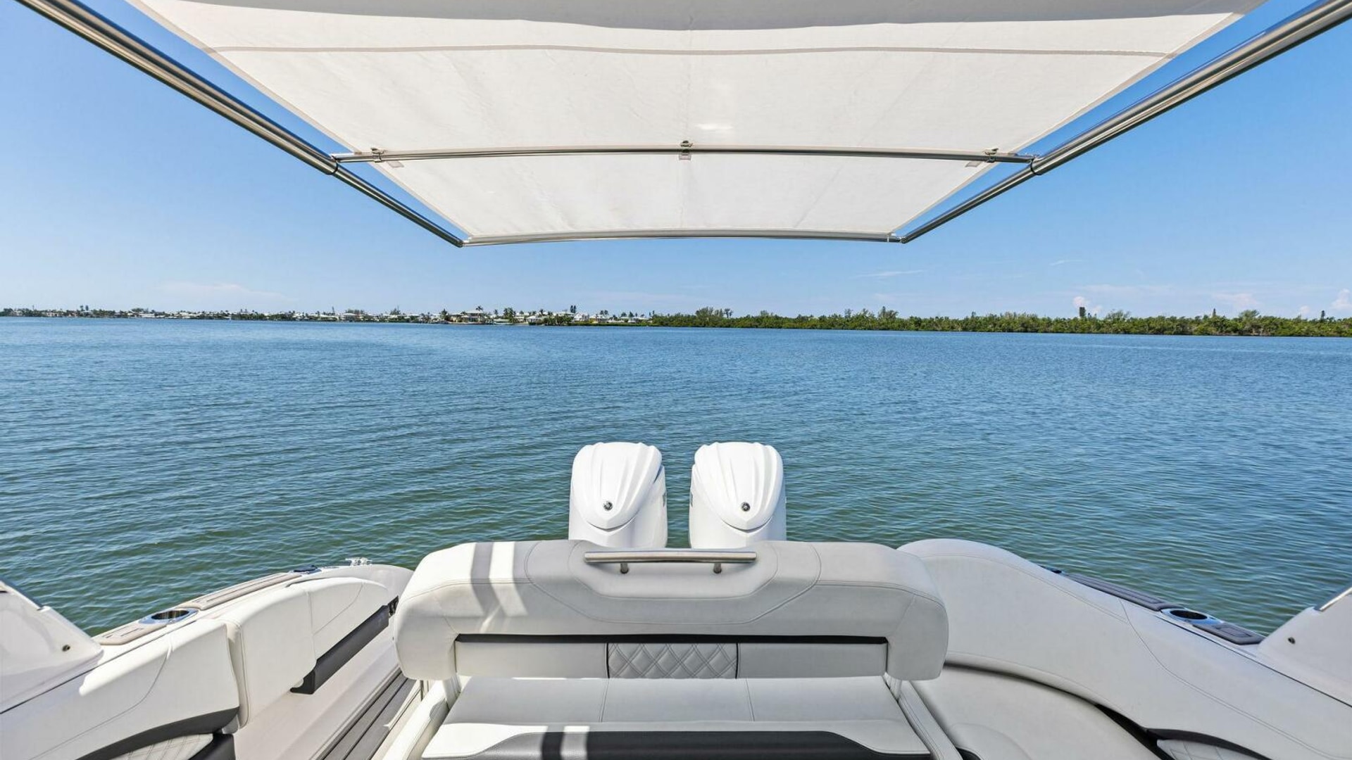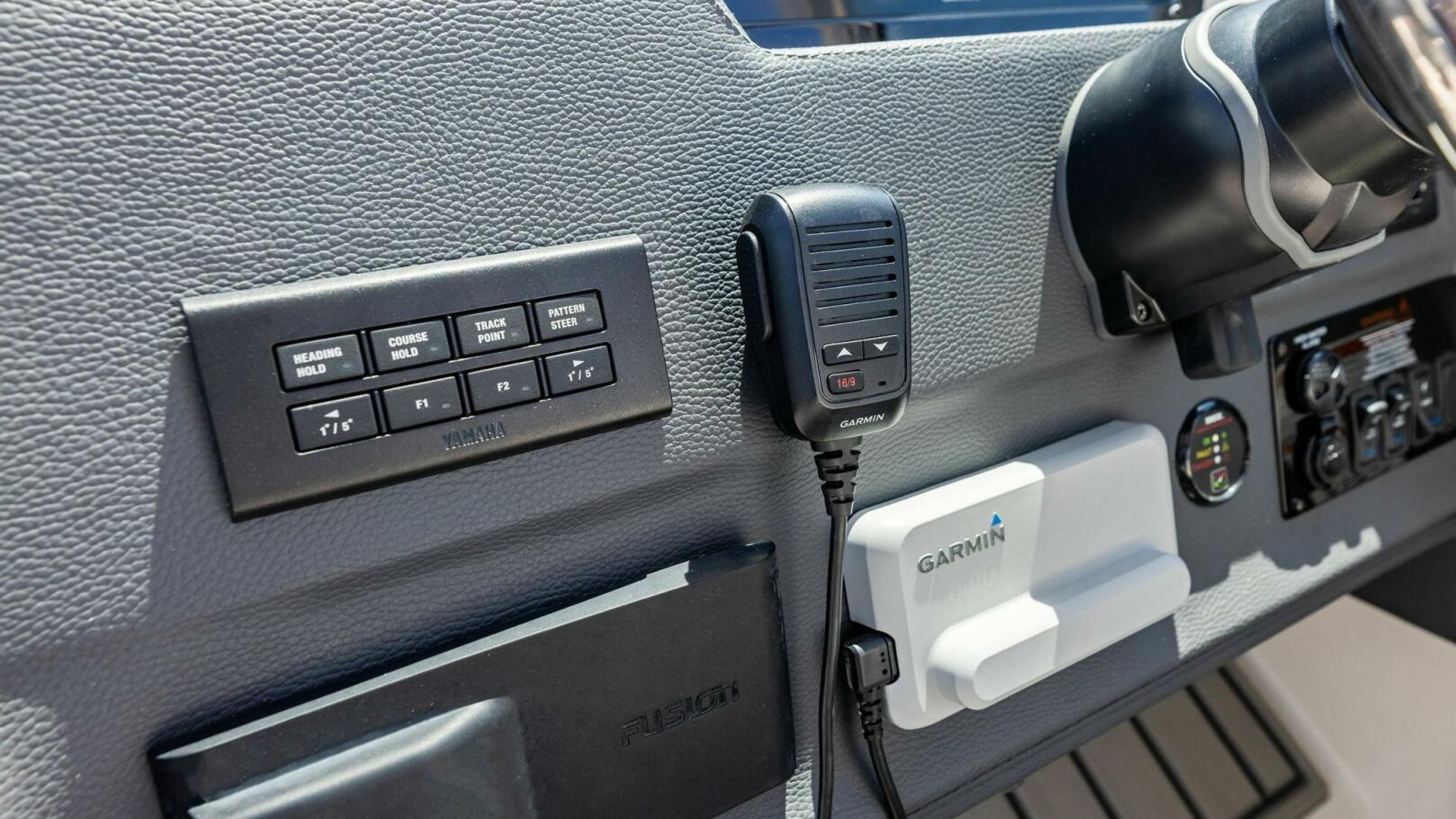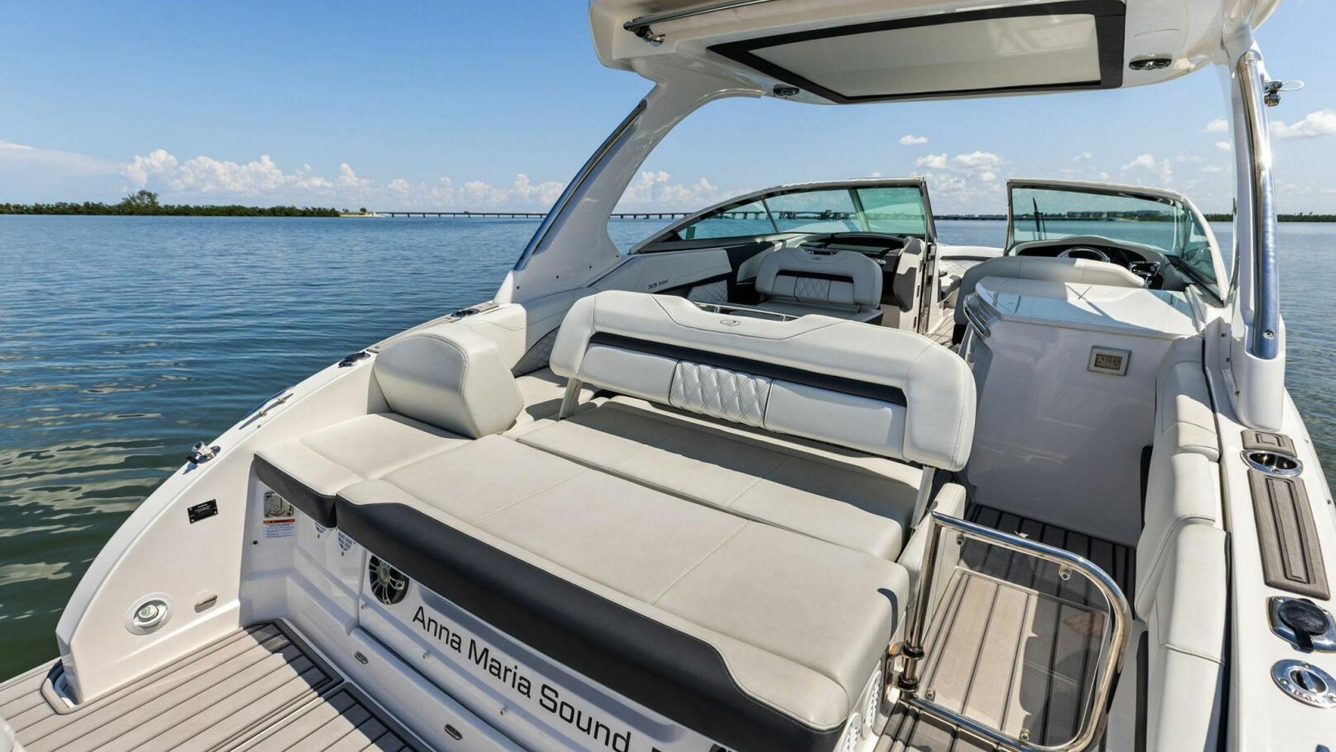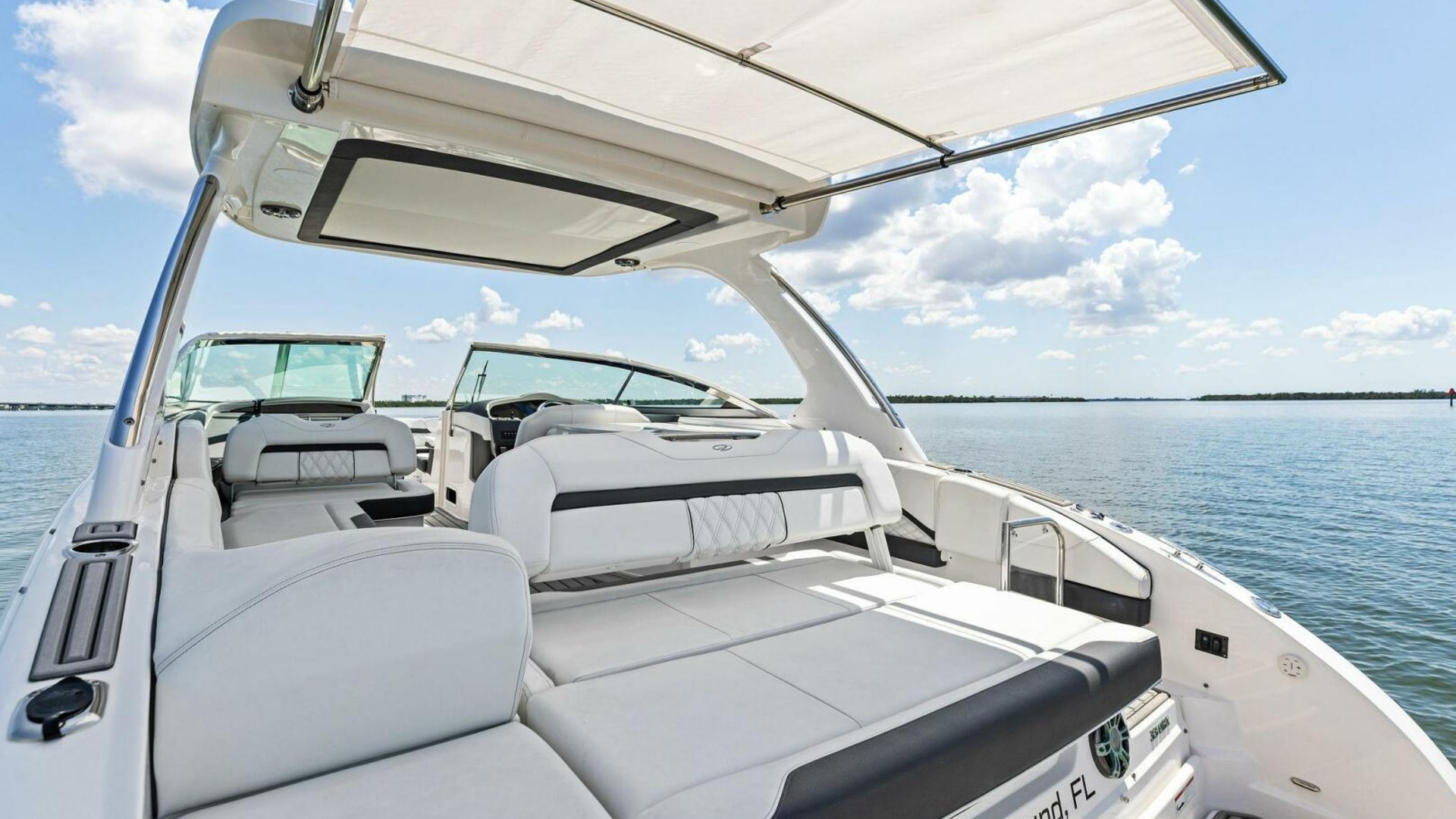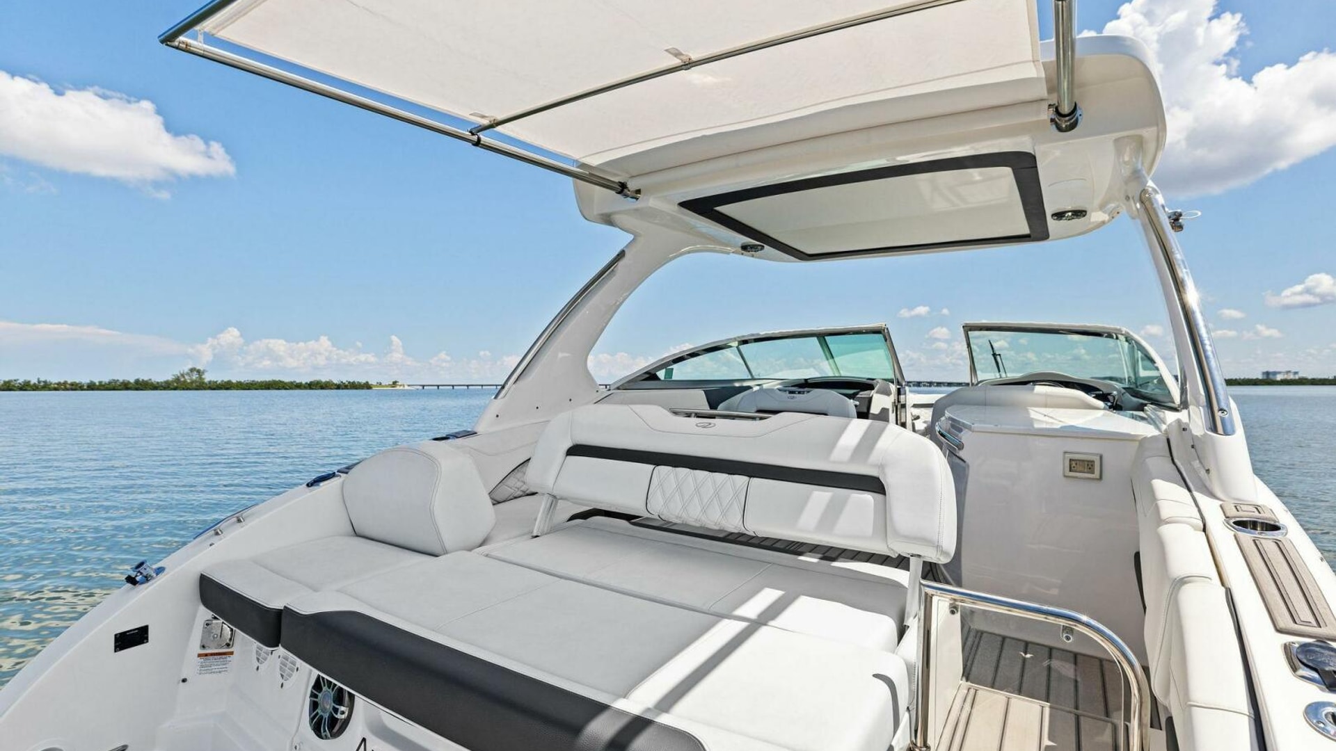 Loaded with premium features including an Isinglass wraparound, Garmin electronics package, retractable cockpit sunshade, bow thruster, and joystick controls for effortless docking, she’s equally ready for long cruising days or entertaining at anchor. Powered by twin Yamaha F300s with a recent 100-hour service completed, you’ll enjoy confident, efficient performance with total peace of mind.