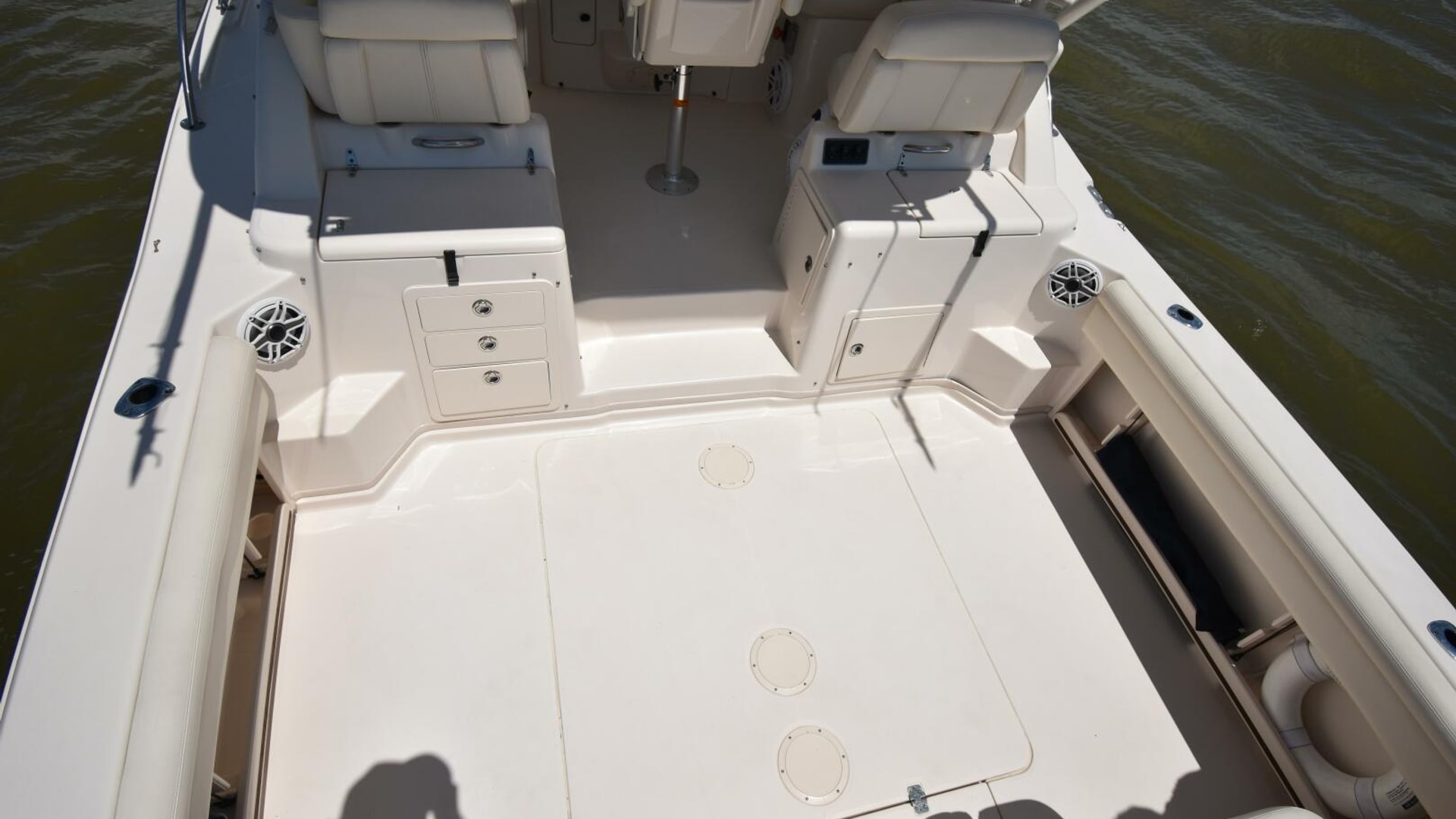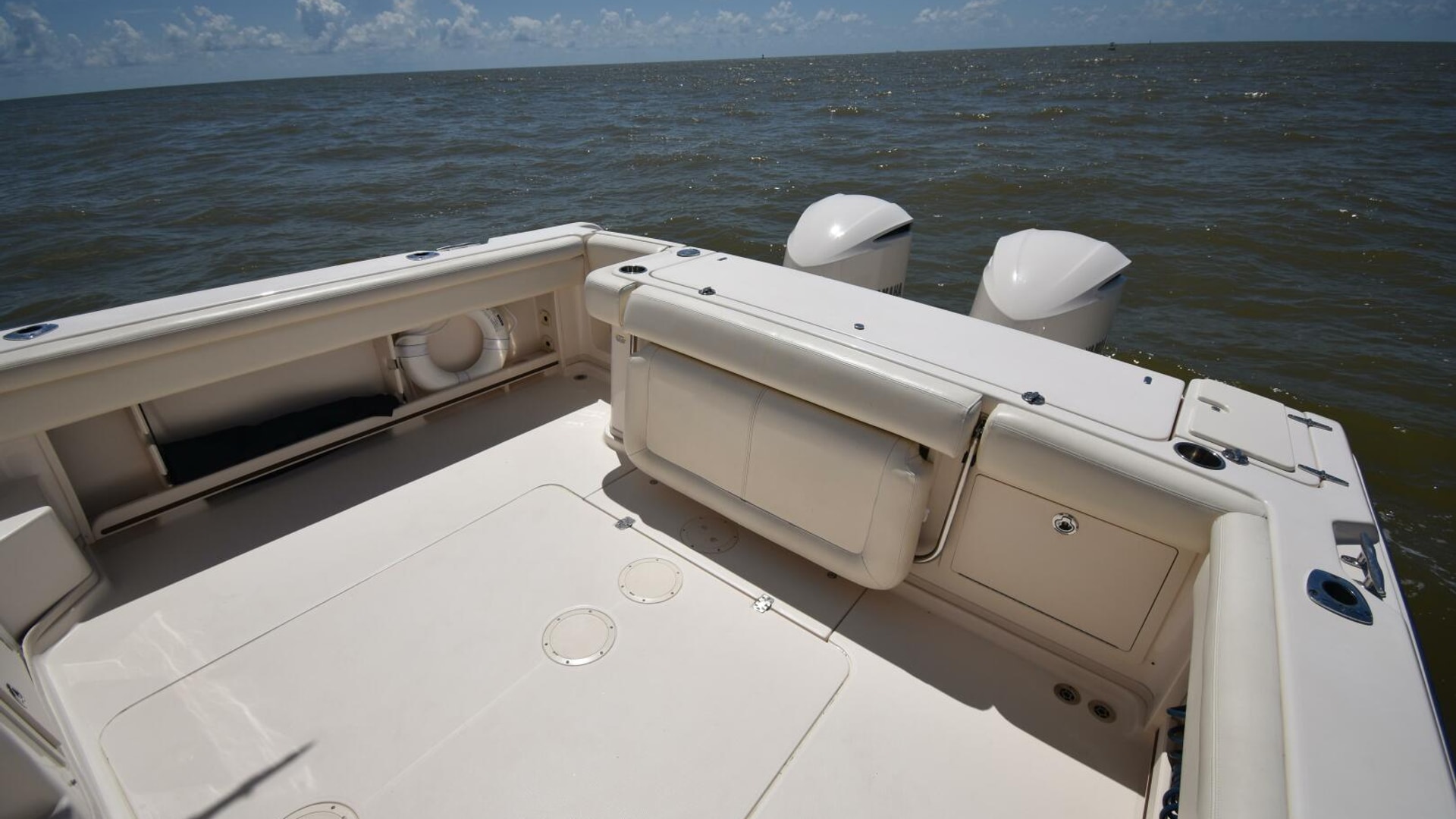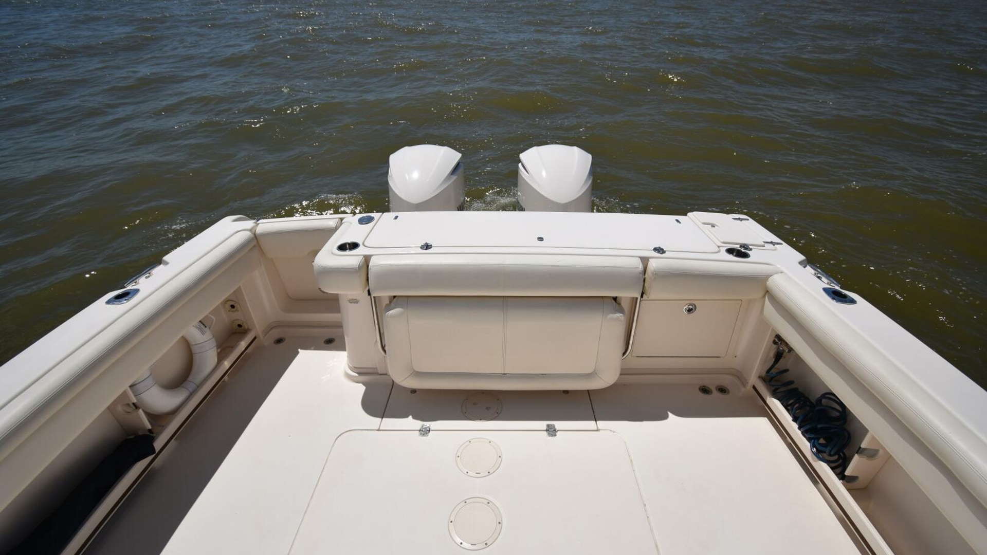 This model comes well-equipped with a host of standard features, such as a built-in swim/dive platform, sturdy hardtop with radio box, 4kW generator, a 45-gallon livewell, fold-away rear bench, and both fresh and raw water washdowns. Additional highlights include cockpit bolsters, a transom door, aft-facing cockpit seating, a secure electronics locker, bait prep station with sink, transom fish box, and a bow pulpit.