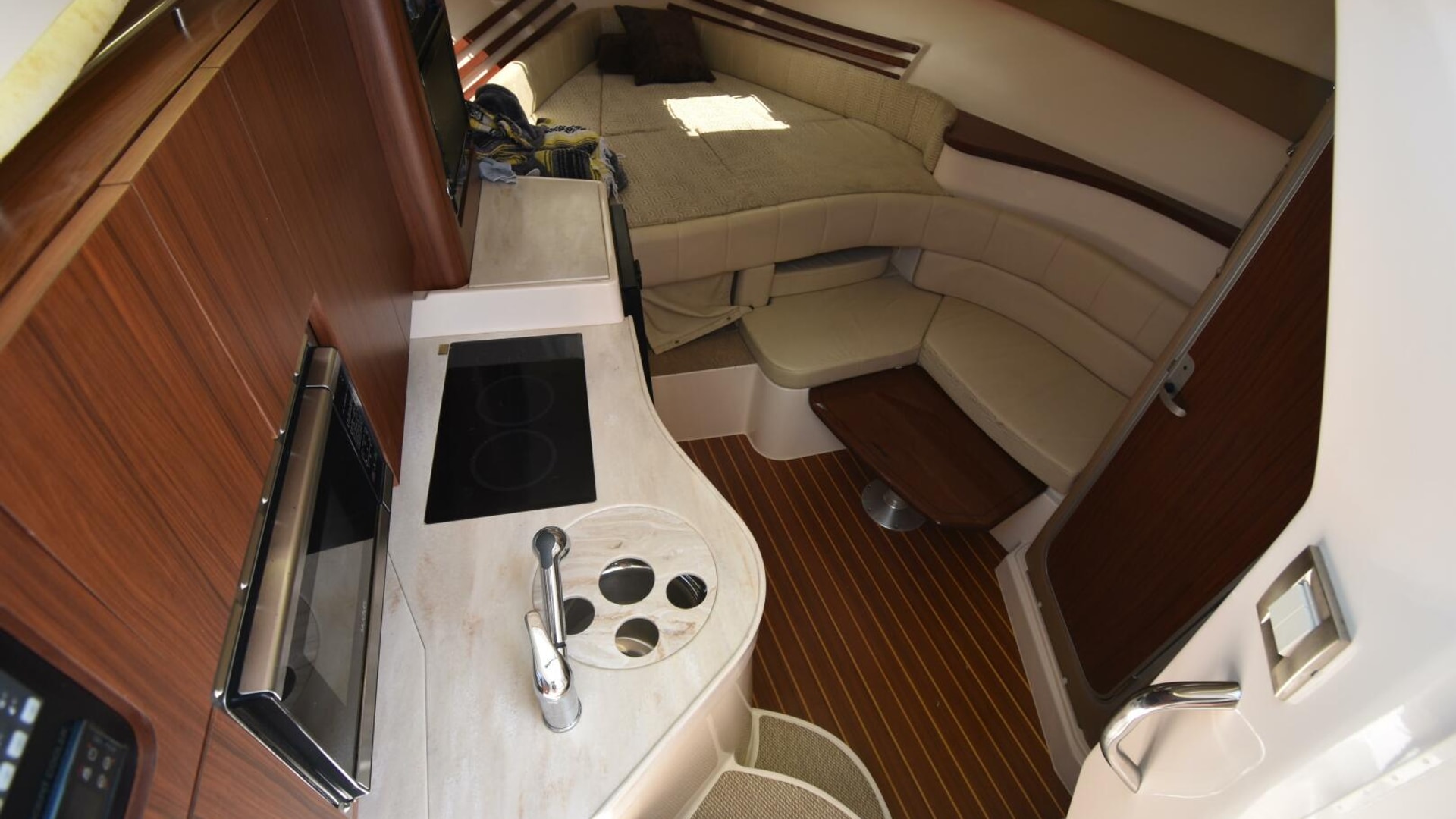 Below deck, the inviting mid-cabin layout is designed to sleep four comfortably. The interior is finished with rich teak cabinetry, a teak and holly sole, a polished cherry dining table, and a fully outfitted galley featuring a microwave and Corian countertop. The spacious head and shower complete the package, offering comfort and practicality for extended outings.