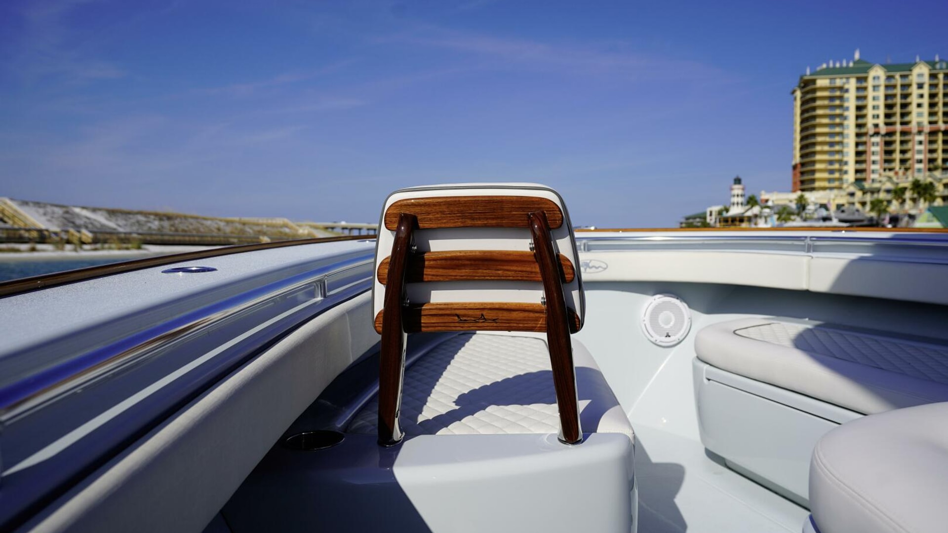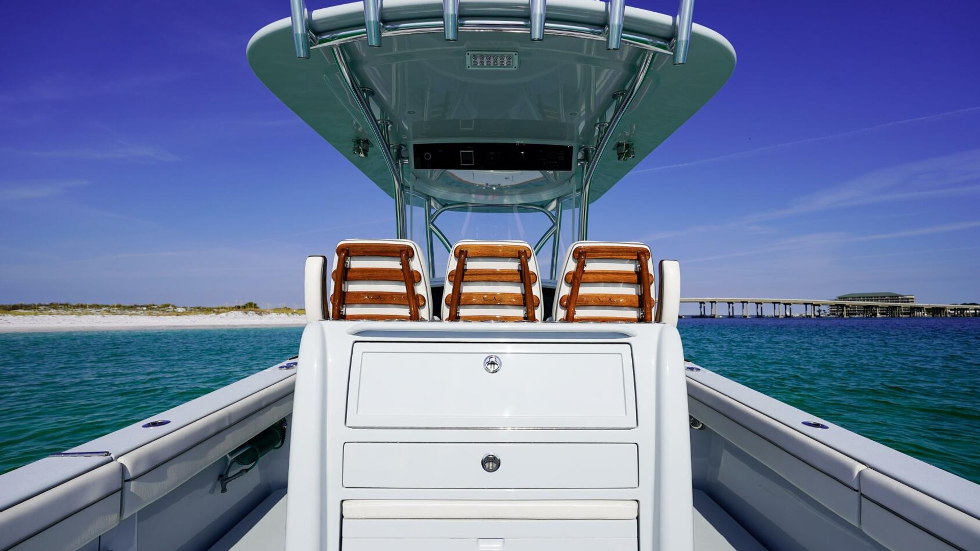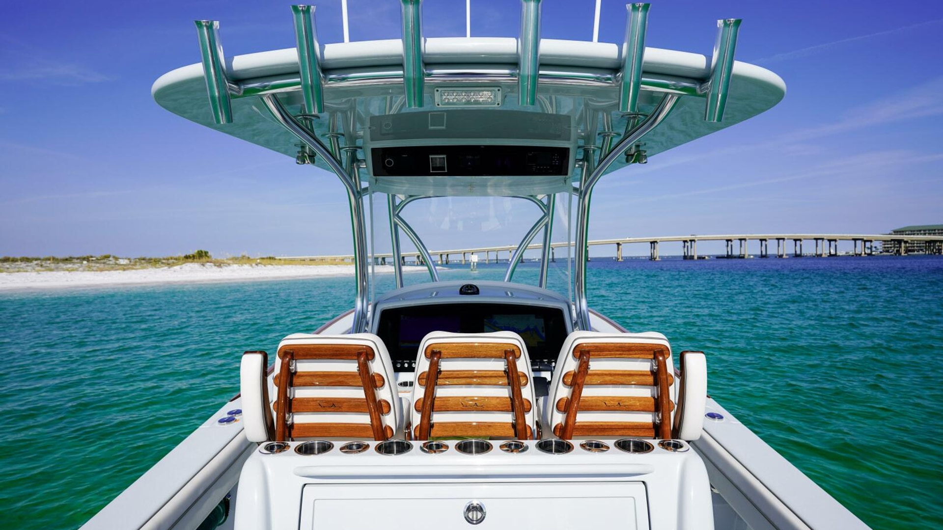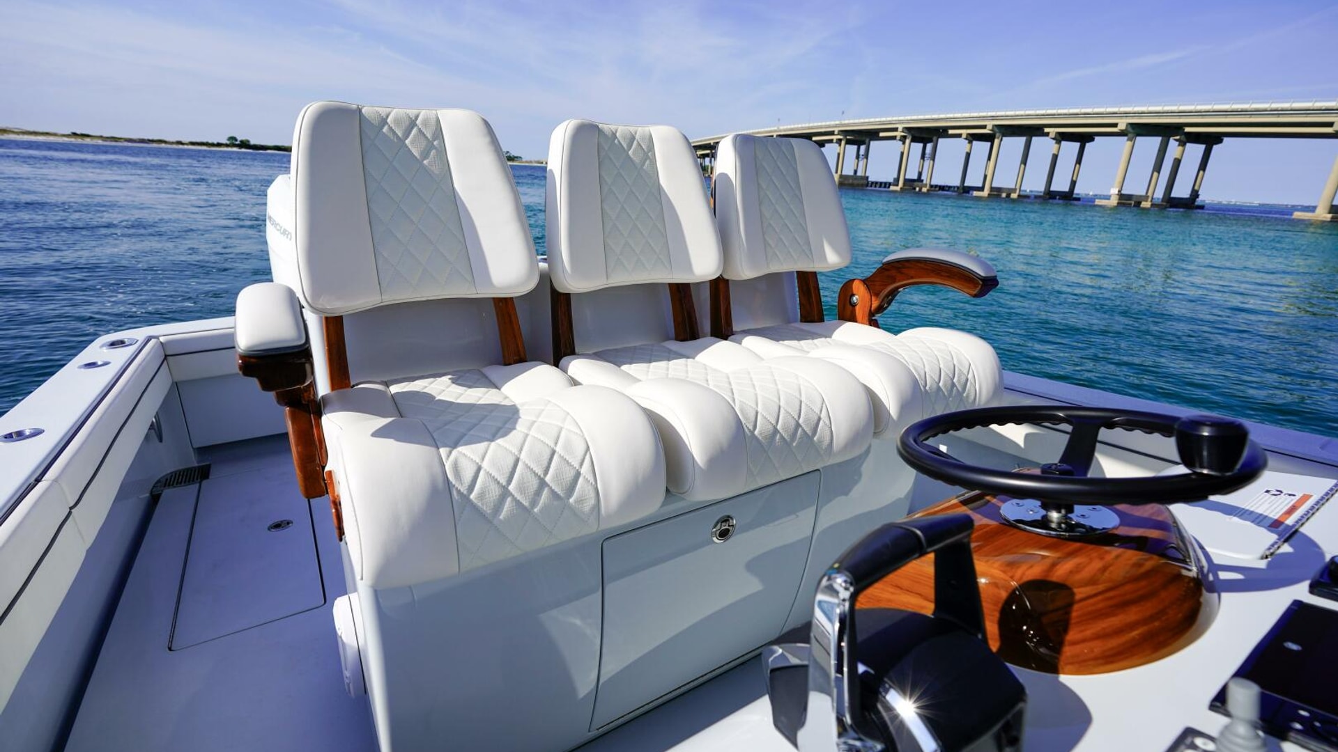A factory-installed Seakeeper keeps the boat stable and comfortable at rest, making diving, swimming, and hanging out at the sandbar a completely different experience. Outriggers, a diver door with ladder, and a Release helm bench put her squarely in the serious sportfish / adventure boat category, while the forward seat backrest keeps guests comfortable underway.