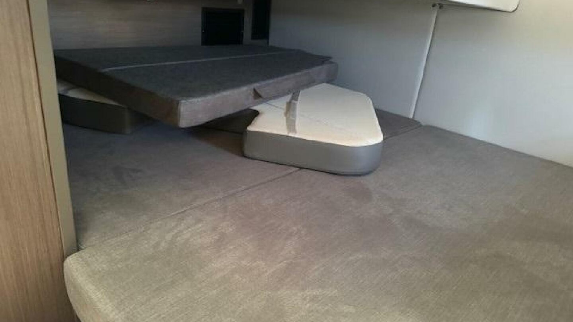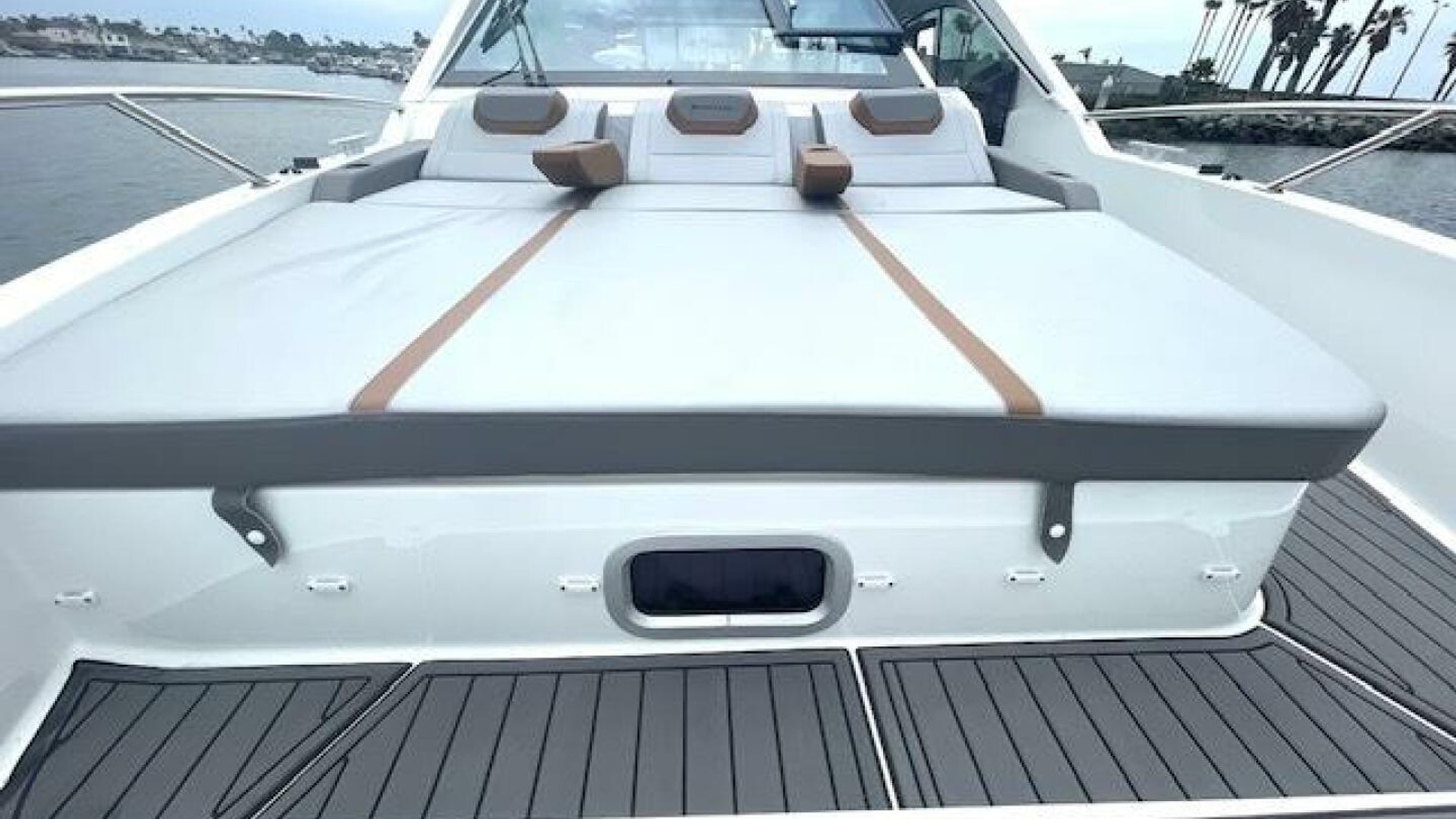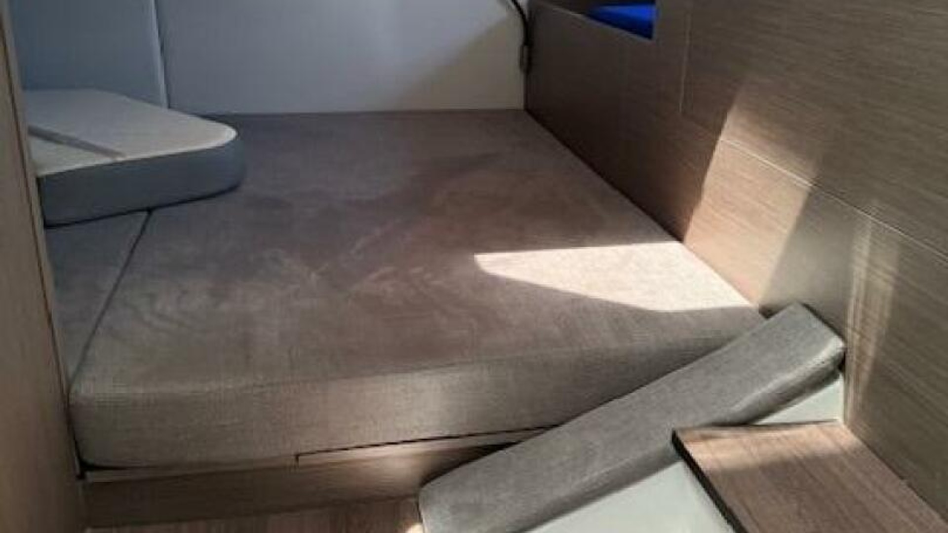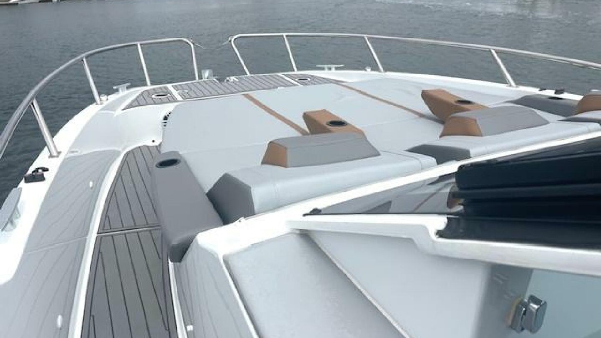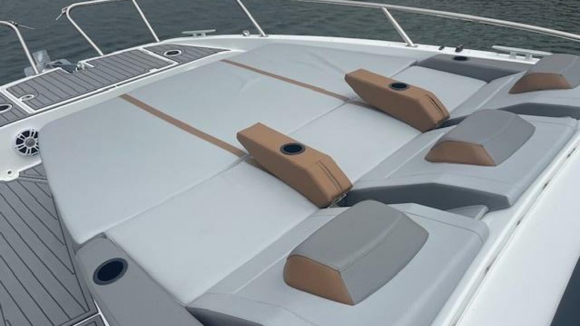In the cockpit, the full beam layout of the Gran Turismo 32 allows for the best use of space. The back rest of the lounger seat and the aft bench tip back to create a large sunbathing area. To the bow, a sunbed for 3 people is safely and easily accessible by the semi-walkaround.