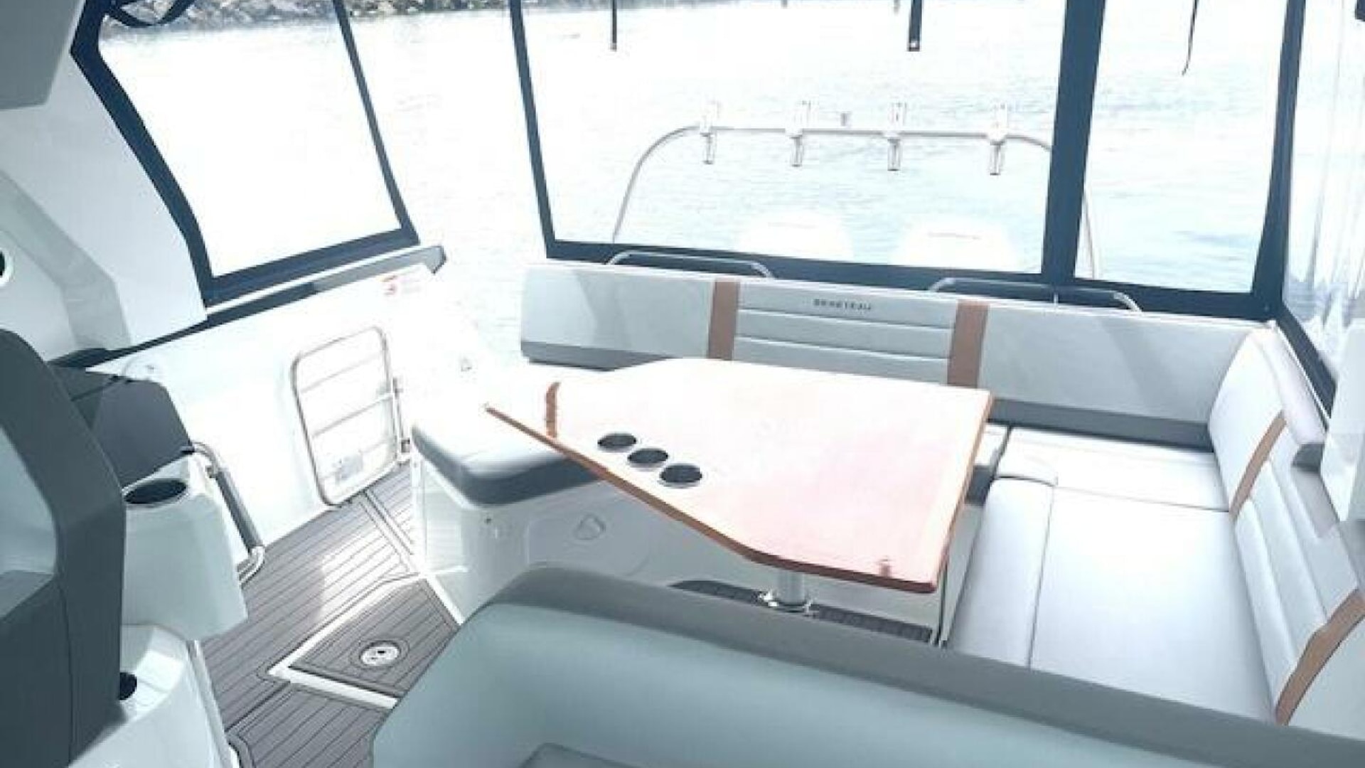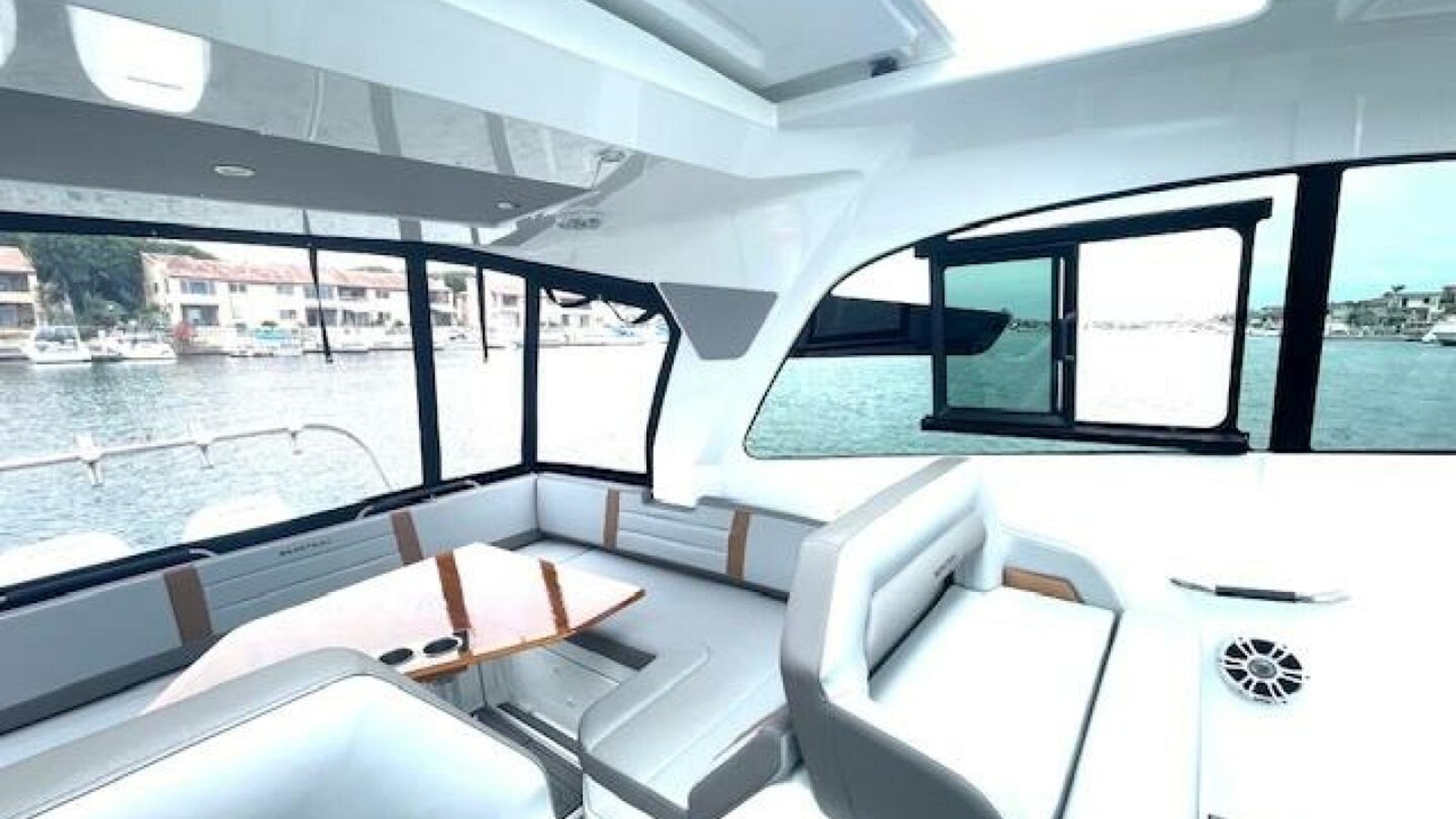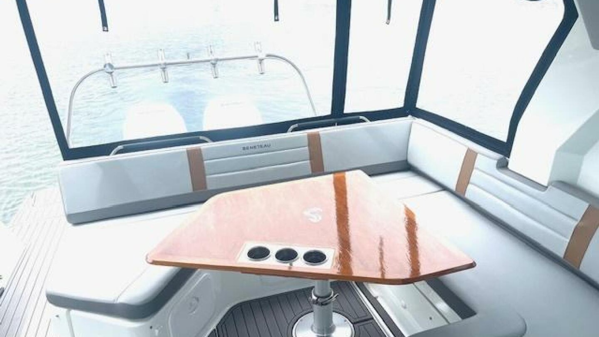With a panoramic windshield, its opening hard top provides optimal vision underway. At the helm, two bolster seats behind the console are supplemented to port by a double bench seat, allowing four people to share the pleasures of facing the sea while underway.