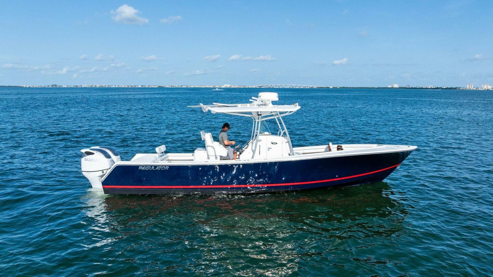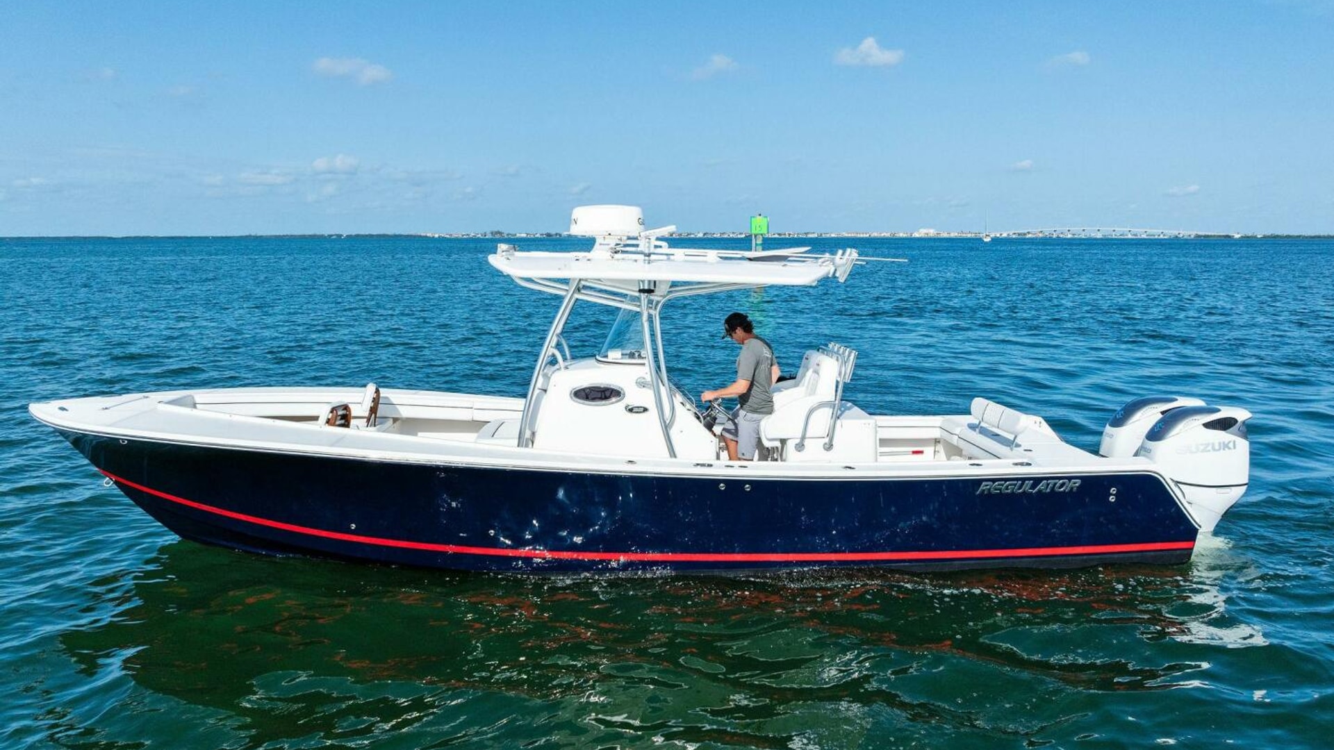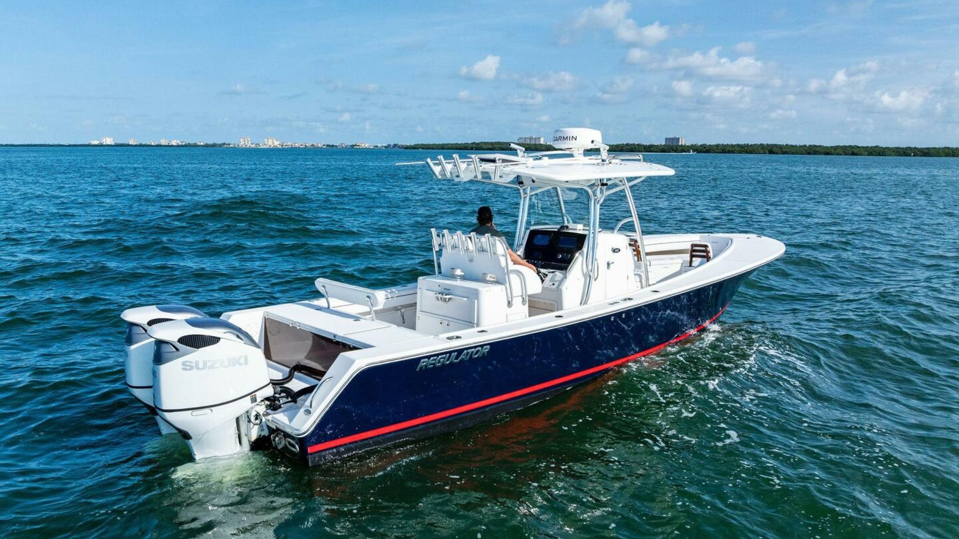 Don’t miss this beautifully refreshed and highly updated 2012 Regulator 32 FS. Known for its exceptional ride and build quality, the 32 FS features a 24-degree deadrise and a solid fiberglass bottom, delivering a smooth, confident ride in all conditions. In 2023, this vessel was completely repowered with twin 350HP Suzuki Dual Prop engines, offering quiet, efficient, and reliable performance. Electronic updates in 2023 include (2) Garmin 8612 Displays, Garmin Fantom 24X Radar, JL Audio Sound System, and Starlink. Her timeless lines are enhanced by a freshly painted (2023) Flag Blue hull and an elegant red boot stripe, which ties in beautifully with the red stitching on the upgraded upholstery (2024) throughout. Offered for sale with a 2023 Continental Trailer, this 32 Regulator is ready for her next adventure. *Name Reserved*