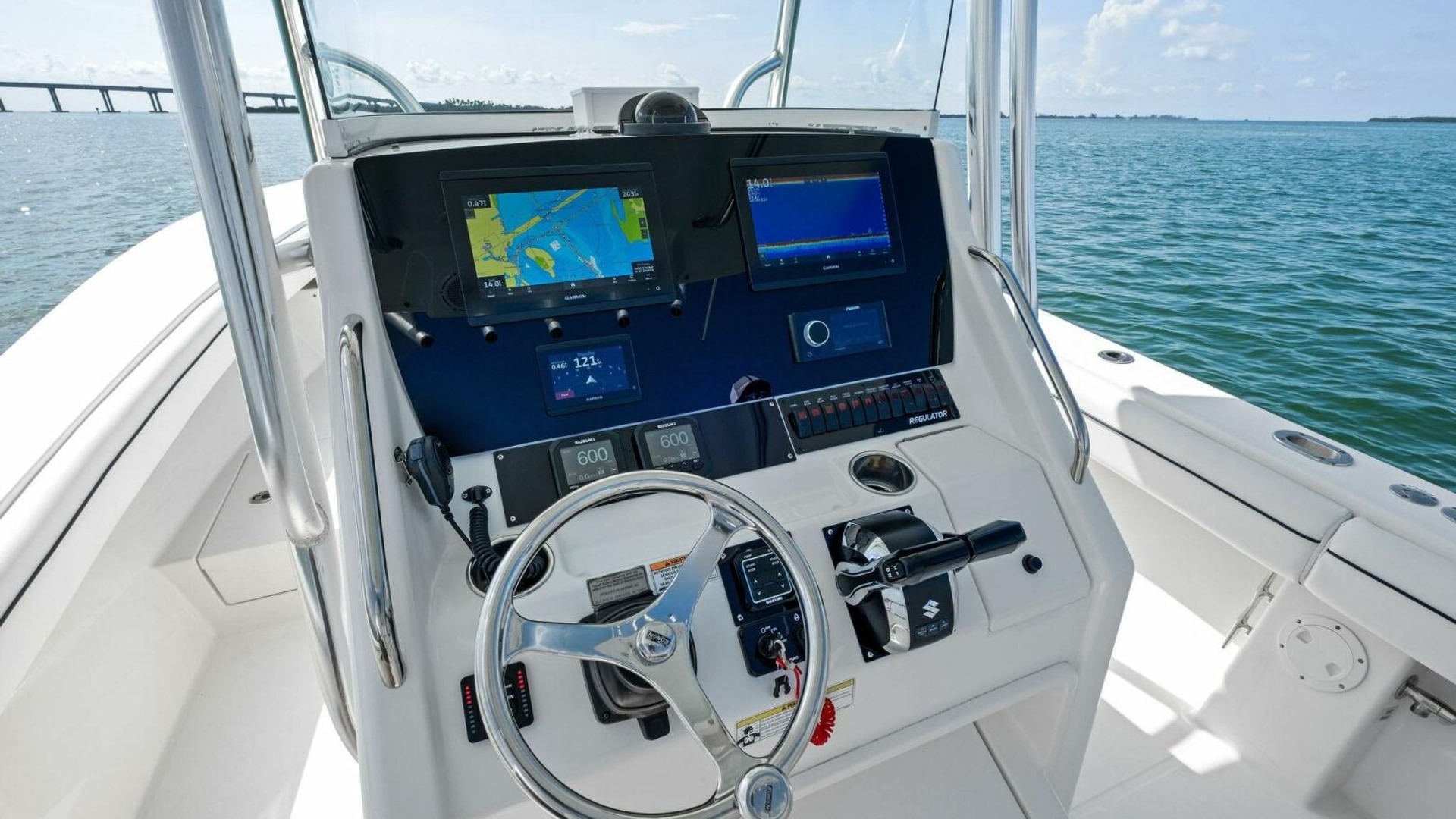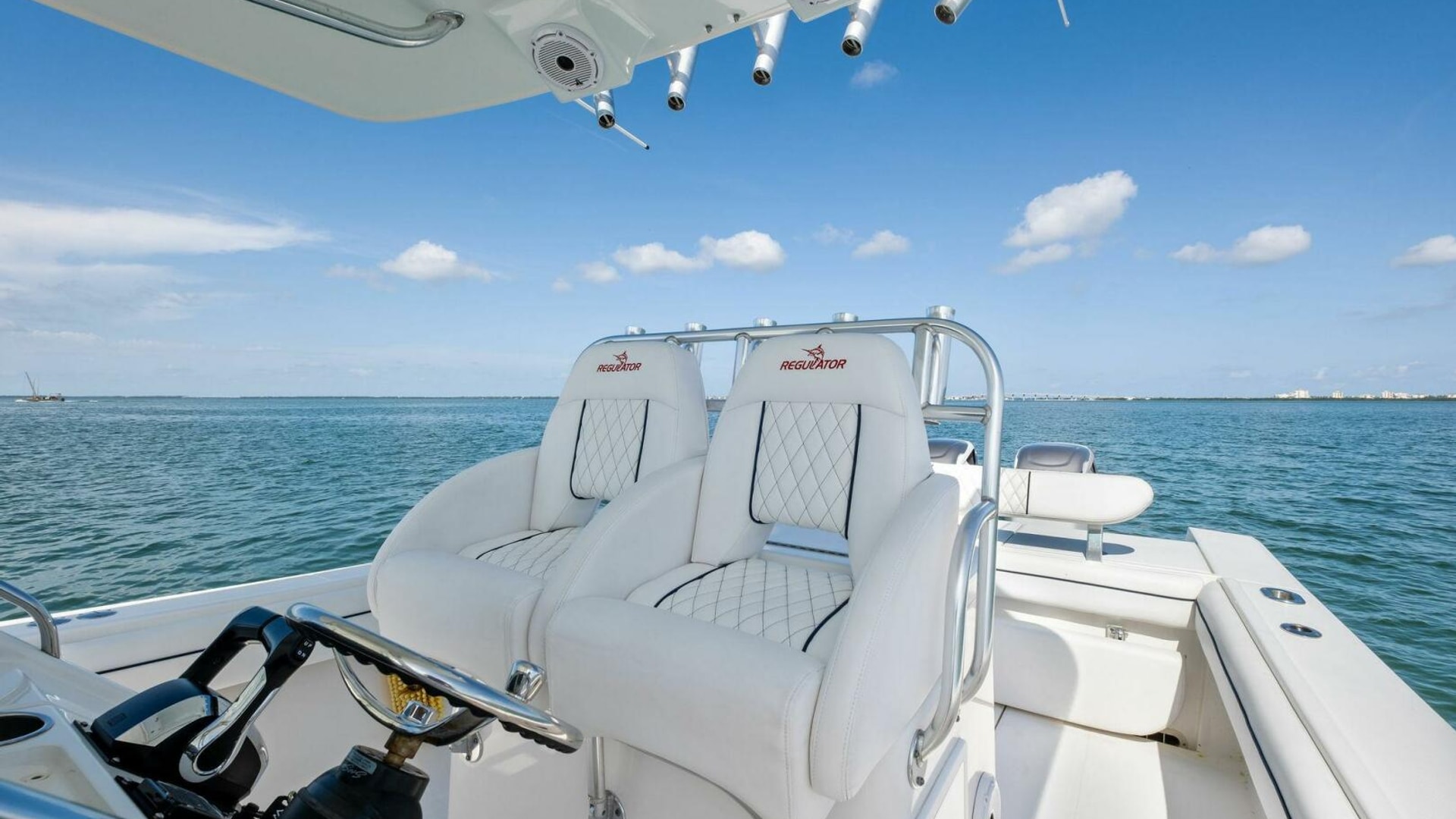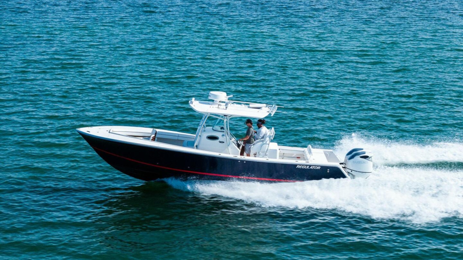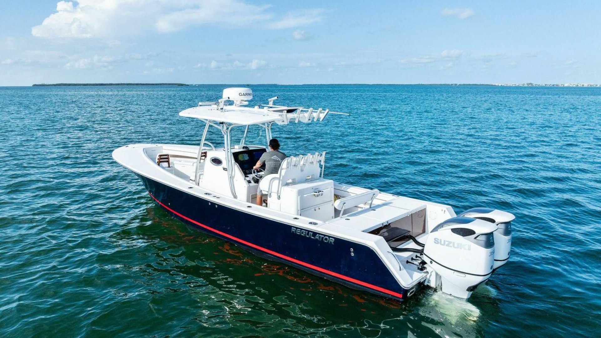 Don’t miss this beautifully refreshed and highly updated 2012 Regulator 32 FS. Known for its exceptional ride and build quality, the 32 FS features a 24-degree deadrise and a solid fiberglass bottom, delivering a smooth, confident ride in all conditions. In 2023, this vessel was completely repowered with twin 350HP Suzuki Dual Prop engines, offering quiet, efficient, and reliable performance. Electronic updates in 2023 include (2) Garmin 8612 Displays, Garmin Fantom 24X Radar, JL Audio Sound System, and Starlink. Her timeless lines are enhanced by a freshly painted (2023) Flag Blue hull and an elegant red boot stripe, which ties in beautifully with the red stitching on the upgraded upholstery (2024) throughout. Offered for sale with a 2023 Continental Trailer, this 32 Regulator is ready for her next adventure. *Name Reserved*
