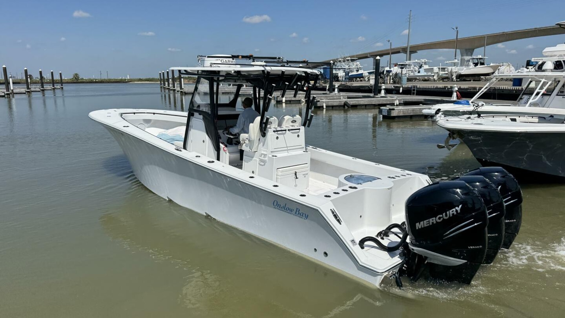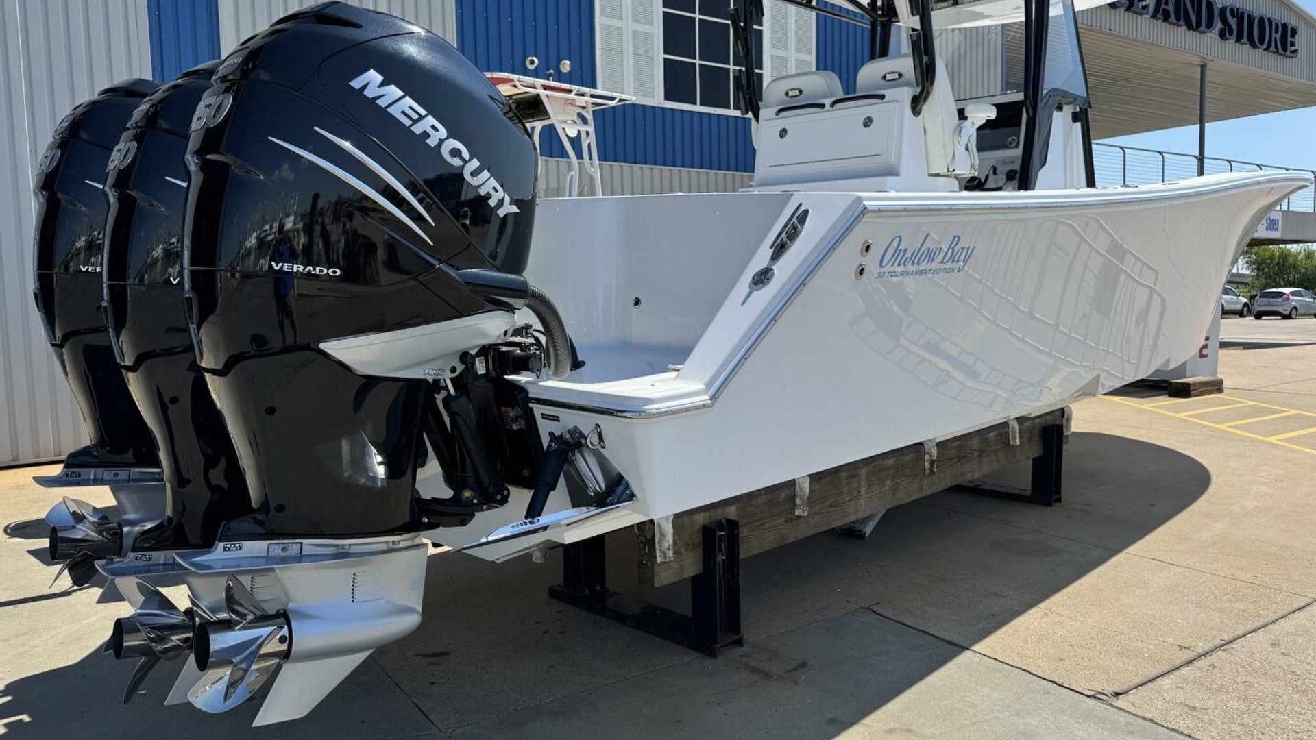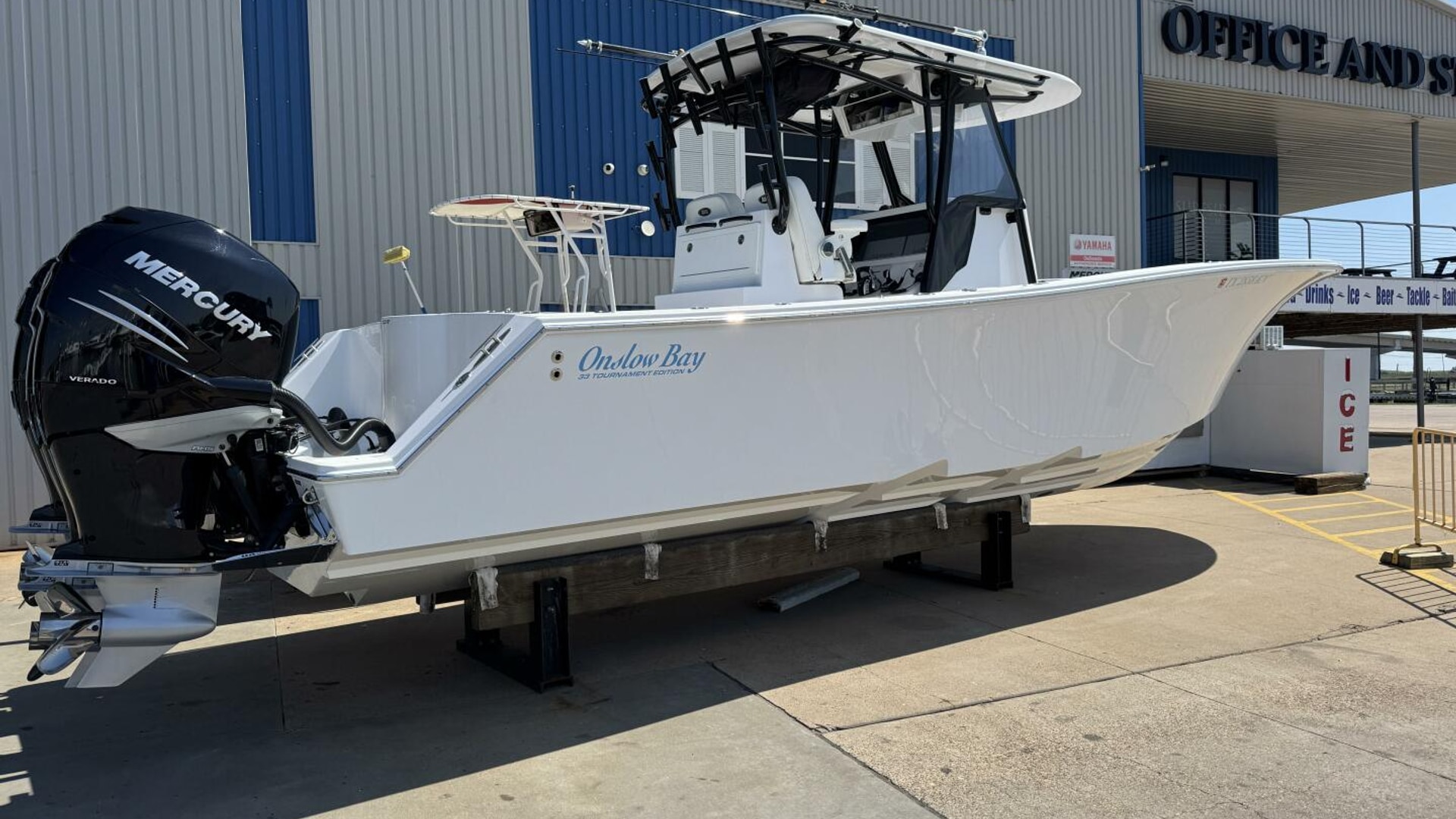 The Onslow Bay 33 Tournament Edition is a center console fishing platform that has taken ride, fishability, and performance to another level. It has a length overall of 32’10” and a beam of 9’11”. It features a Positive Lift Ventilated Step Hull that has a 24-degree deadrise at the transom. The 33 Tournament Edition planes at an amazing 16 mph with triple Mercury 350’s, and reaches a top speed around 70mph. It also has a 7-degree reverse chine and huge bow flare for the driest ride of any boat in its class. It is a 3 piece boat with a one-level deck, floor fish boxes, and a standard round 45-gallon livewell in the transom. (Onslow Bay Website)