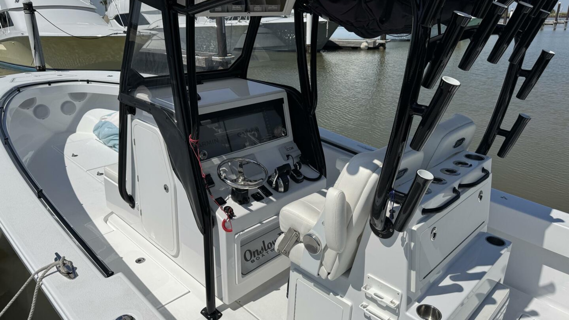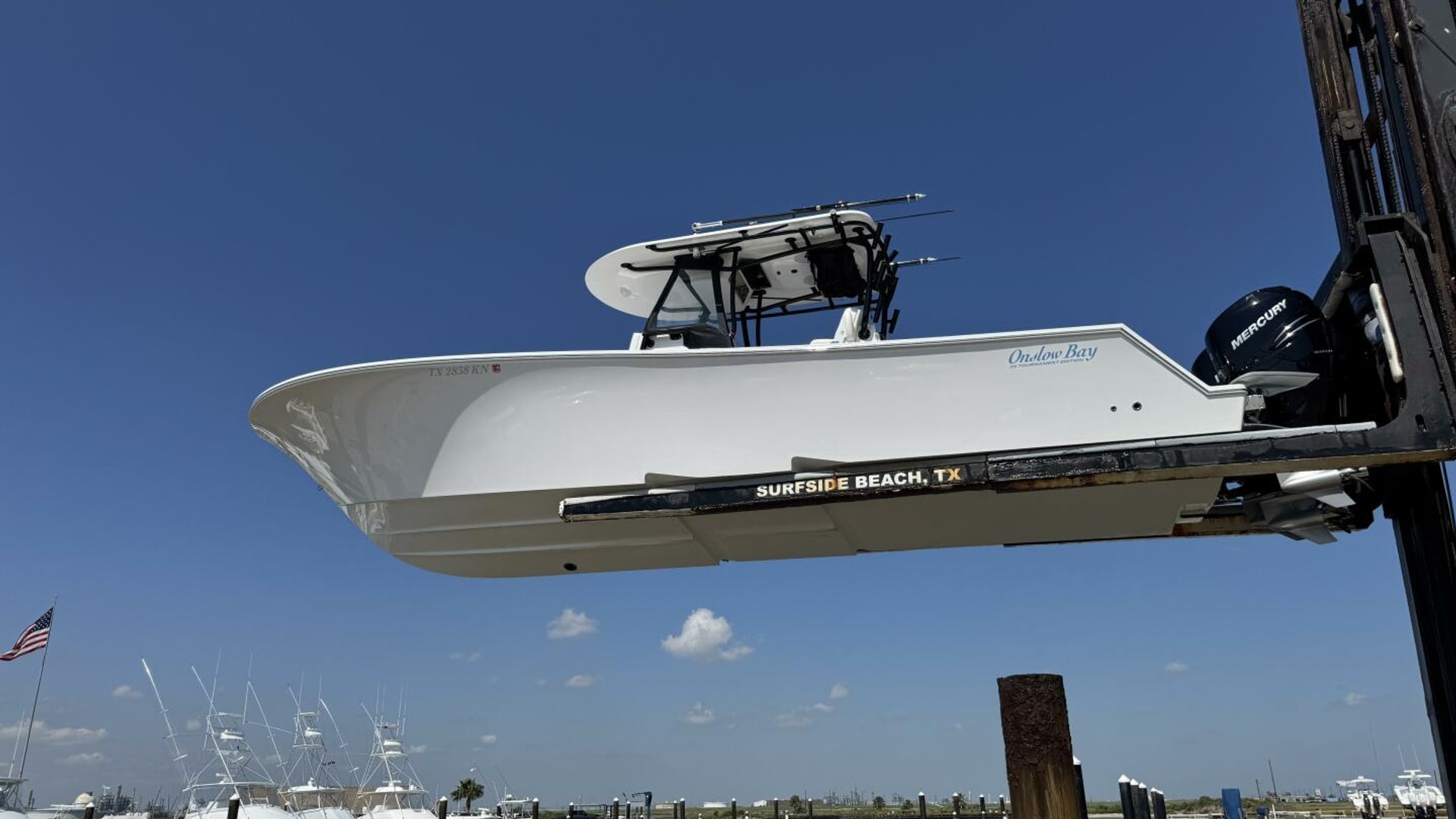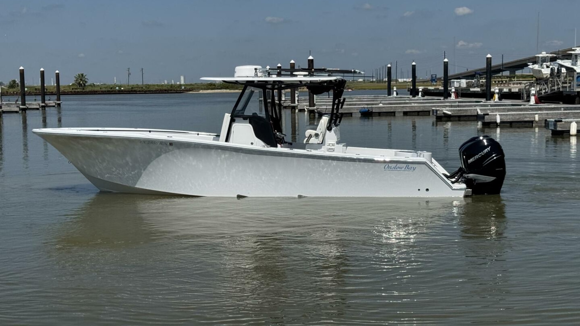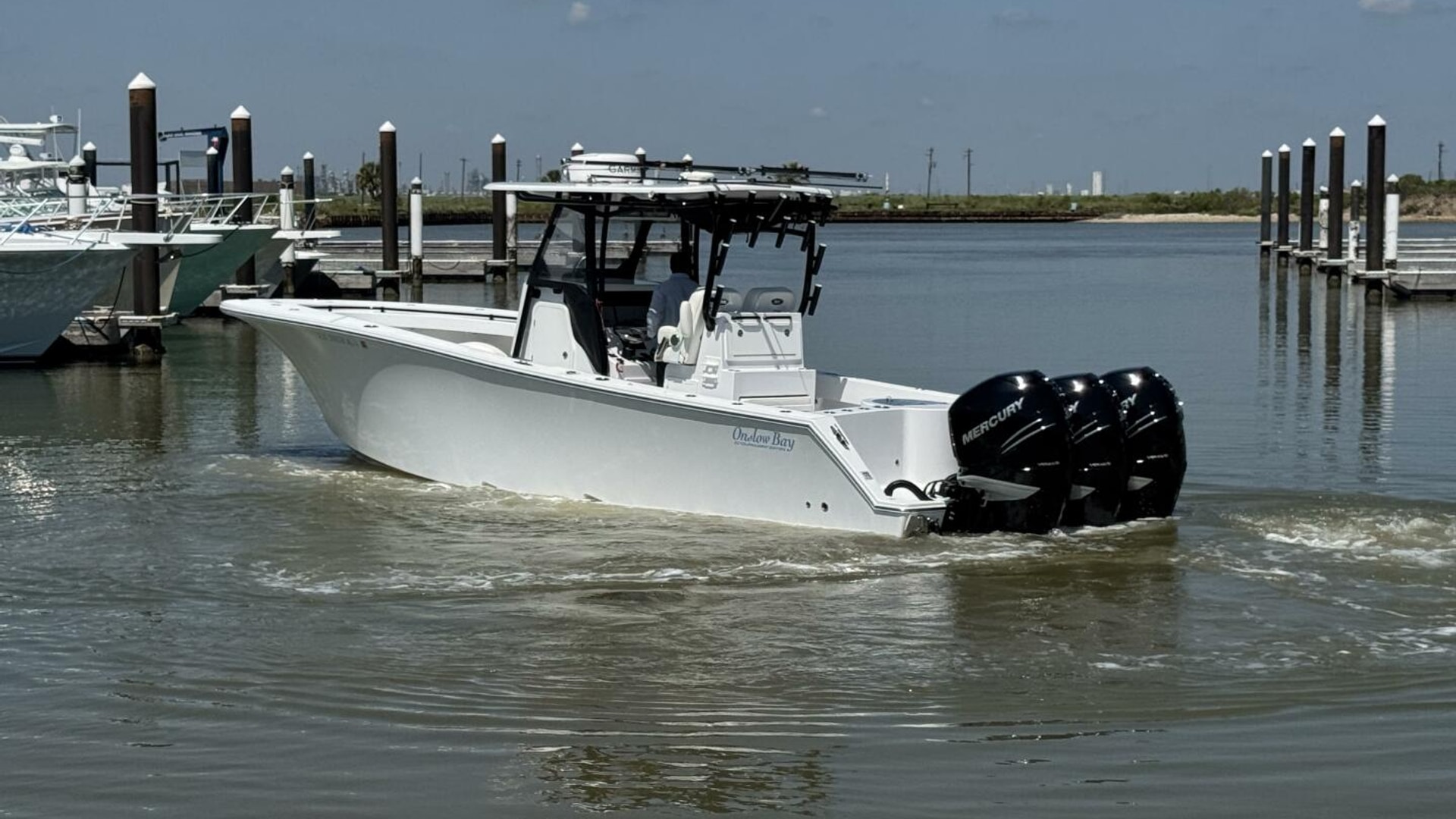 The Onslow Bay 33 Tournament Edition is a center console fishing platform that has taken ride, fishability, and performance to another level. It has a length overall of 32’10” and a beam of 9’11”. It features a Positive Lift Ventilated Step Hull that has a 24-degree deadrise at the transom. The 33 Tournament Edition planes at an amazing 16 mph with triple Mercury 350’s, and reaches a top speed around 70mph. It also has a 7-degree reverse chine and huge bow flare for the driest ride of any boat in its class. It is a 3 piece boat with a one-level deck, floor fish boxes, and a standard round 45-gallon livewell in the transom. (Onslow Bay Website)