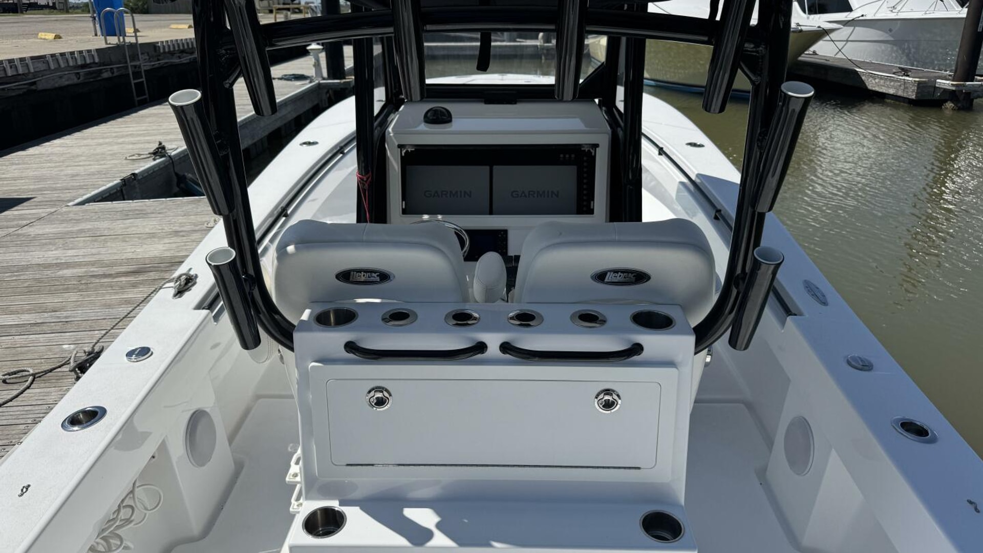 - Aluminum T-top with fiberglass hardtop, LED spreader lights, rod holders, and electronics box