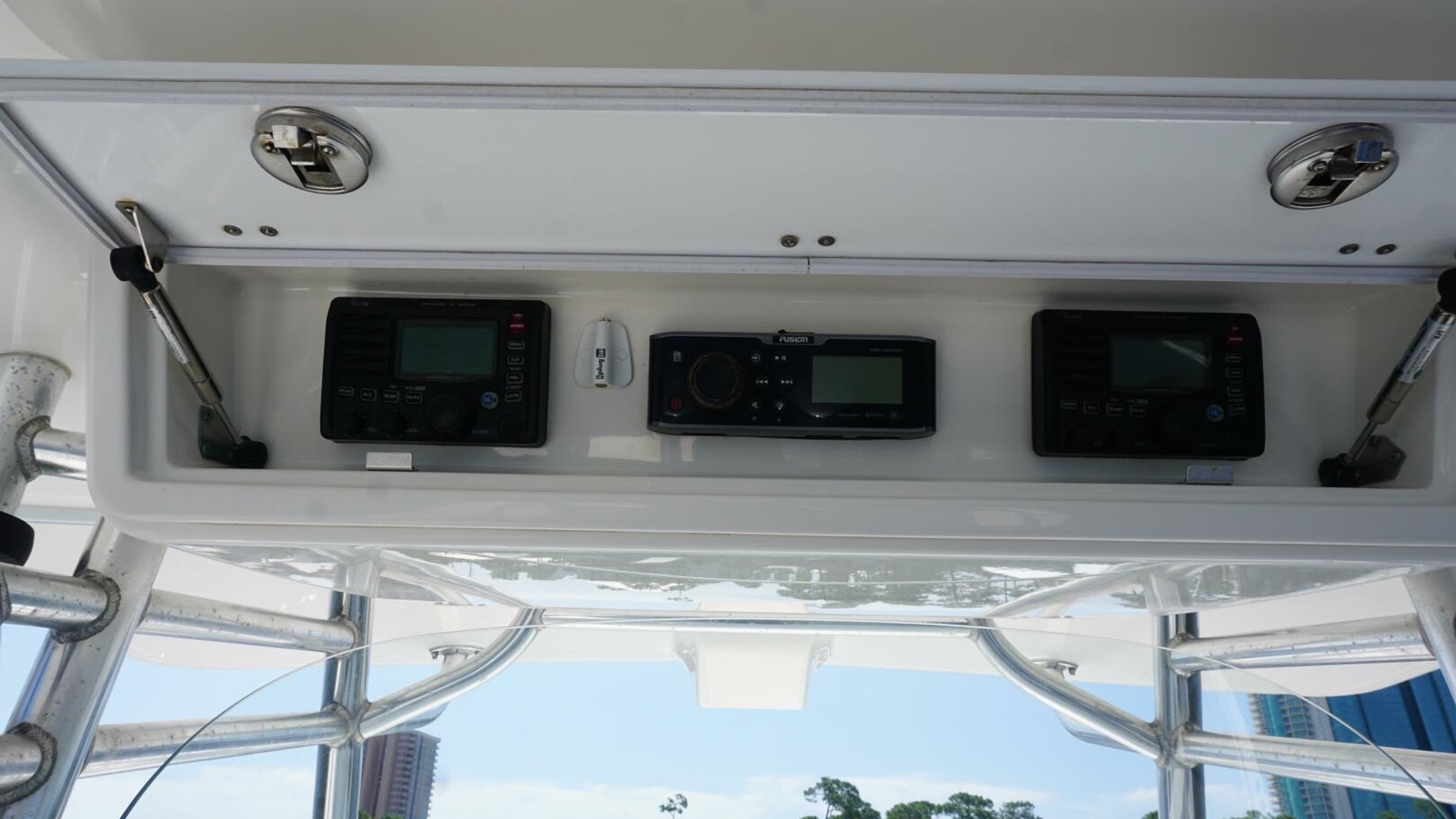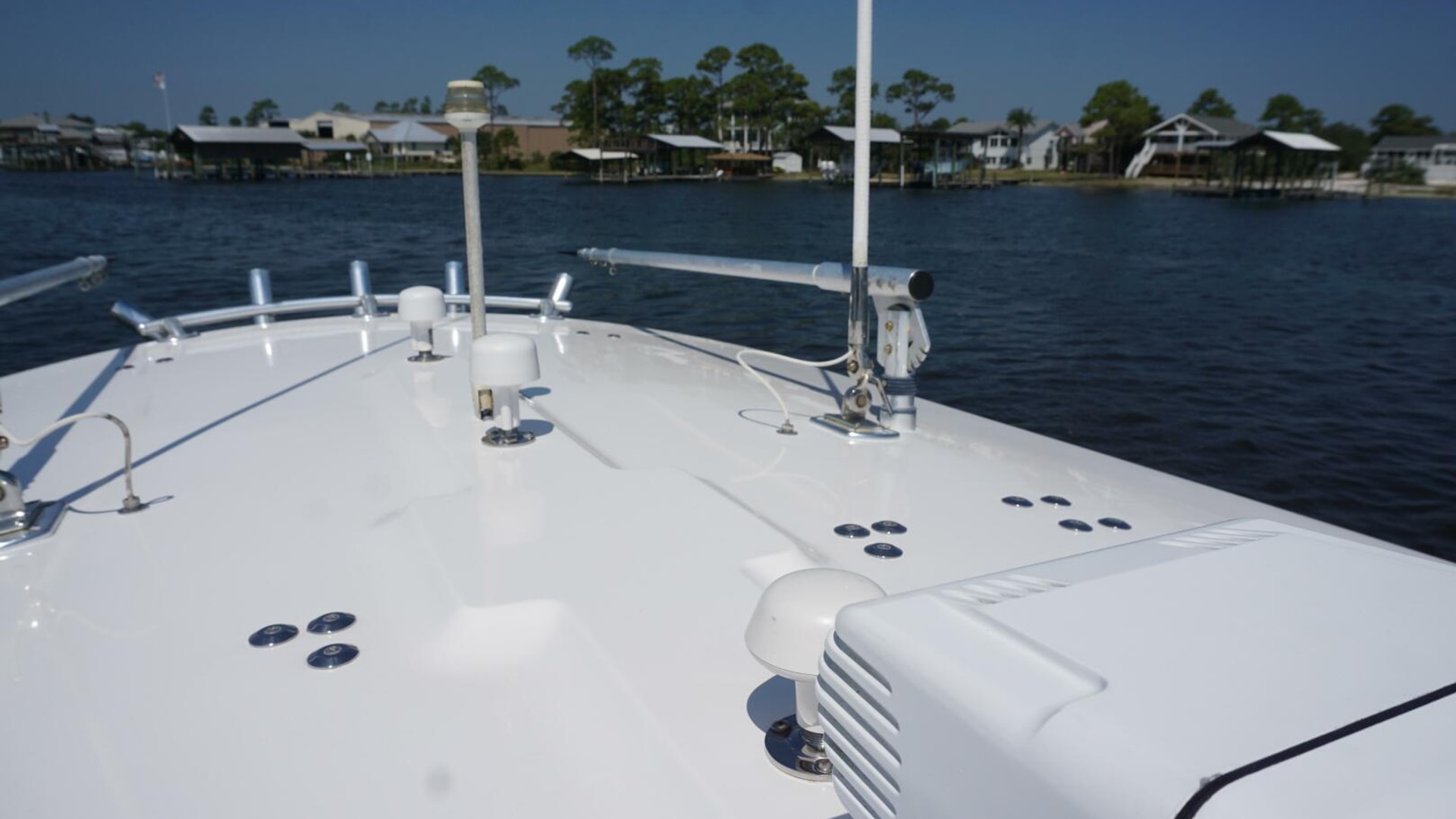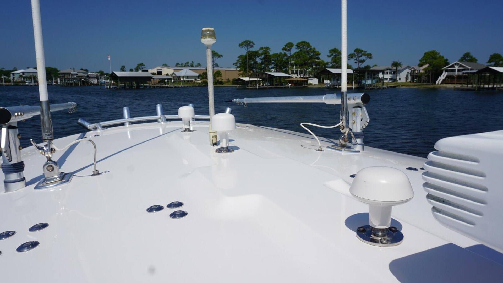 - Molded Fiberglass T-Top, Electronics Box, 5 Rod Rocket Launcher, Forward Spreader Light, Aft Spreader Light