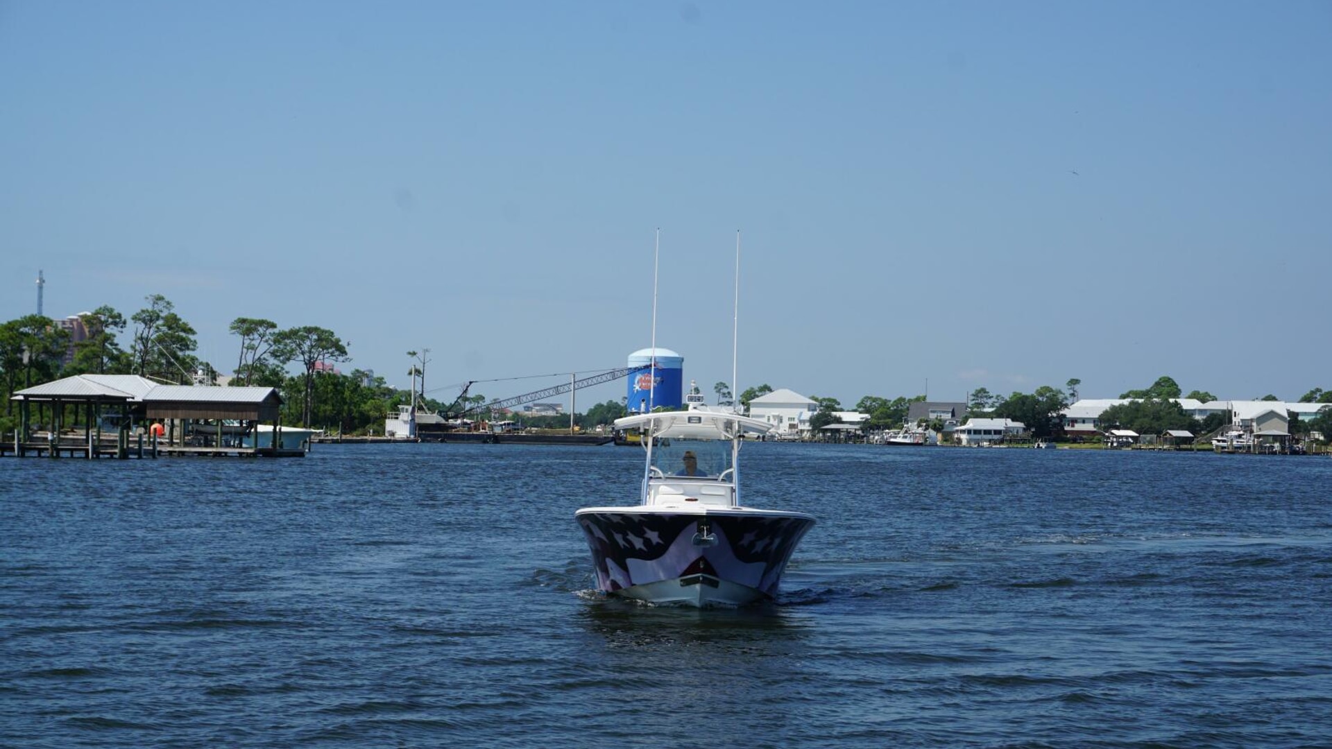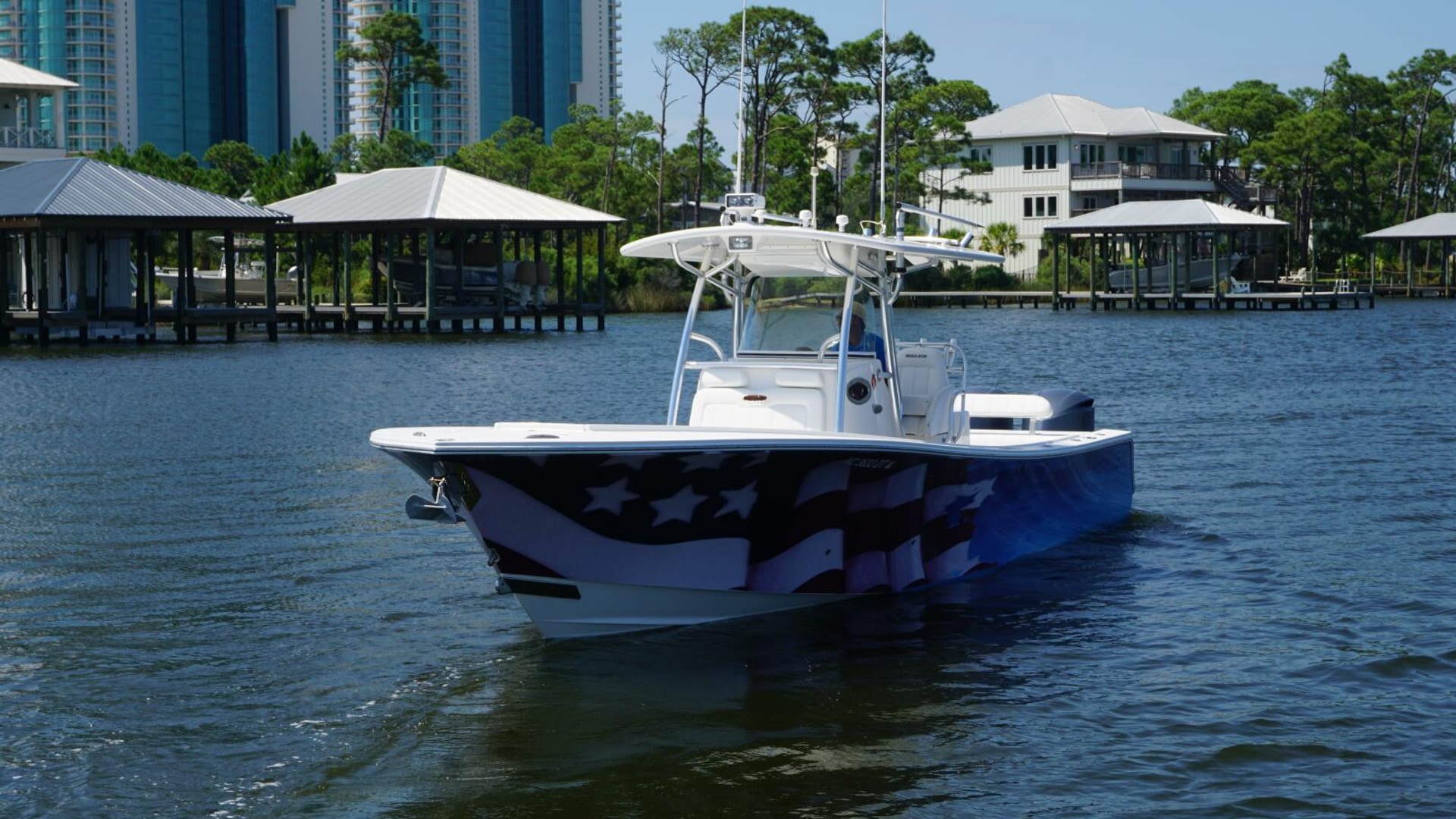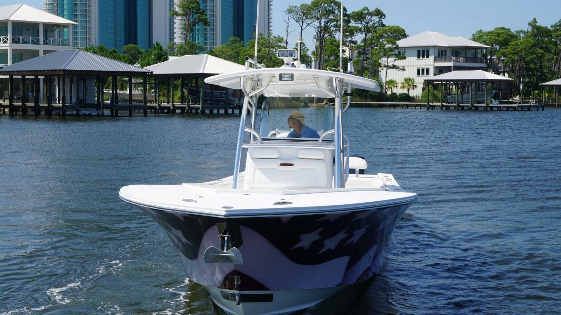 - Molded Fiberglass T-Top, Electronics Box, 5 Rod Rocket Launcher, Forward Spreader Light, Aft Spreader Light