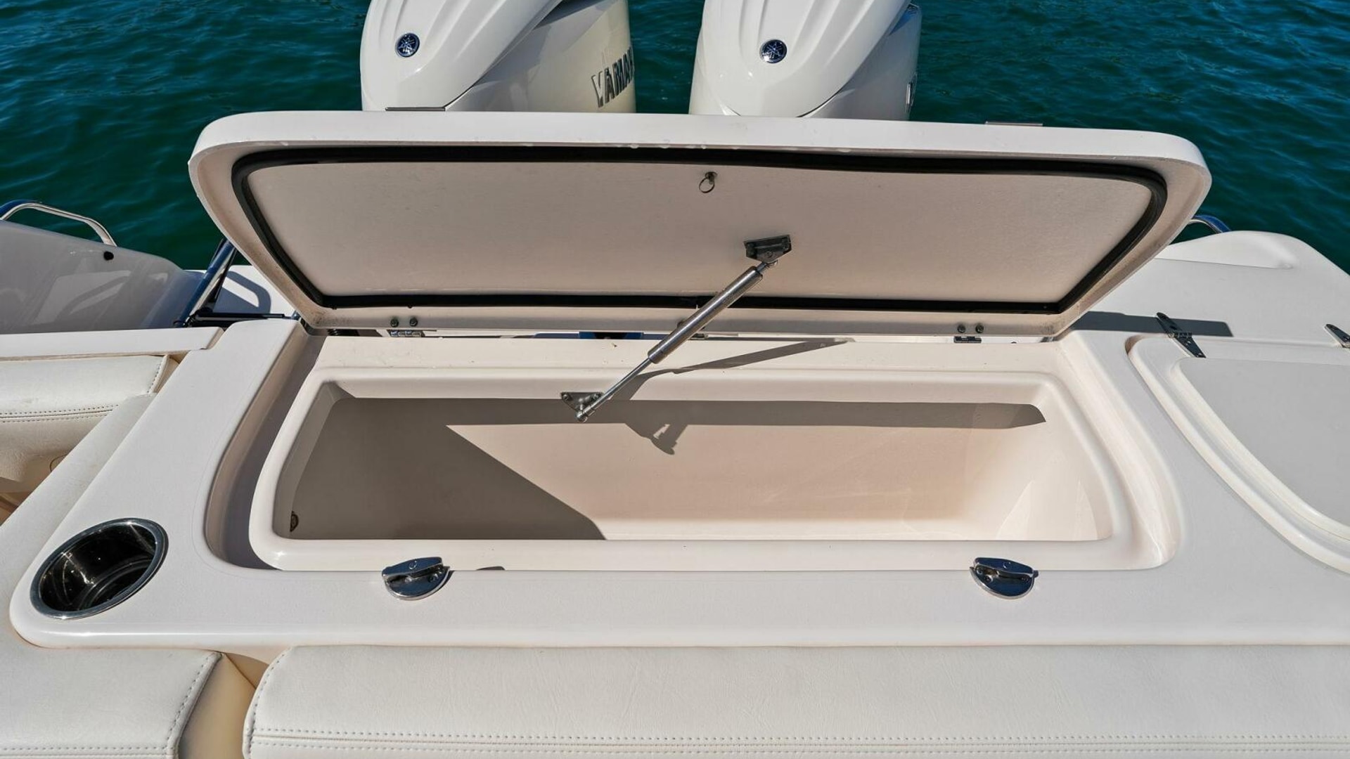 - Deluxe fiberglass hardtop with LED lighting, rod holders & integrated stereo speakers