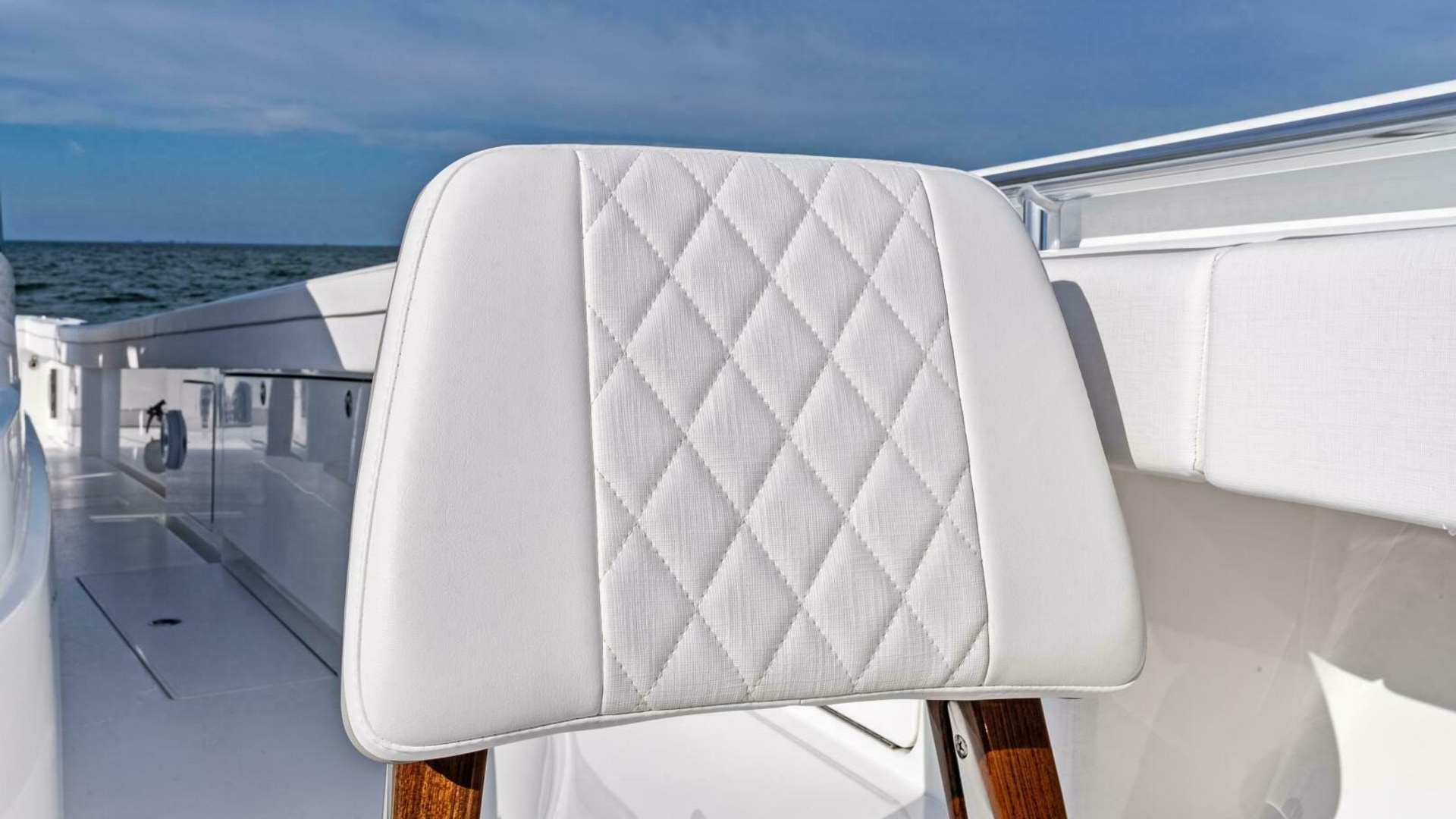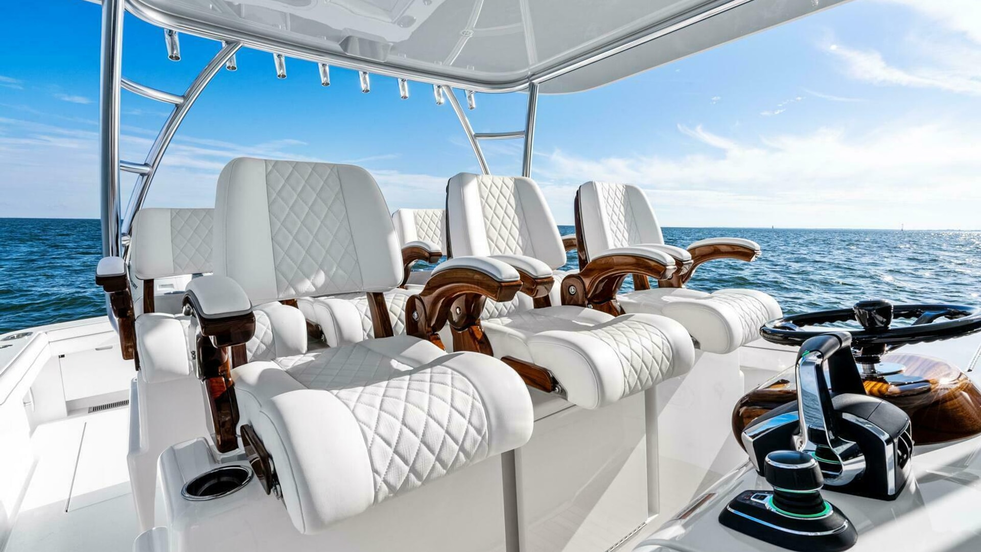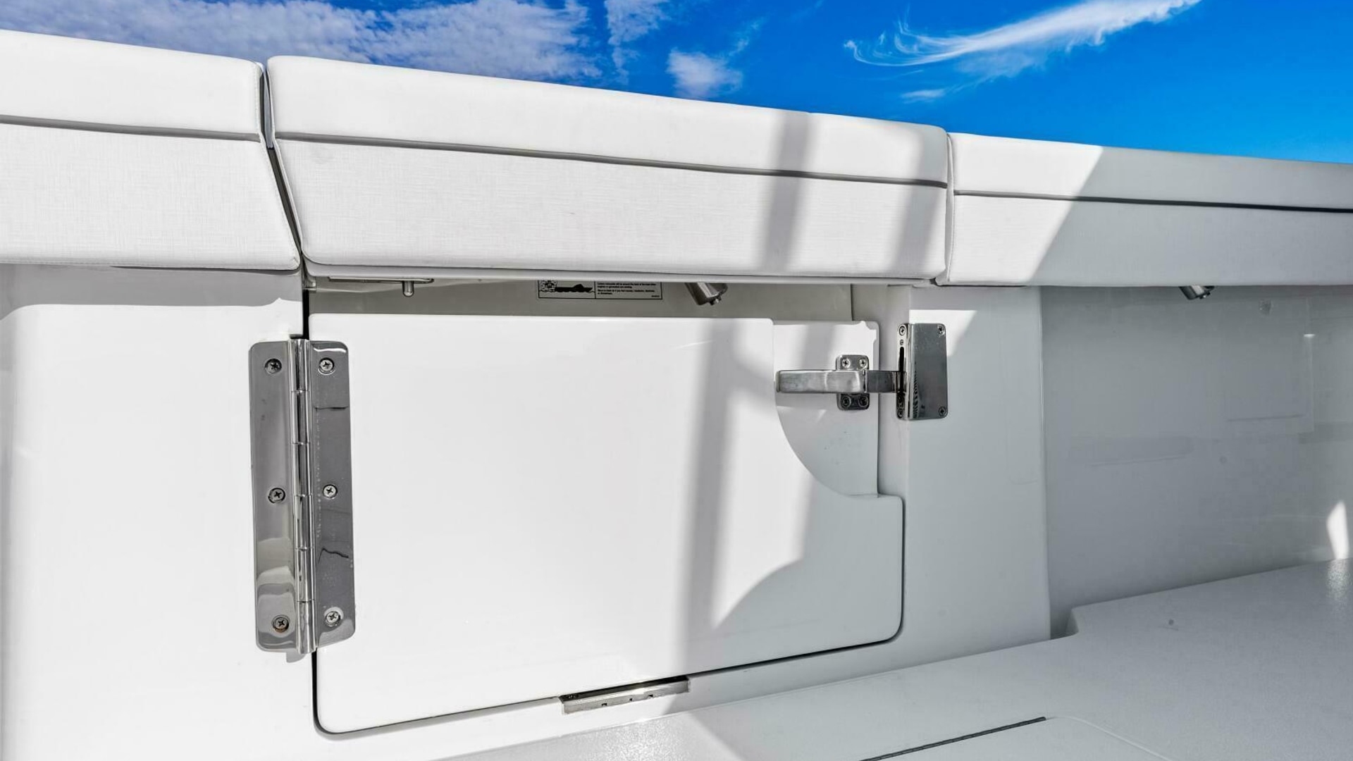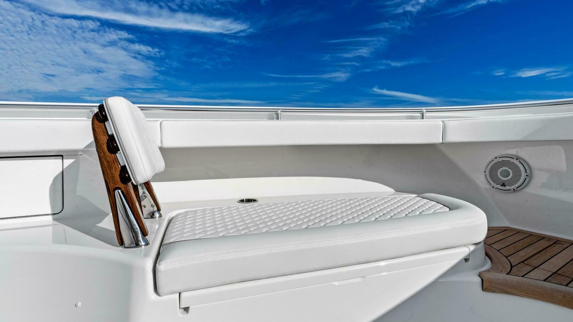 • Durable white outdoor upholstery for console lounge, bench seating, coaming bolsters and cockpit cooler seating