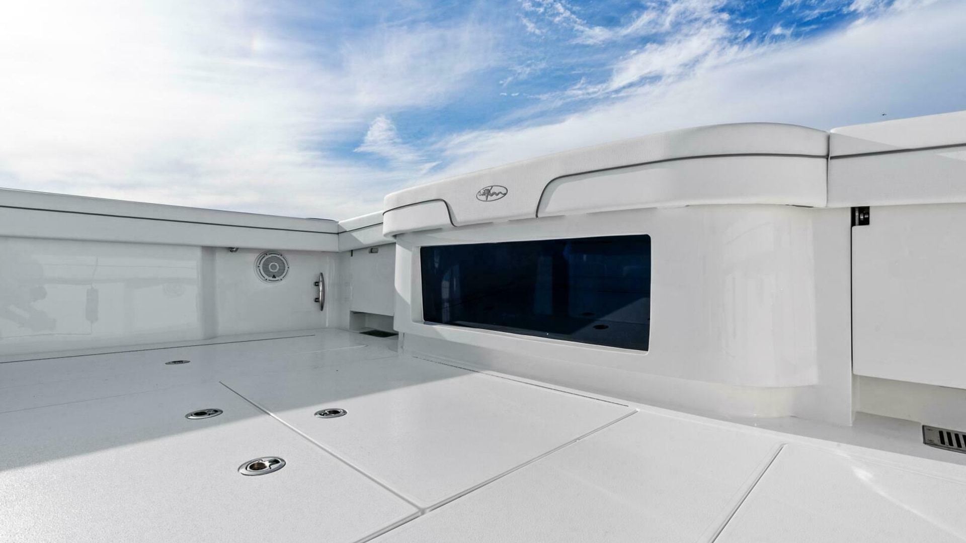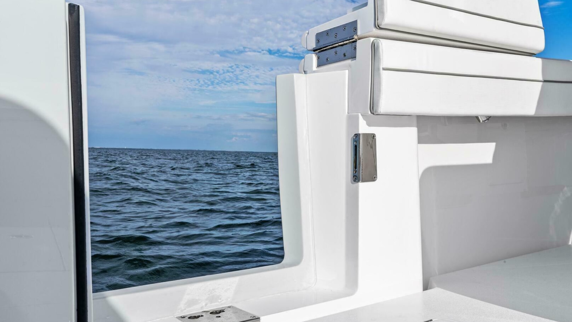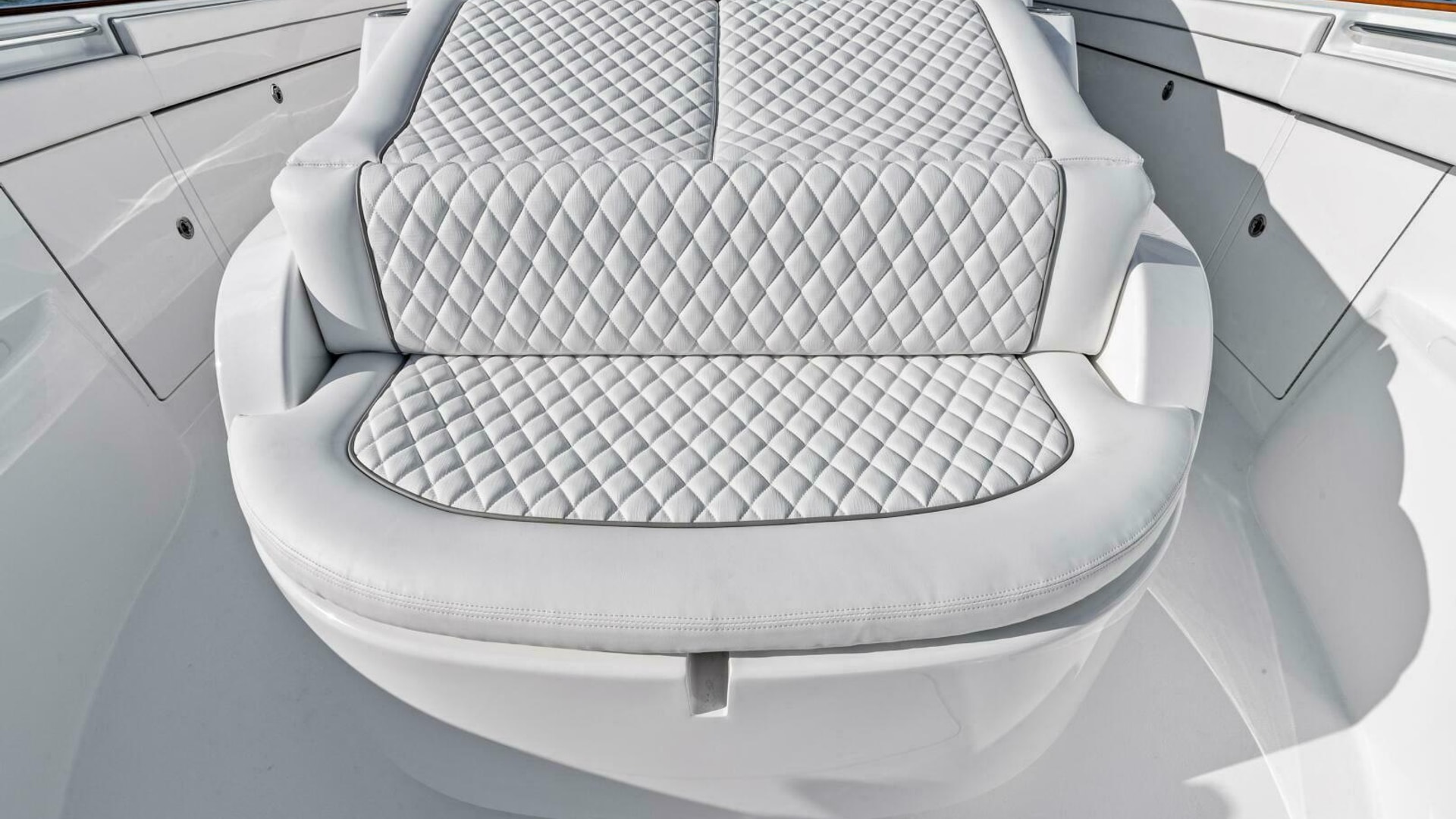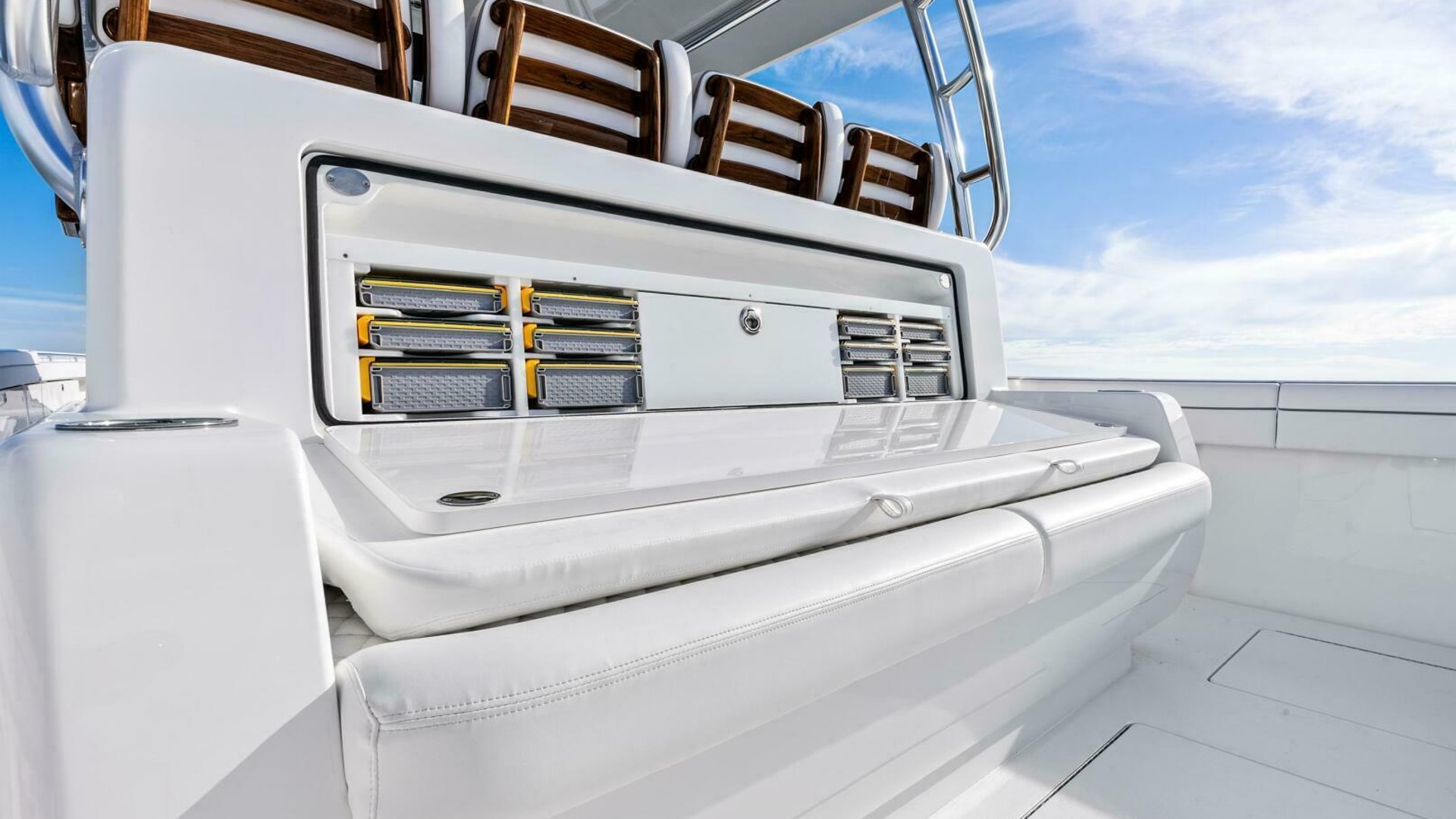 • Durable white outdoor upholstery for console lounge, bench seating, coaming bolsters and cockpit cooler seating