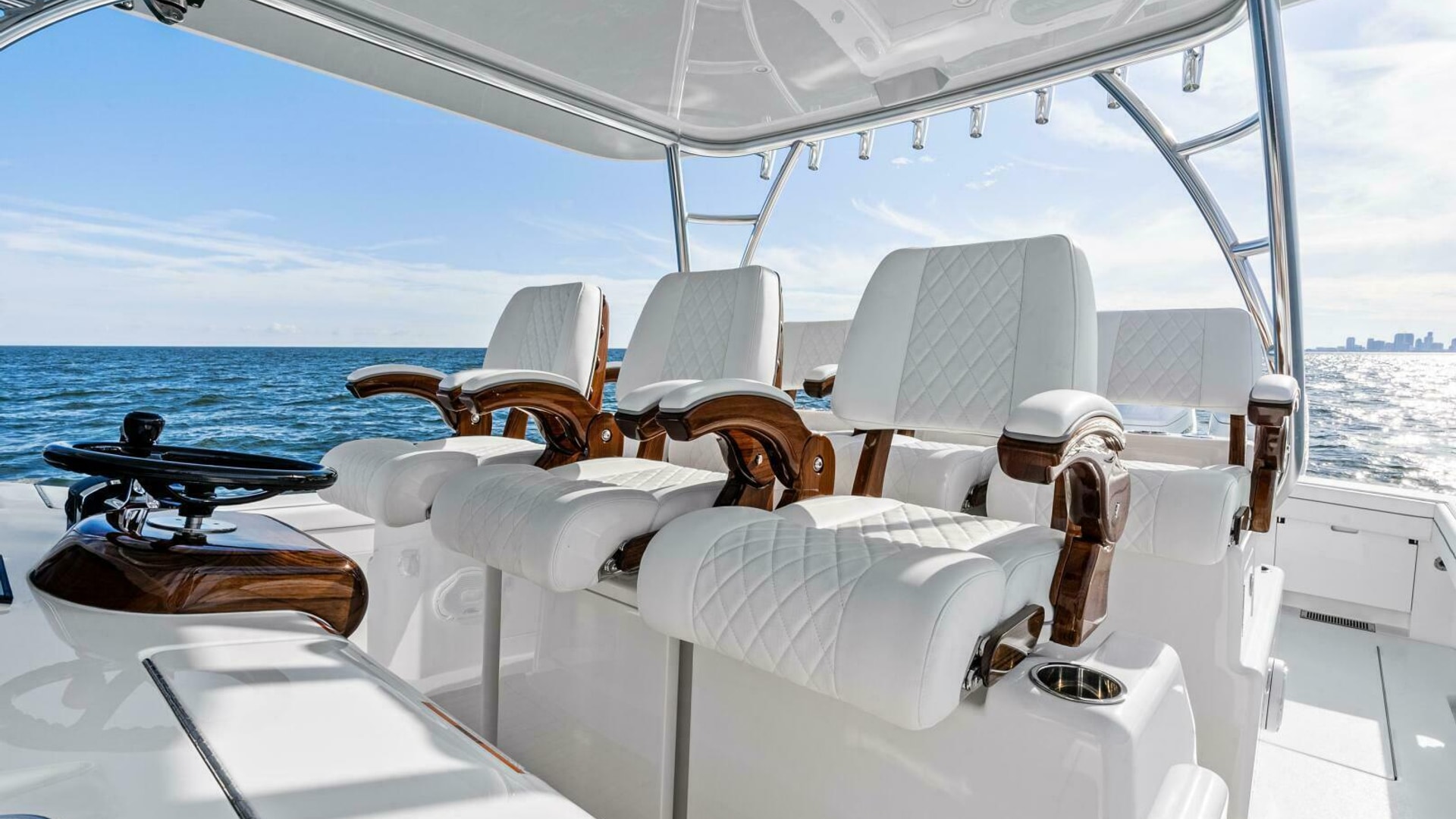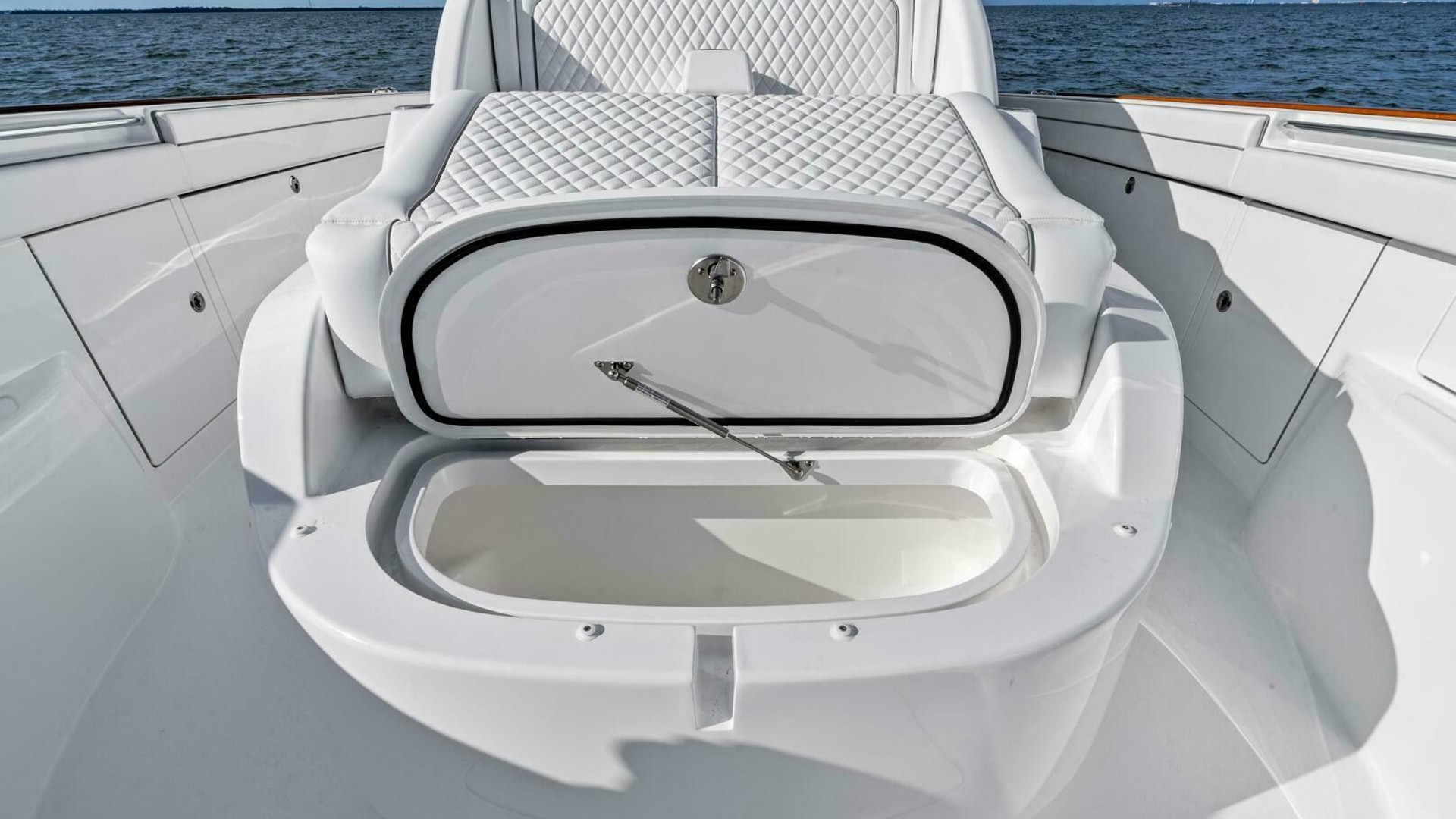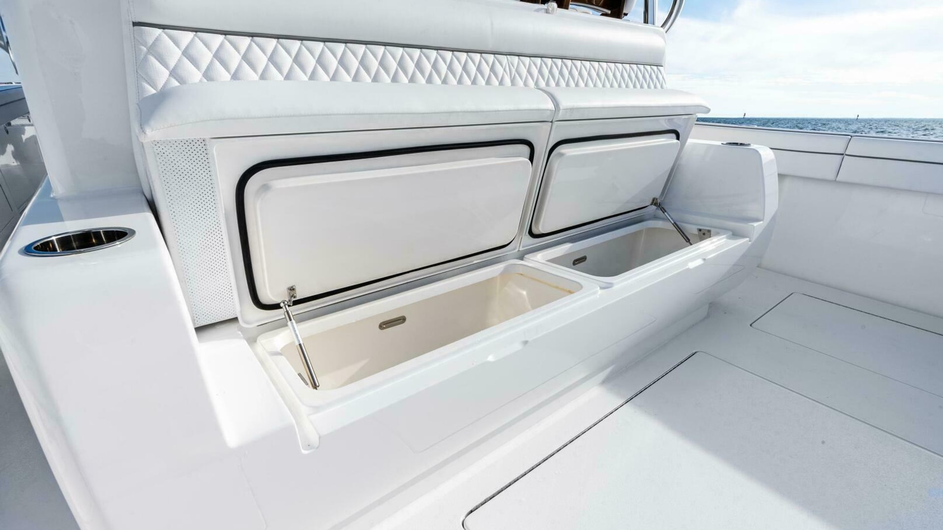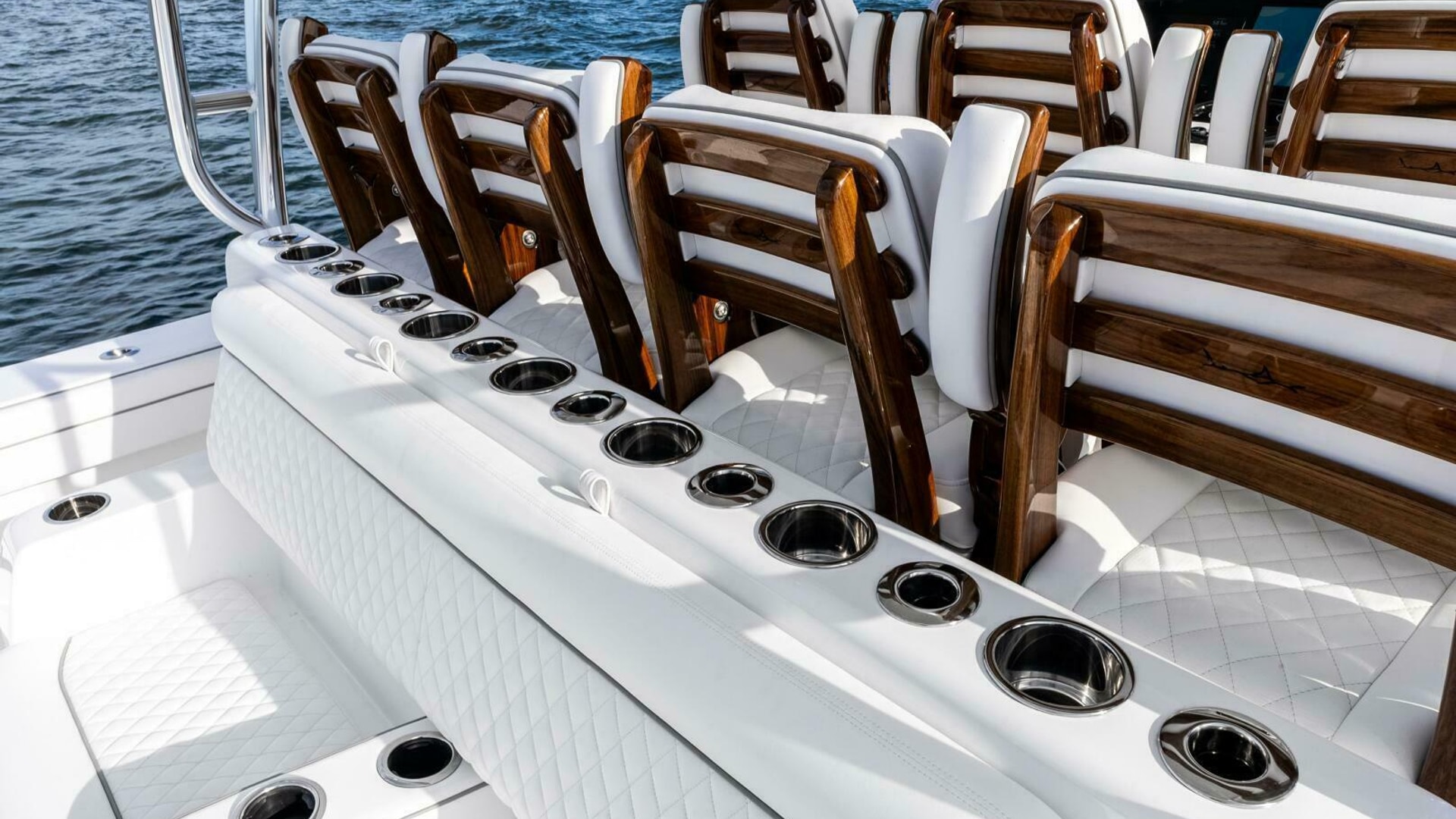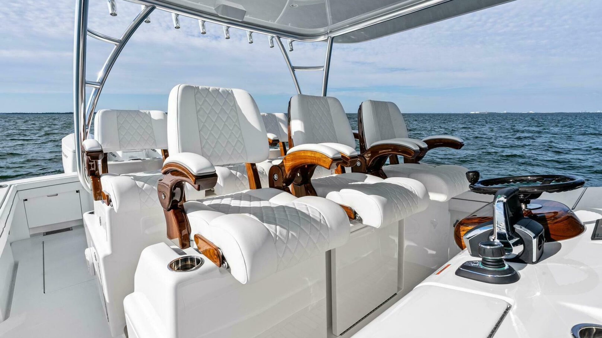 • Durable white outdoor upholstery for console lounge, bench seating, coaming bolsters and cockpit cooler seating