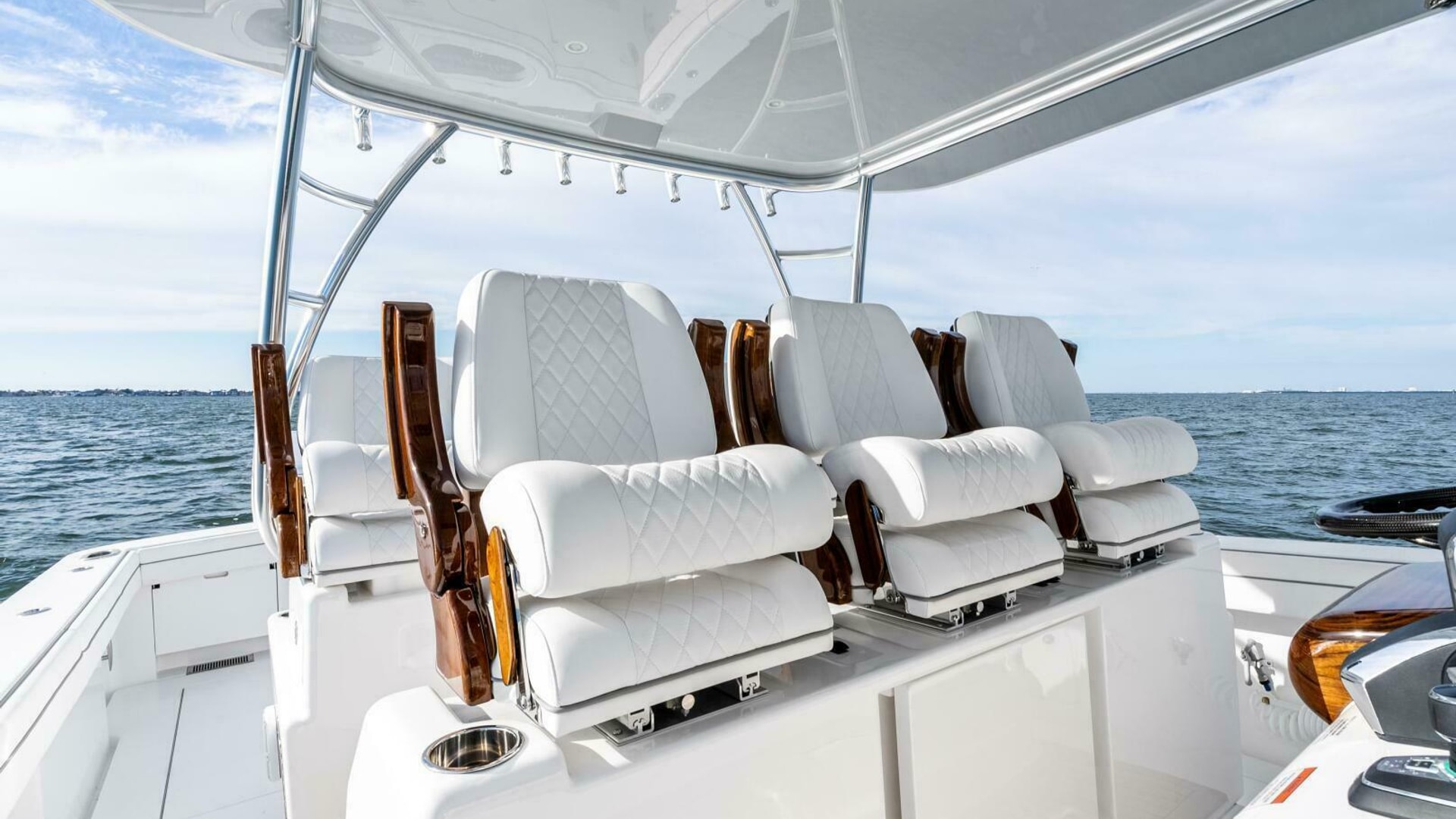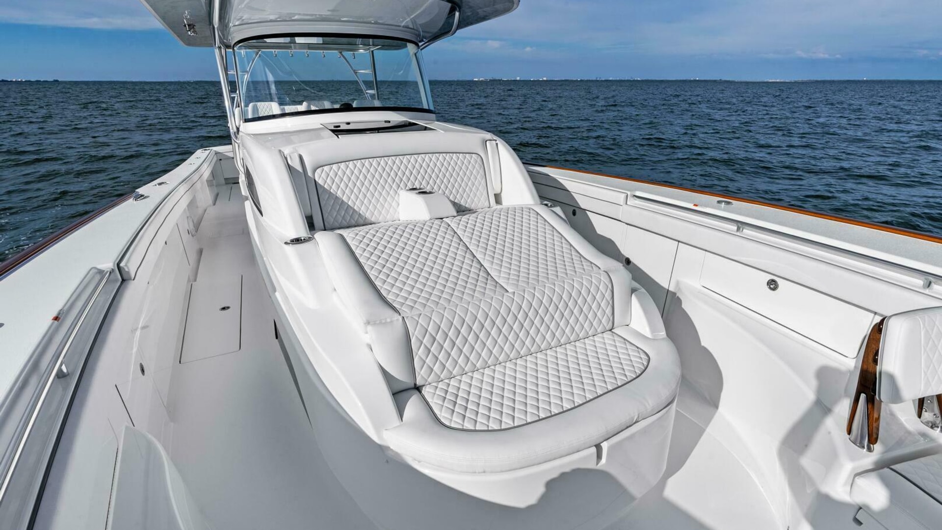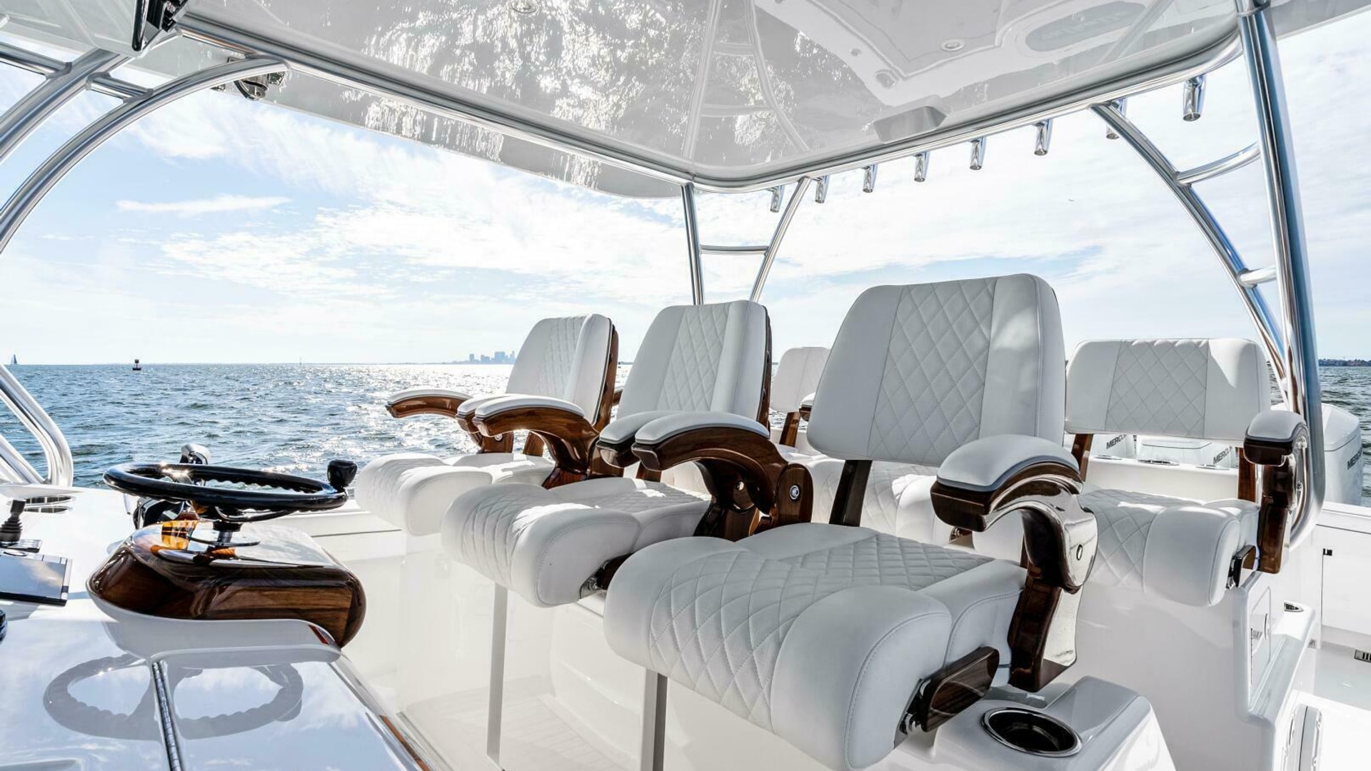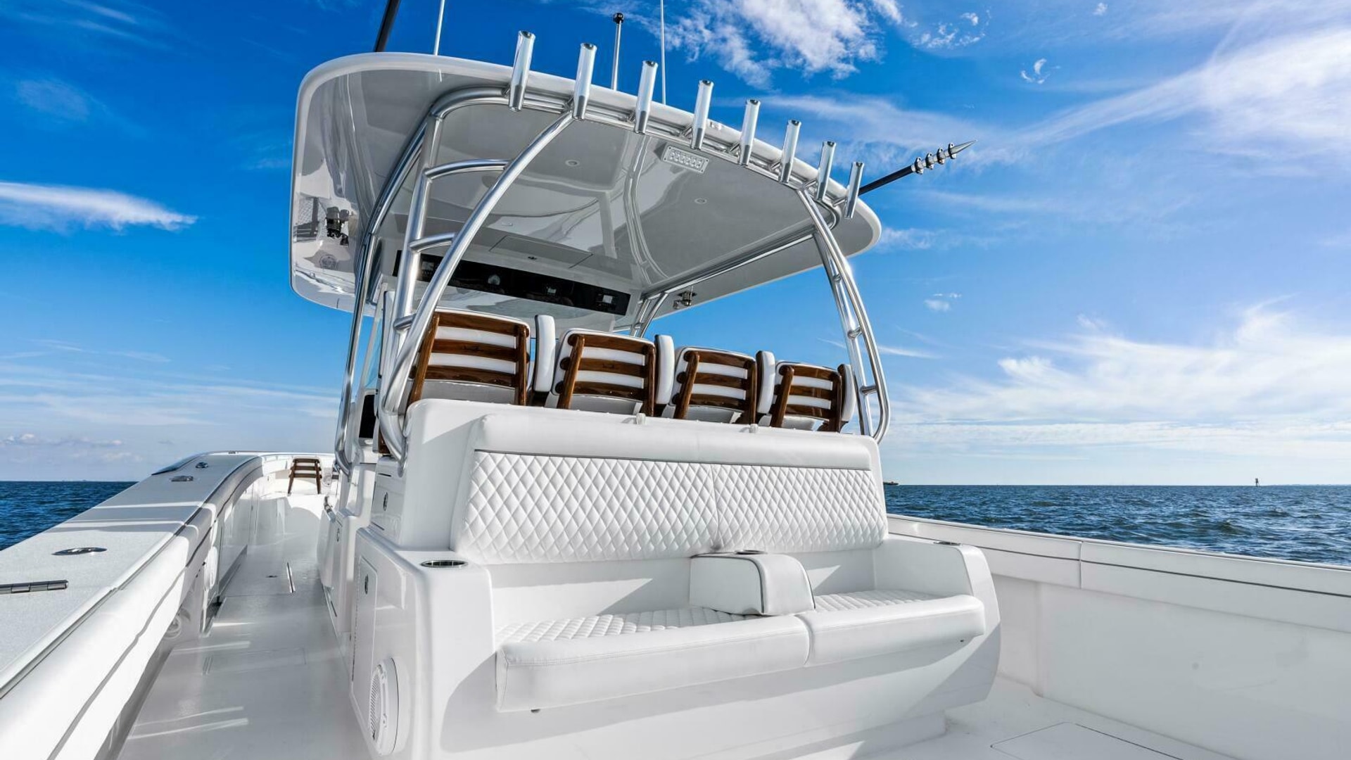• Durable white outdoor upholstery for console lounge, bench seating, coaming bolsters and cockpit cooler seating