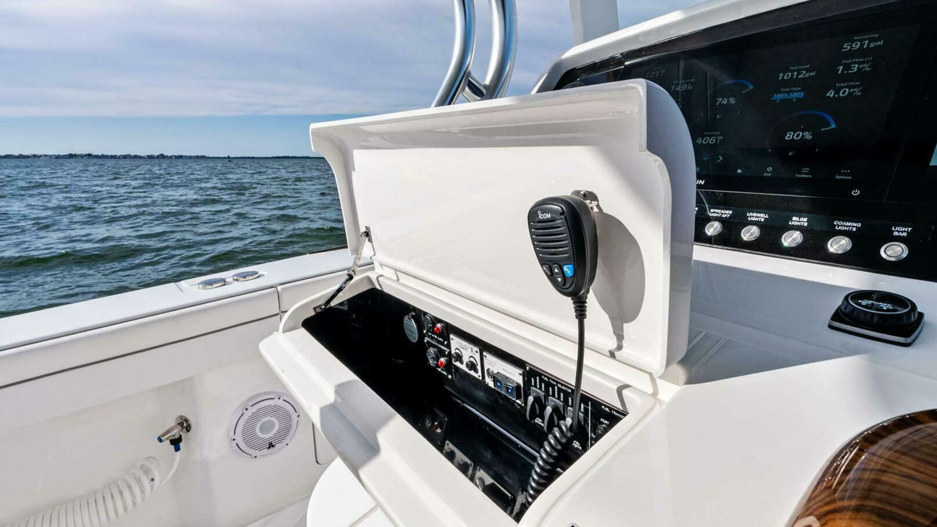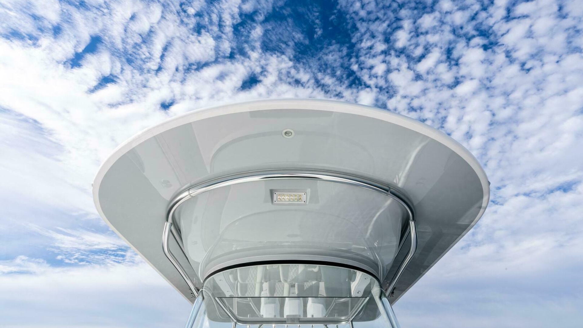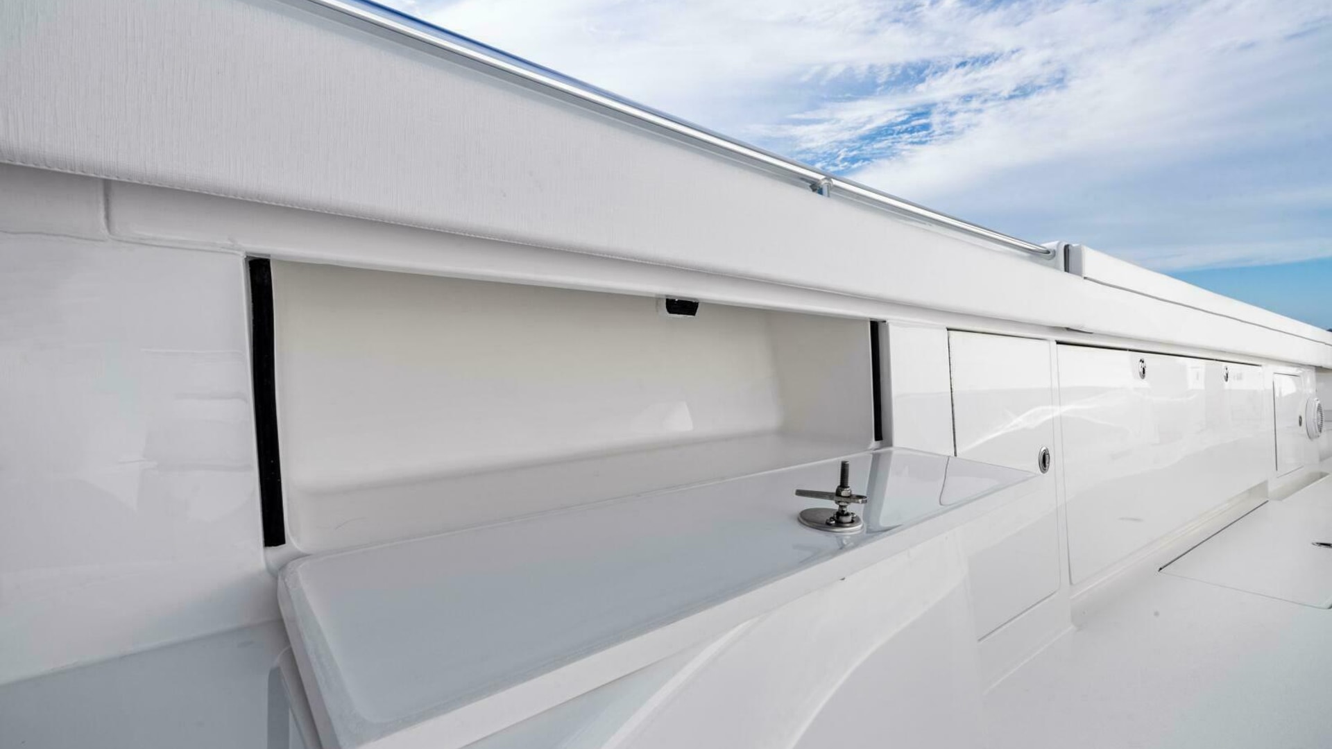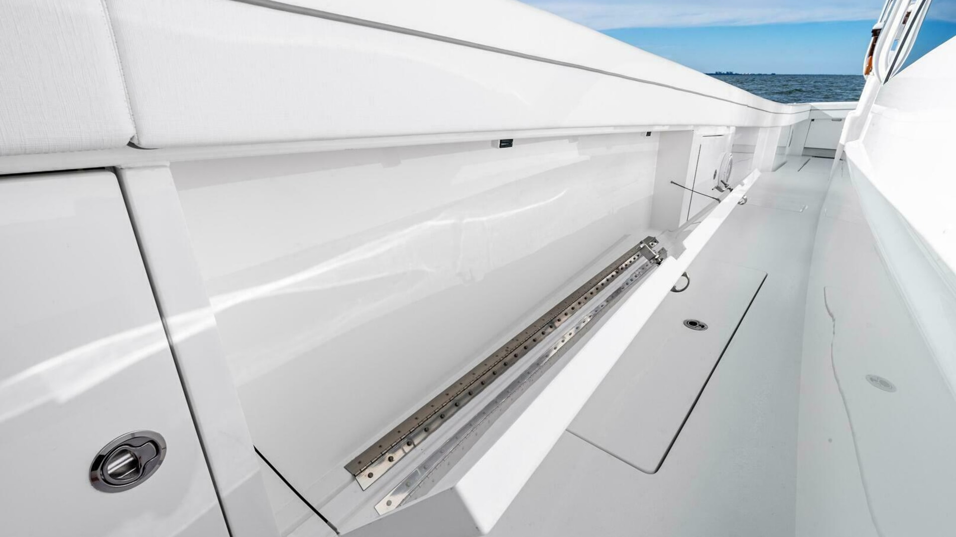 • Durable white outdoor upholstery for console lounge, bench seating, coaming bolsters and cockpit cooler seating
