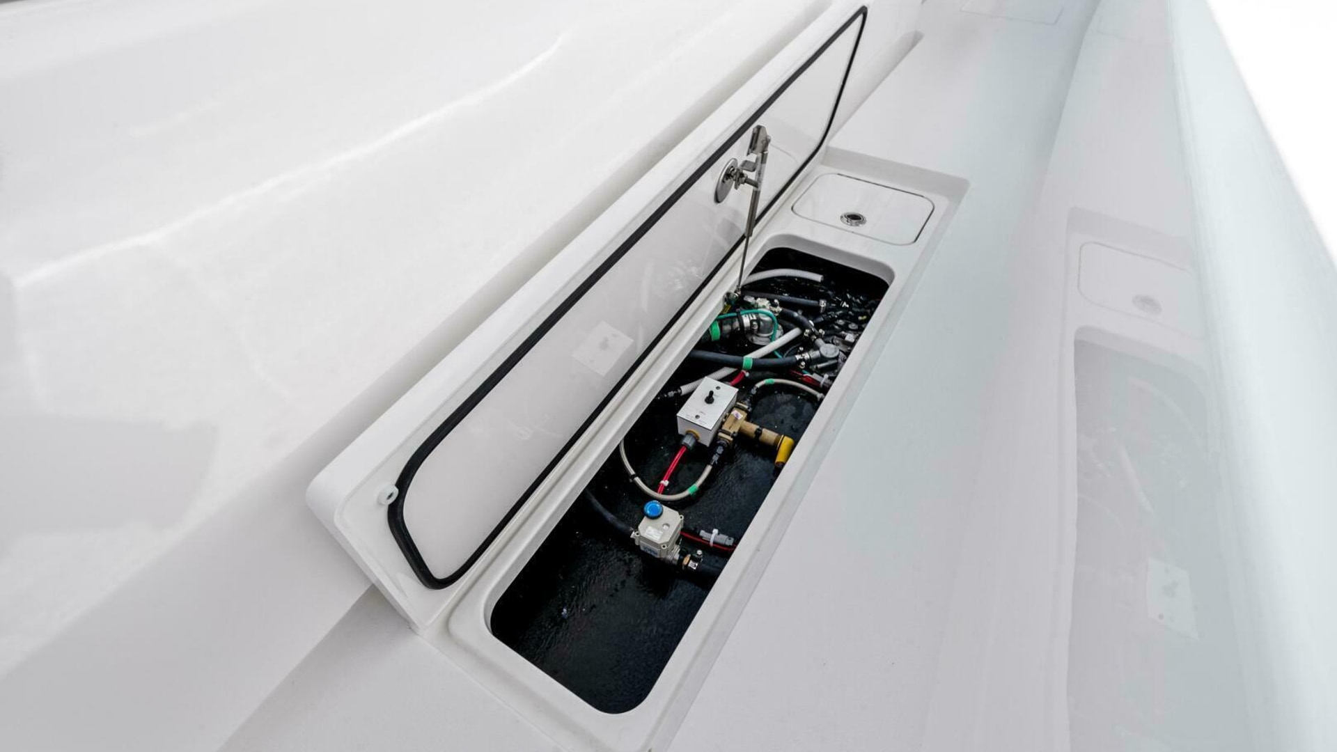 • Hooker sea chest live well system with high speed pickup and single 4500 variable speed pump with control knob at helm