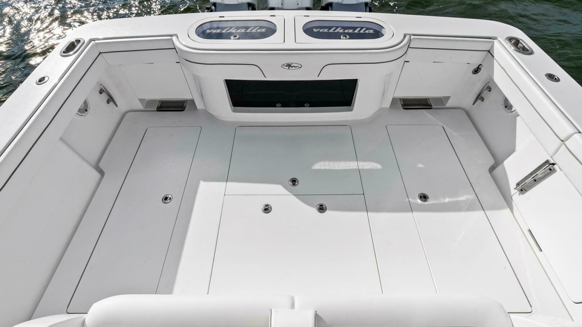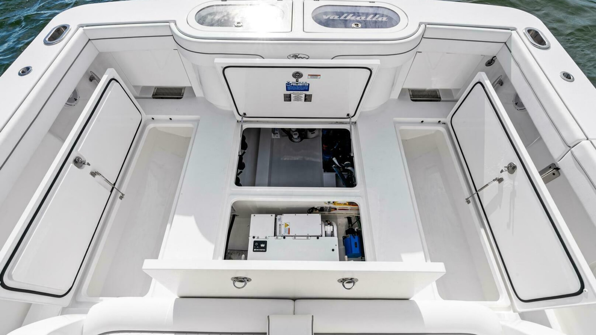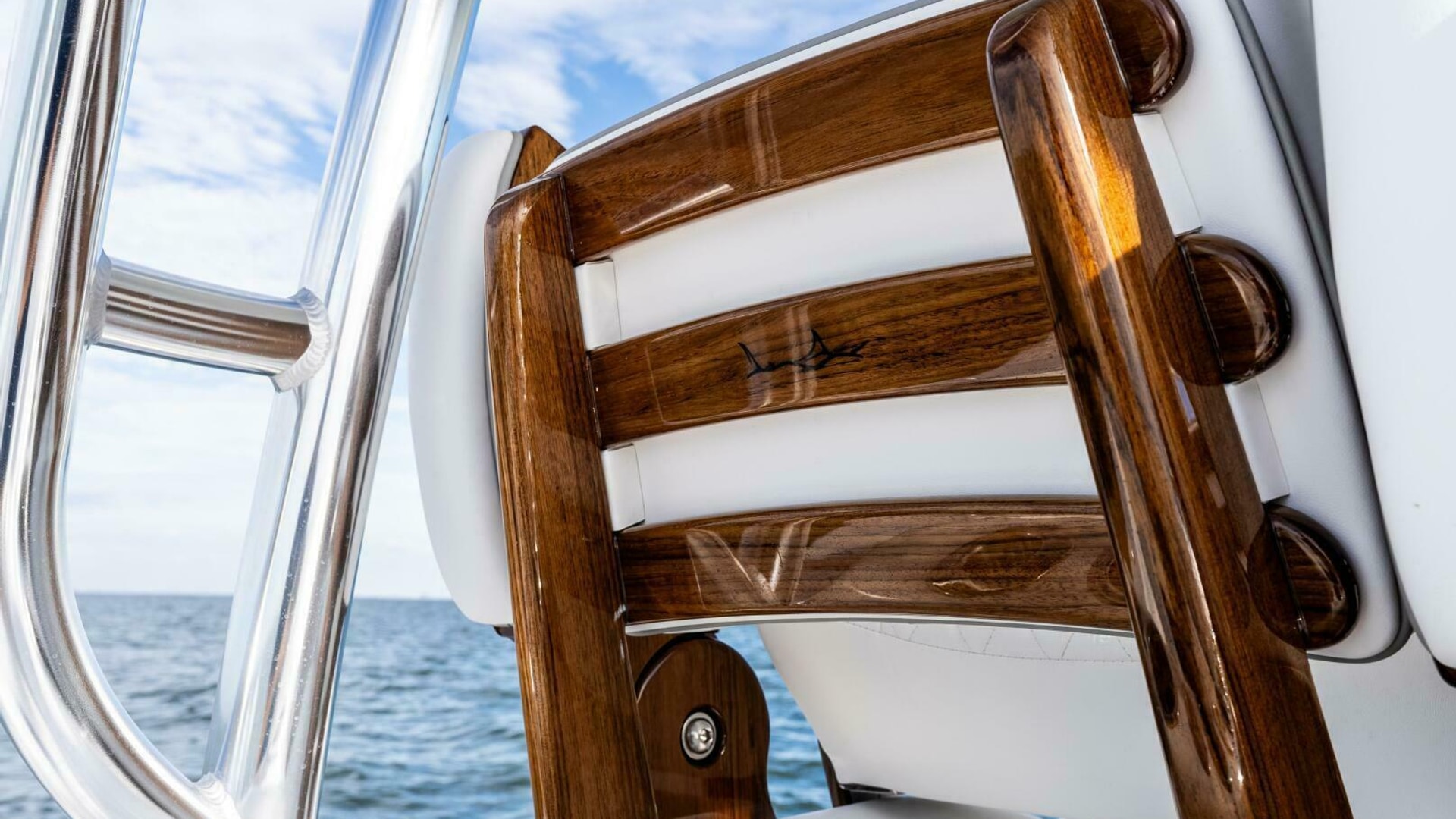 The V-46 possesses the same signature design traits (S-shaped sheer, doubles chines, tumblehome transom bustle), aesthetic enhancements (teak toerail and transom) and 360-degree fishing prowess of the V Series. This Valhalla's significant length (46' 7") and beam (13' 4") allow for a massive console that functions as an air-conditioned cabin. Through the port-side console door, a powder-coated pedestal with teak stair treads leads to an inviting living space.