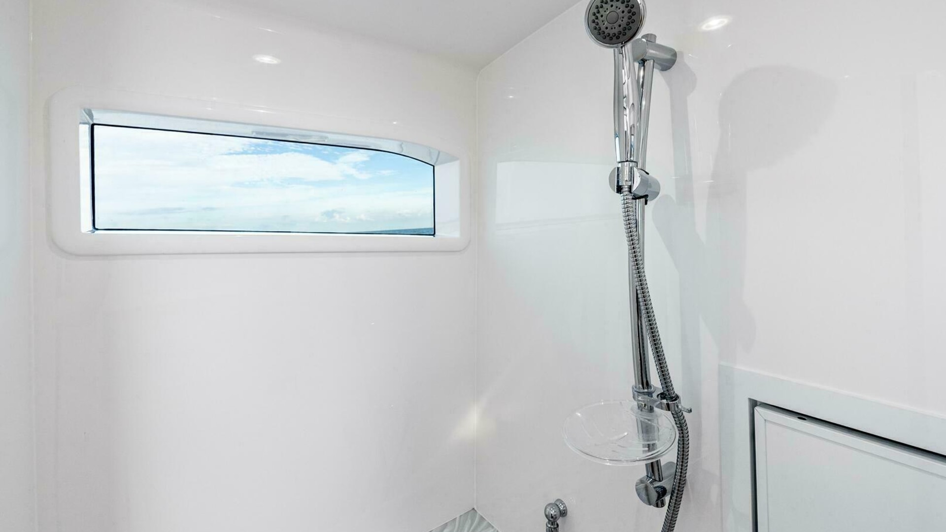 • Head compartment enclosed with molded-in vanity with freshwater sink and faucet, toilet, exhaust fan, and shower head fixture