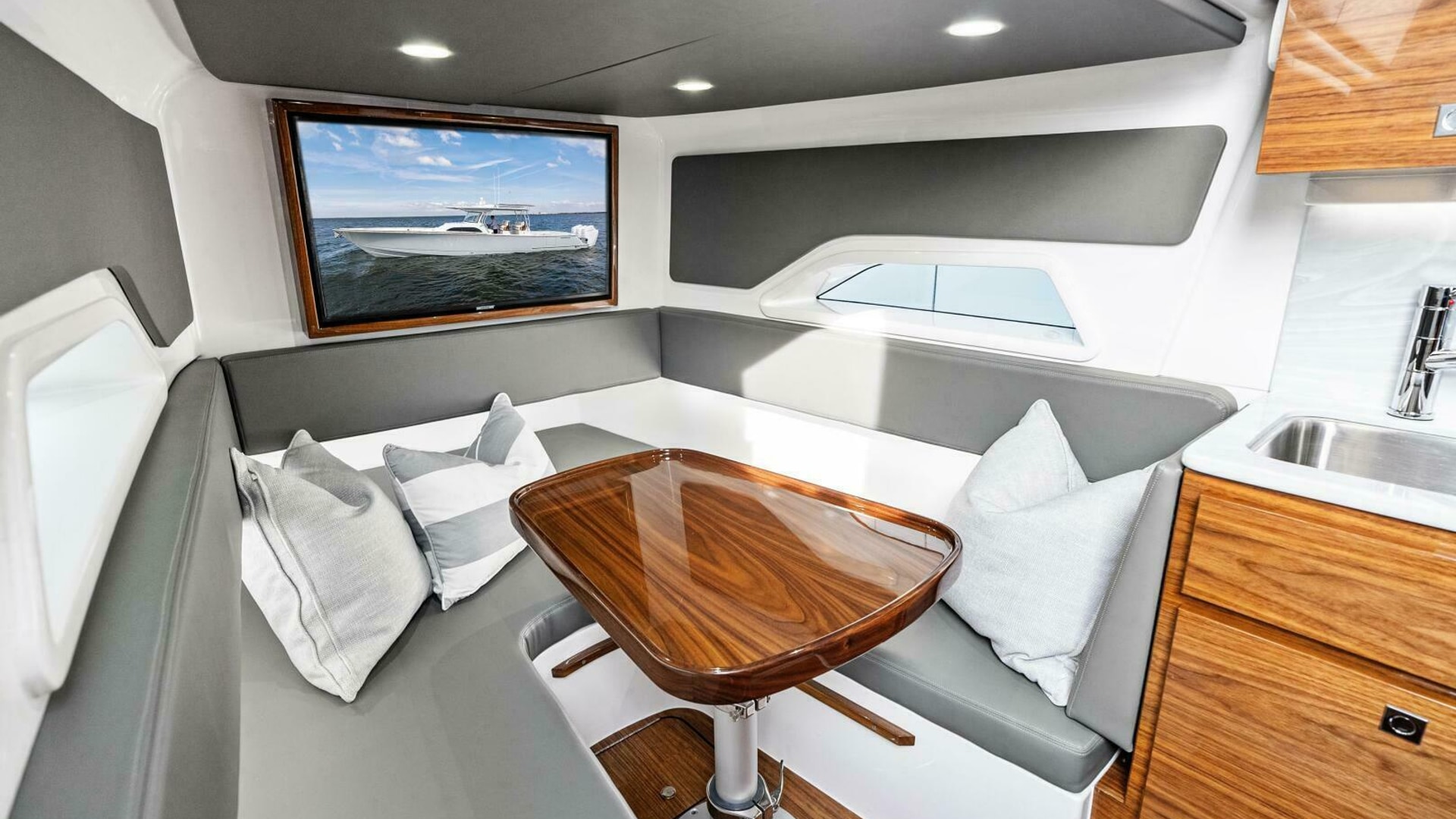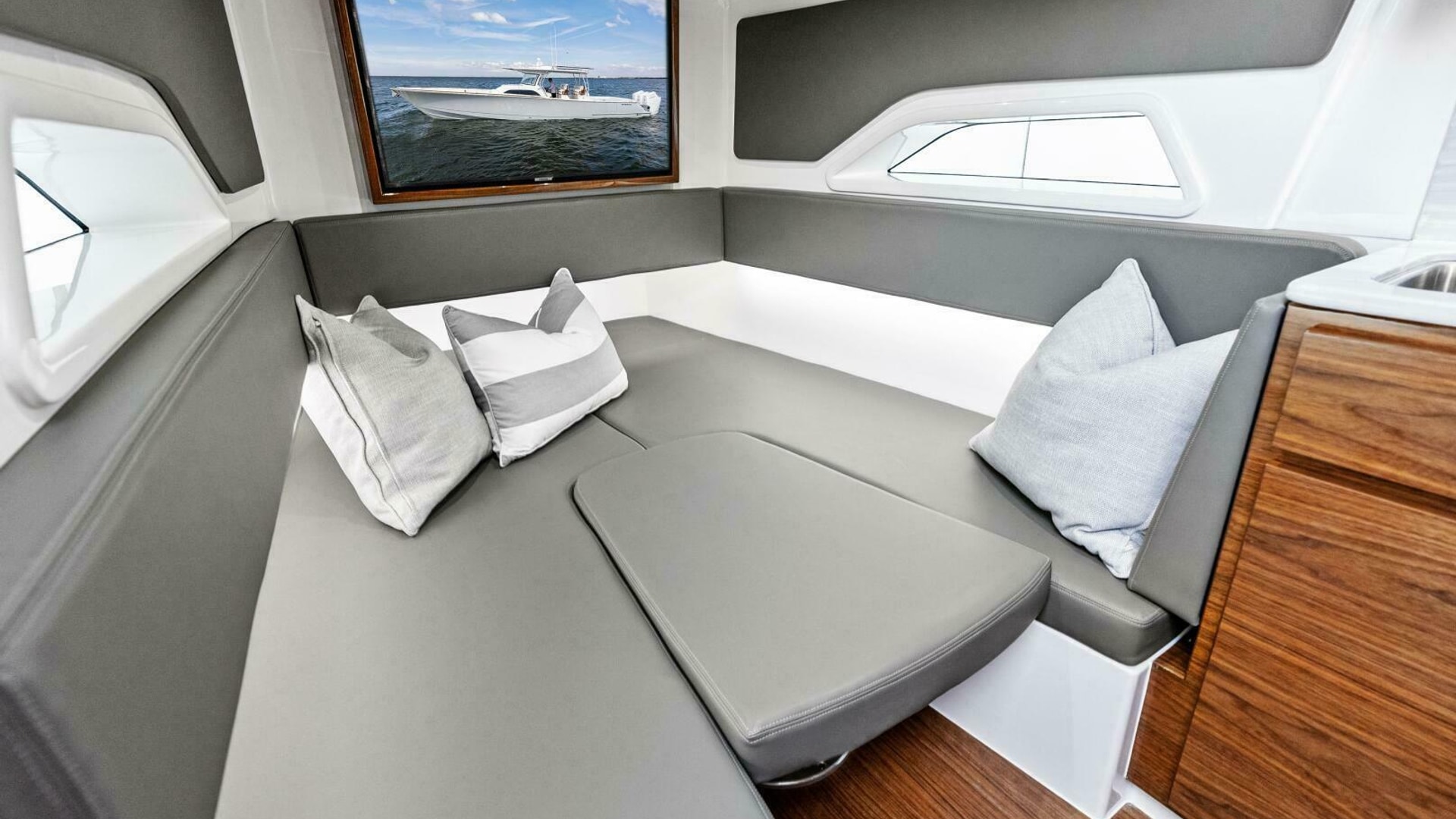 You'll immediately notice the headroom (6' 7") and free-flowing open layout that's filled with natural light flowing through four shapely portlights. Forward, a dinette with U-shaped seating and bolstered backrest surrounds a drop-down table that converts to a queen berth. On the starboard side is the galley, which features a polished Corian countertop, stainless steel sink, brushed nickel and chrome faucet, two-burner recessed stove, refrigerator/freezer, microwave oven and cabinet storage. Directly aft of the galley is the private head with a molded-in vanity with freshwater sink and faucet, toilet and shower.
