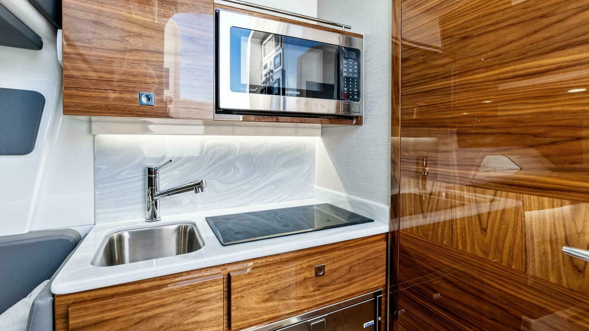 • Galley countertop, solid surface, Wilsonart Whisper White stainless steel sink with brushed nickel and chrome faucet