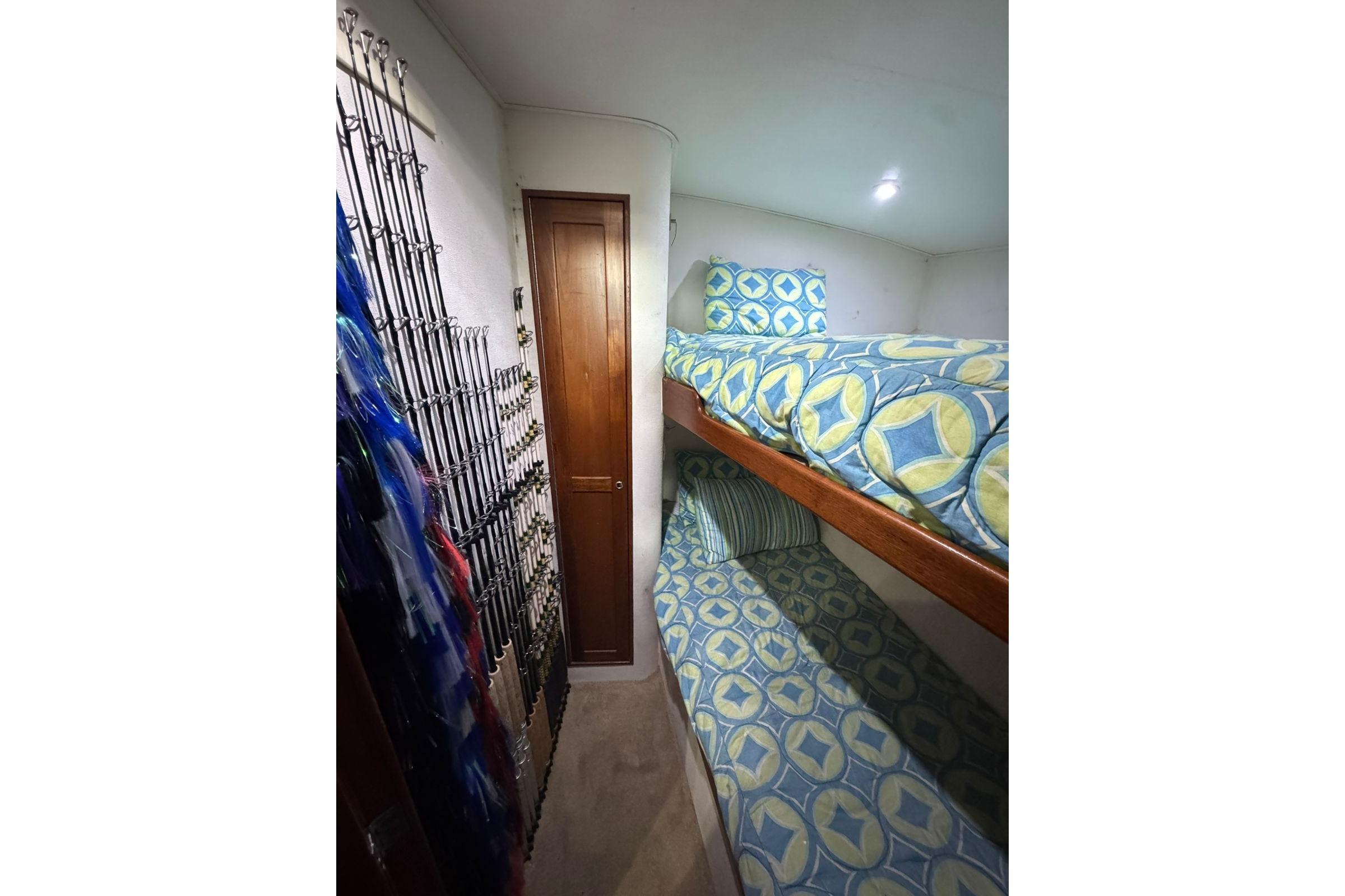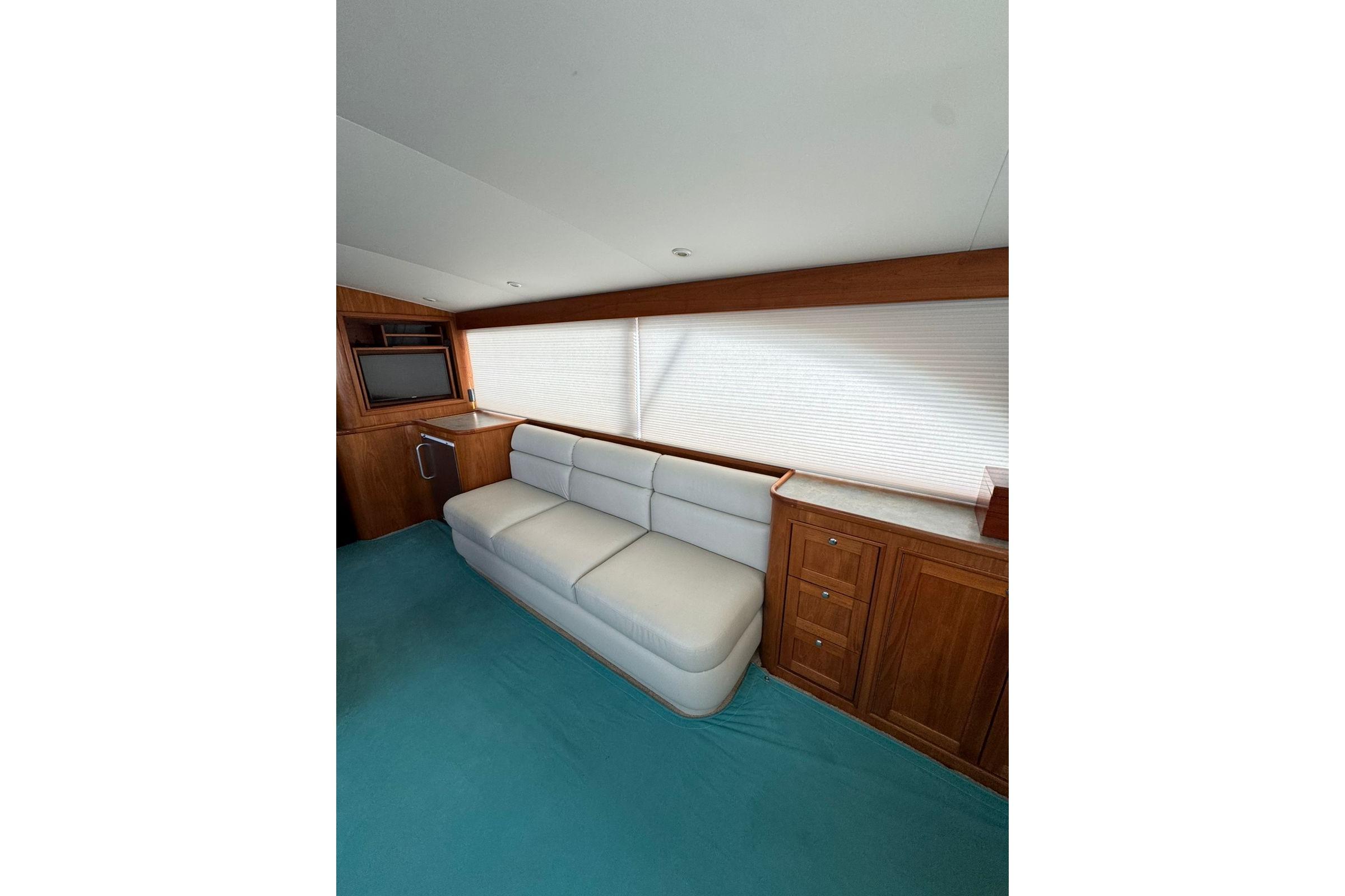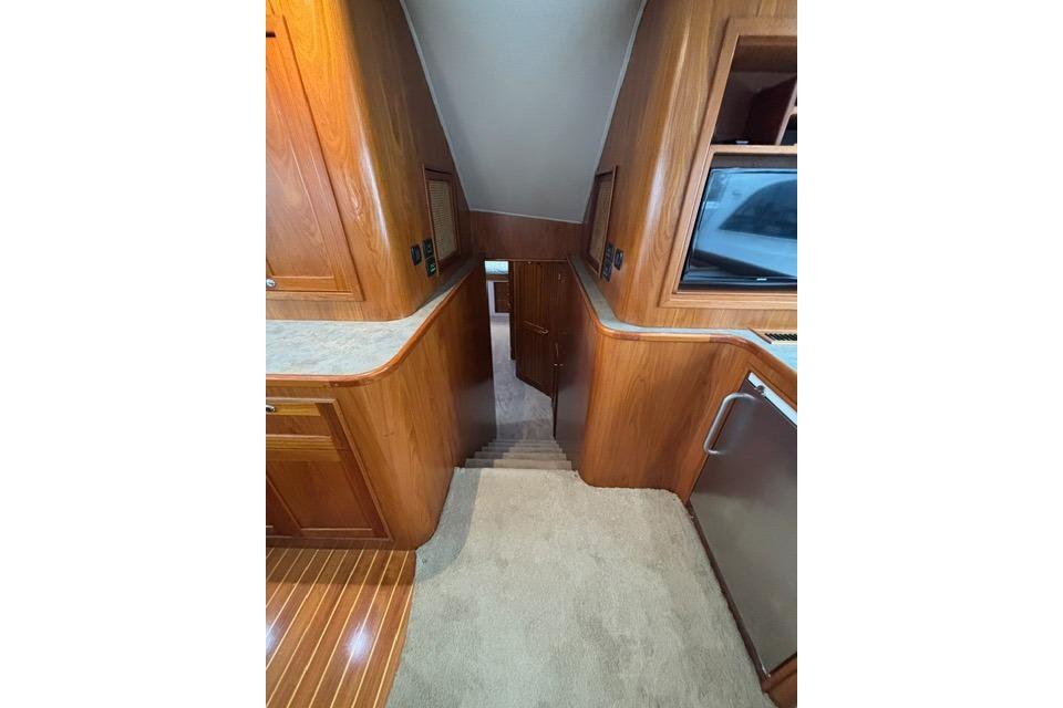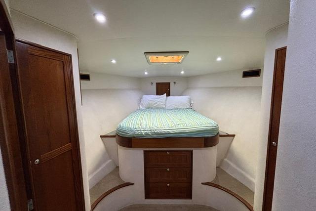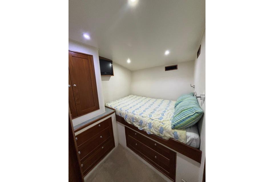 As you board the yacht, the first thing you notice are the beautiful lines, the shape, tumblehome and the attention to detail that Blackwell boats are known for. The teak cockpit deck and rolled cover boards lead to a wide mezzanine step deck, laid out for efficient storage of bait, drinks, ice and fishing equipment as well as easy access to the engine room. The automatic teak salon door is offset to starboard and as you enter the salon you immediately sense that this boat was built with comfort and practicality in mind. With a large L-shaped custom covered couch to port and an 8' linear couch to starboard, there is ample room to lounge about, watch TV or listen to the sound system while underway. To port forward is the galley, well appointed with all of the necessary storage, fixtures and appliances for day trips or travel. Teak trim, valances and cabinetry, custom laminate countertops with sea rails and window treatments round out a comfortable, ergonomic design. Down the teak veneered companionway to starboard is a roomy day head with teak and holly sole and shower. Forward of that to starboard is the crew's quarters with stacked bunks, storage drawers, hanging lockers and TV. The Master V-berth boasts a large stepped bed, it's own head with teak and holly sole and shower, storage drawers, hanging lockers and TV. Back to port, the guest stateroom offers a double bed set up with storage drawers, cabinets, hanging locker and TV. All rooms have lockable teak doors, teak trim, carpet, recessed lighting and soft tone textured wallpaper.