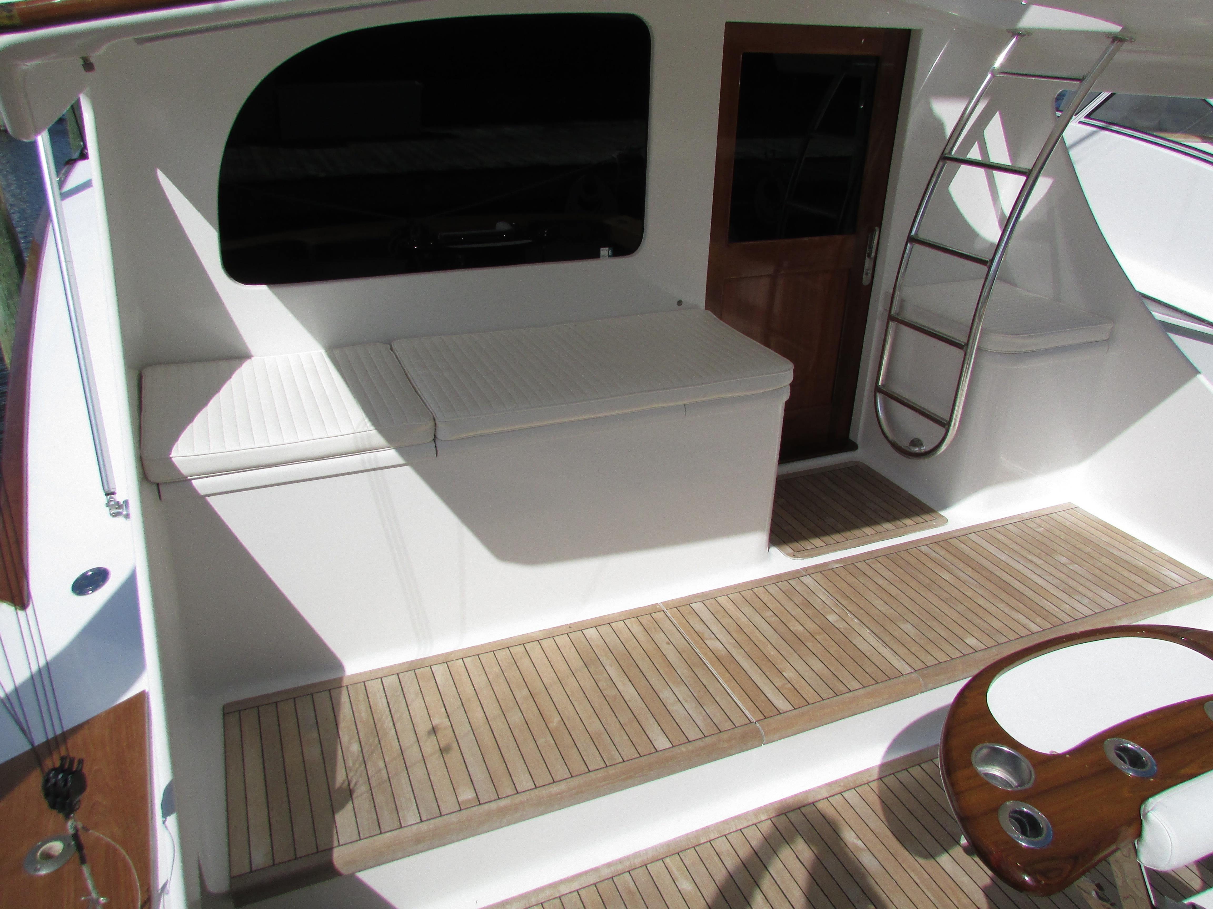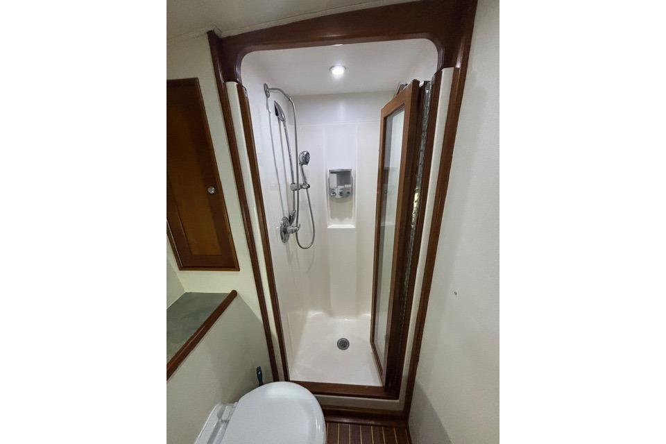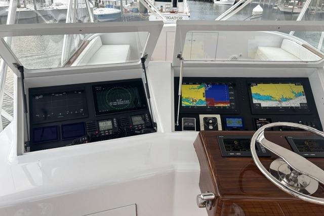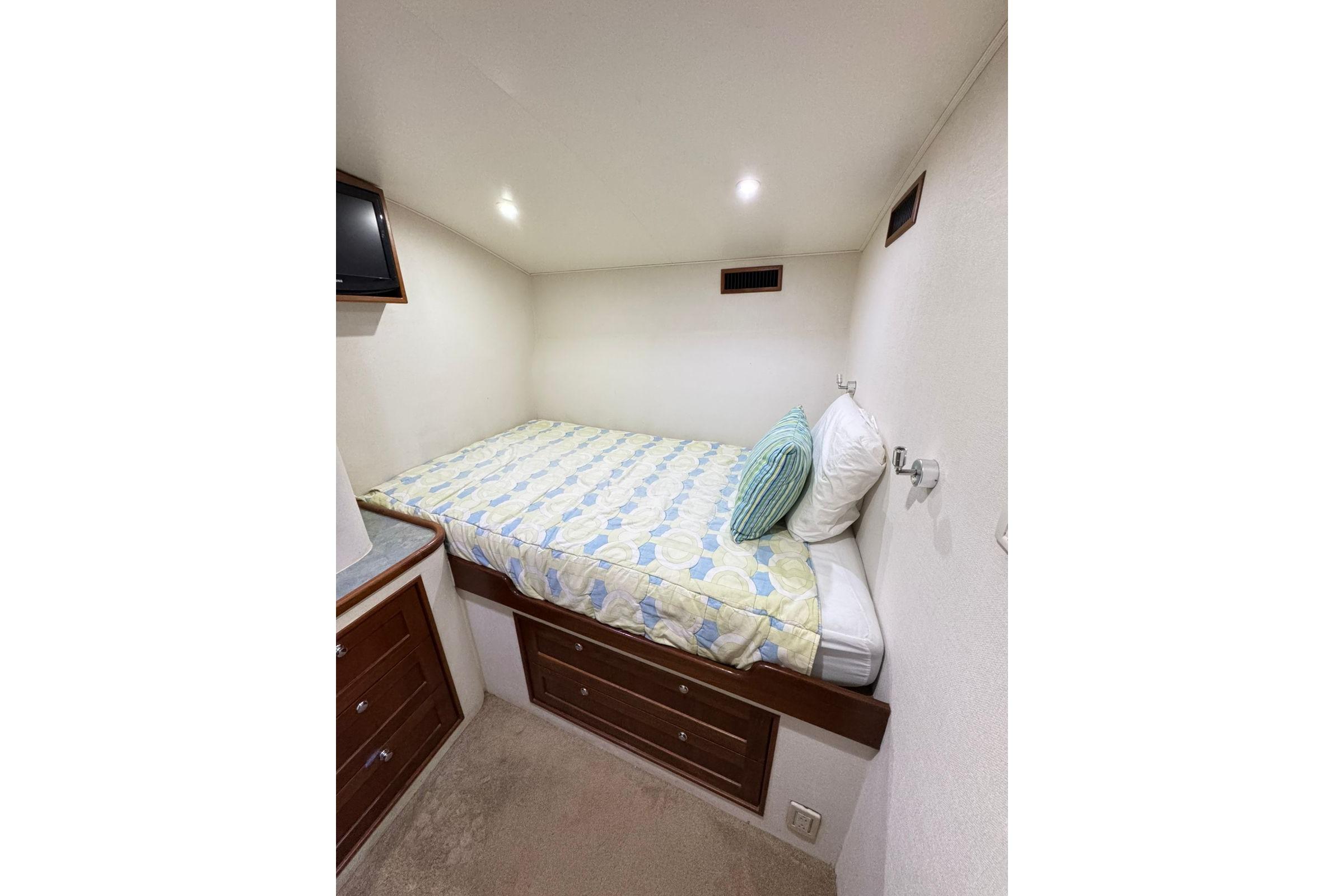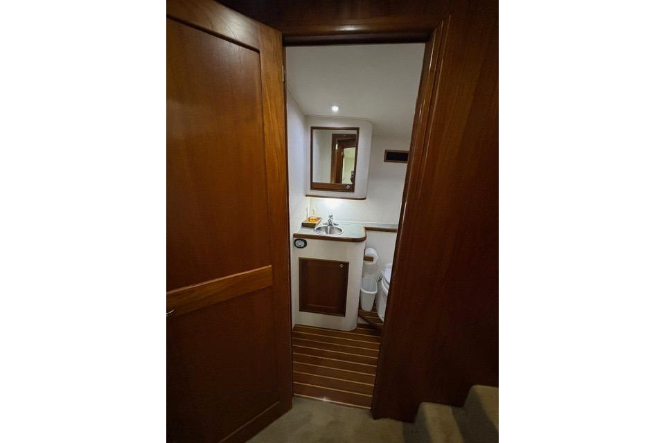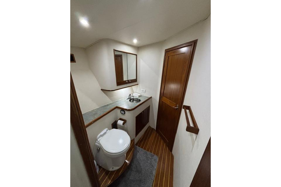 As you board the yacht, the first thing you notice are the beautiful lines, the shape, tumblehome and the attention to detail that Blackwell boats are known for. The teak cockpit deck and rolled cover boards lead to a wide mezzanine step deck, laid out for efficient storage of bait, drinks, ice and fishing equipment as well as easy access to the engine room. The automatic teak salon door is offset to starboard and as you enter the salon you immediately sense that this boat was built with comfort and practicality in mind. With a large L-shaped custom covered couch to port and an 8' linear couch to starboard, there is ample room to lounge about, watch TV or listen to the sound system while underway. To port forward is the galley, well appointed with all of the necessary storage, fixtures and appliances for day trips or travel. Teak trim, valances and cabinetry, custom laminate countertops with sea rails and window treatments round out a comfortable, ergonomic design. Down the teak veneered companionway to starboard is a roomy day head with teak and holly sole and shower. Forward of that to starboard is the crew's quarters with stacked bunks, storage drawers, hanging lockers and TV. The Master V-berth boasts a large stepped bed, it's own head with teak and holly sole and shower, storage drawers, hanging lockers and TV. Back to port, the guest stateroom offers a double bed set up with storage drawers, cabinets, hanging locker and TV. All rooms have lockable teak doors, teak trim, carpet, recessed lighting and soft tone textured wallpaper.
