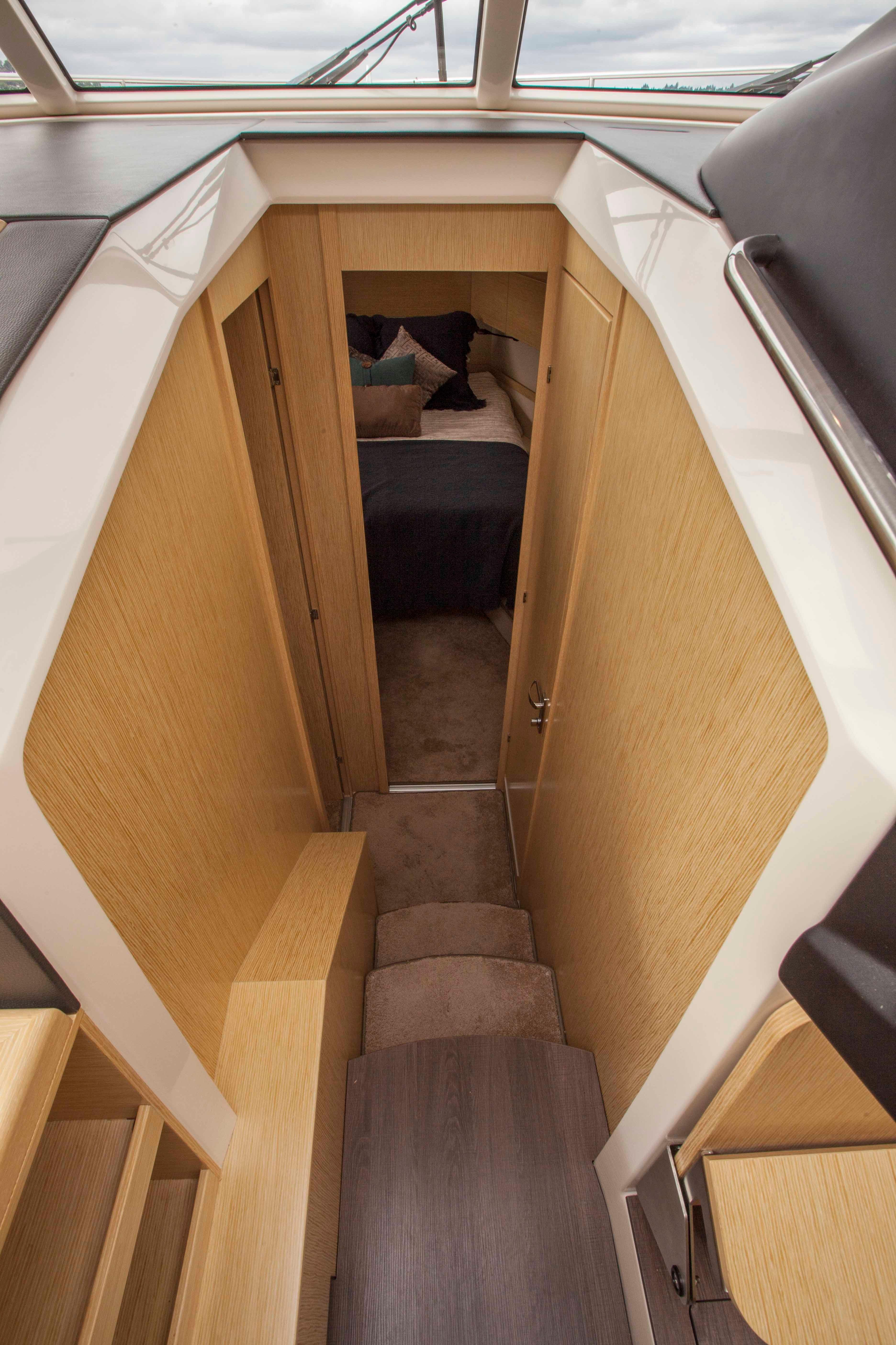 The Greenline 40 Hybrid redefines modern boating by offering twin hybrid Volvo diesel power combined with a standard 1.8 KW powerful solar array and a 40 KW lithium polymer battery bank to keep you off the grid and out on the water longer with little need to go to a marina except for occasional provisioning. The Greenline’s unique power system incorporates an integral inline electric motor/generator with twin fuel sipping 5-cylinder 220 hp Volvo diesels that cruise easily at 14 knots with a top speed of 18.5 knots. This E engine is a collaboration between Volvo and Greenline. From its inception by J&J Design, the Greenline 40 was created as a super displacement low drag hybrid hull to offer unapparelled efficiency on the water (about 2 nautical miles per gallon at 9 knots). The hull includes twin stabilizer fins that deliver roll stability, tracking ability and protect the underwater drive resulting in an extremely seaworthy hull certified to Class “B” ocean conditions.