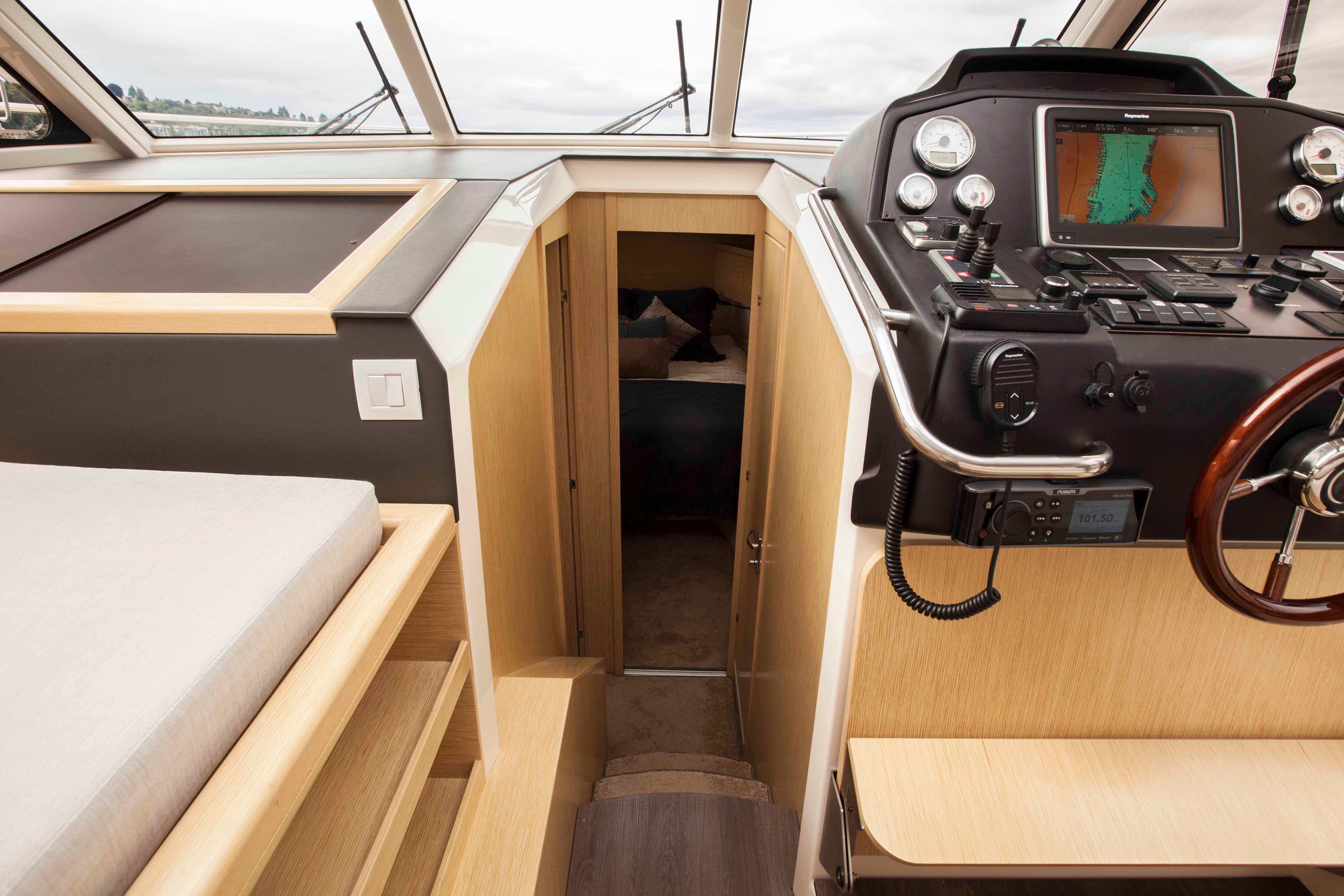 This Greenline 40 has an Oak interior and is fully equipped with all the modern conveniences you would expect like, bow and stern thrusters, reverse cycle air conditioning, forced air heat, induction cooking, a free-standing refrigerator with separate freezer and a full complement of the latest Raymarine Axiom touch screen navigation electronics. For entertainment, she has a large pop up TV, and a powerful Fusion stereo system.